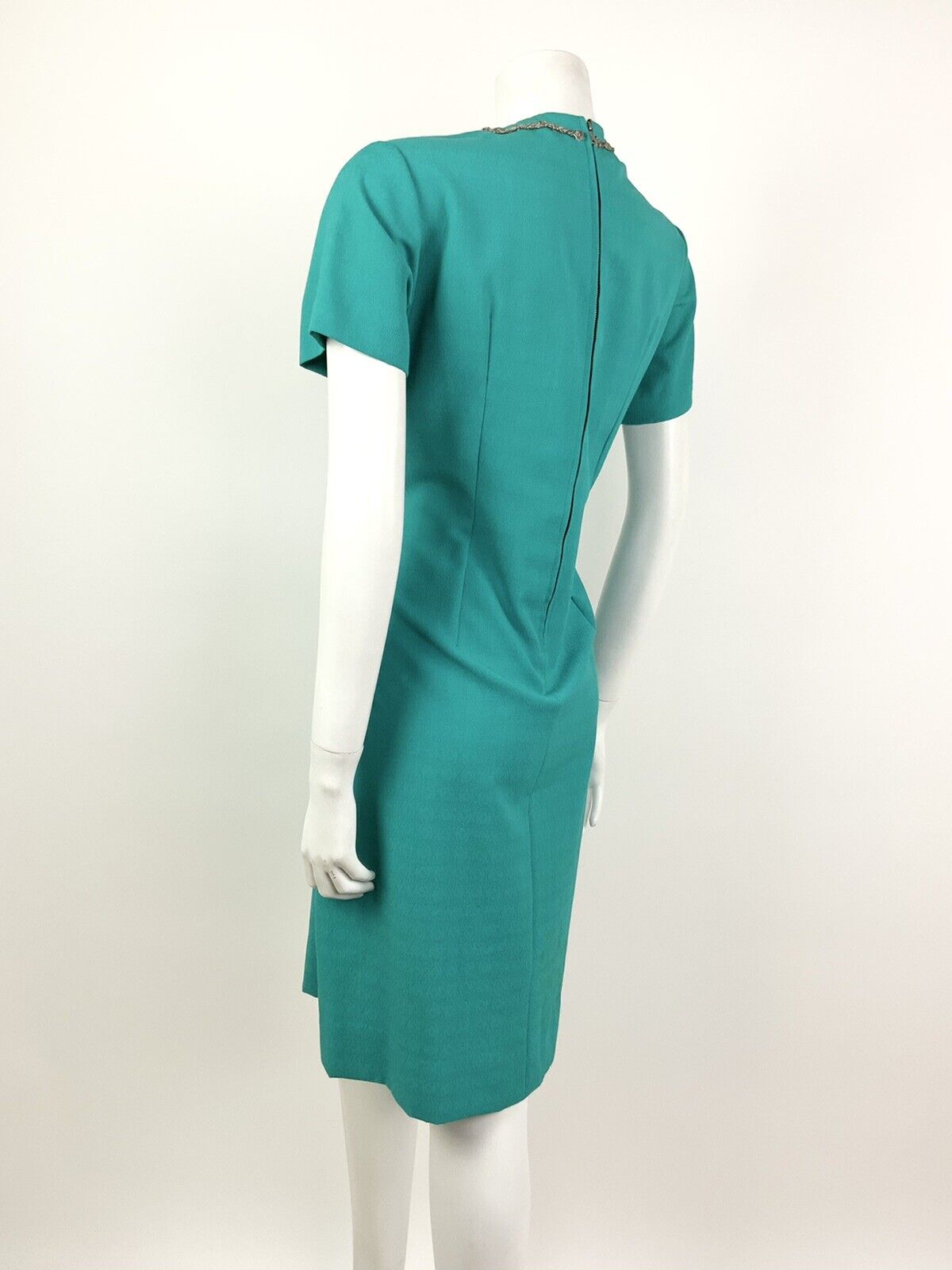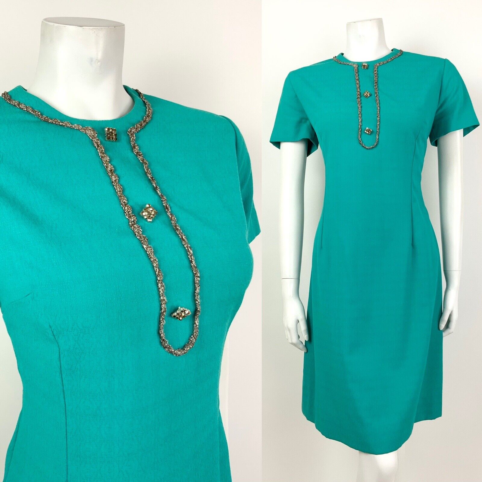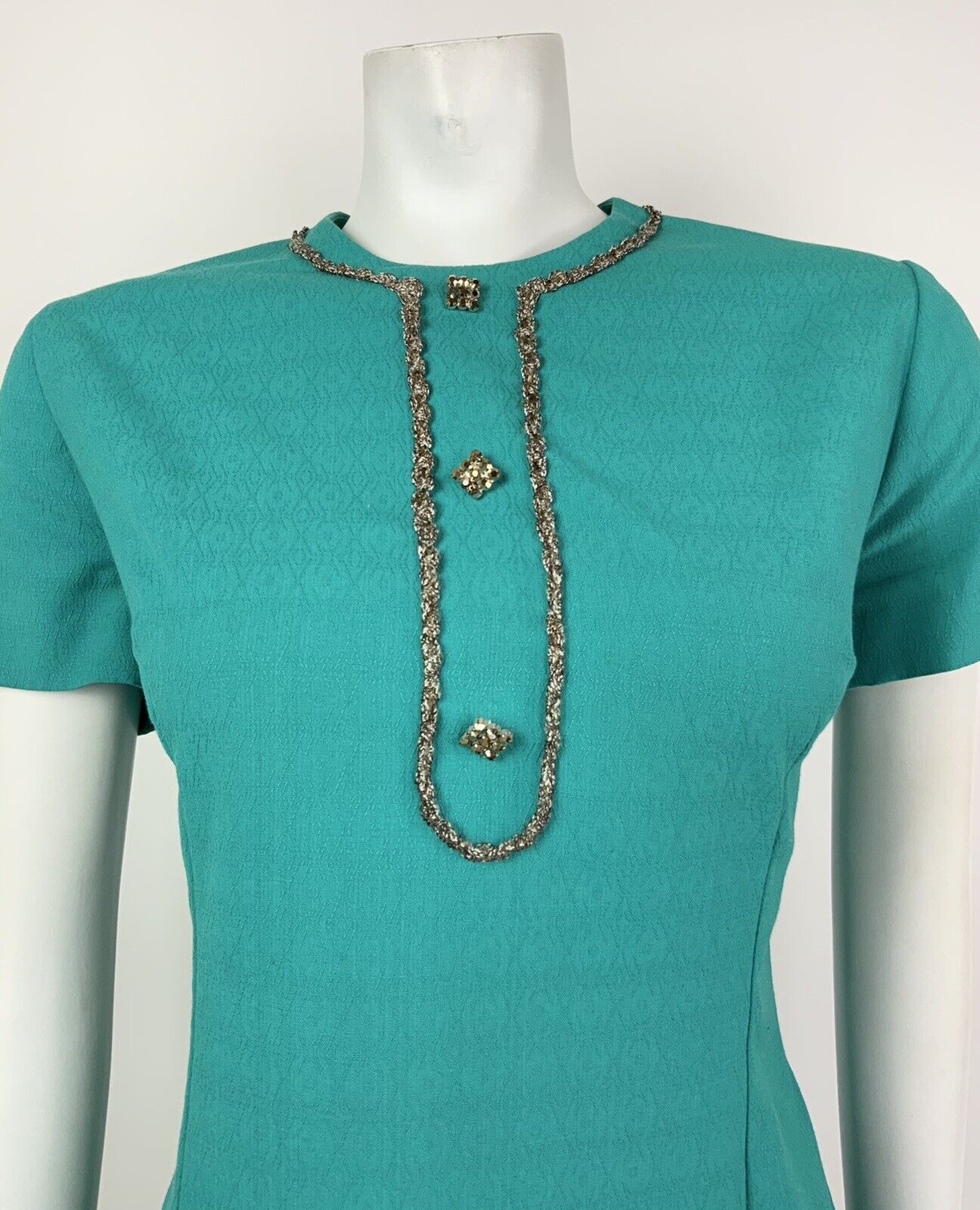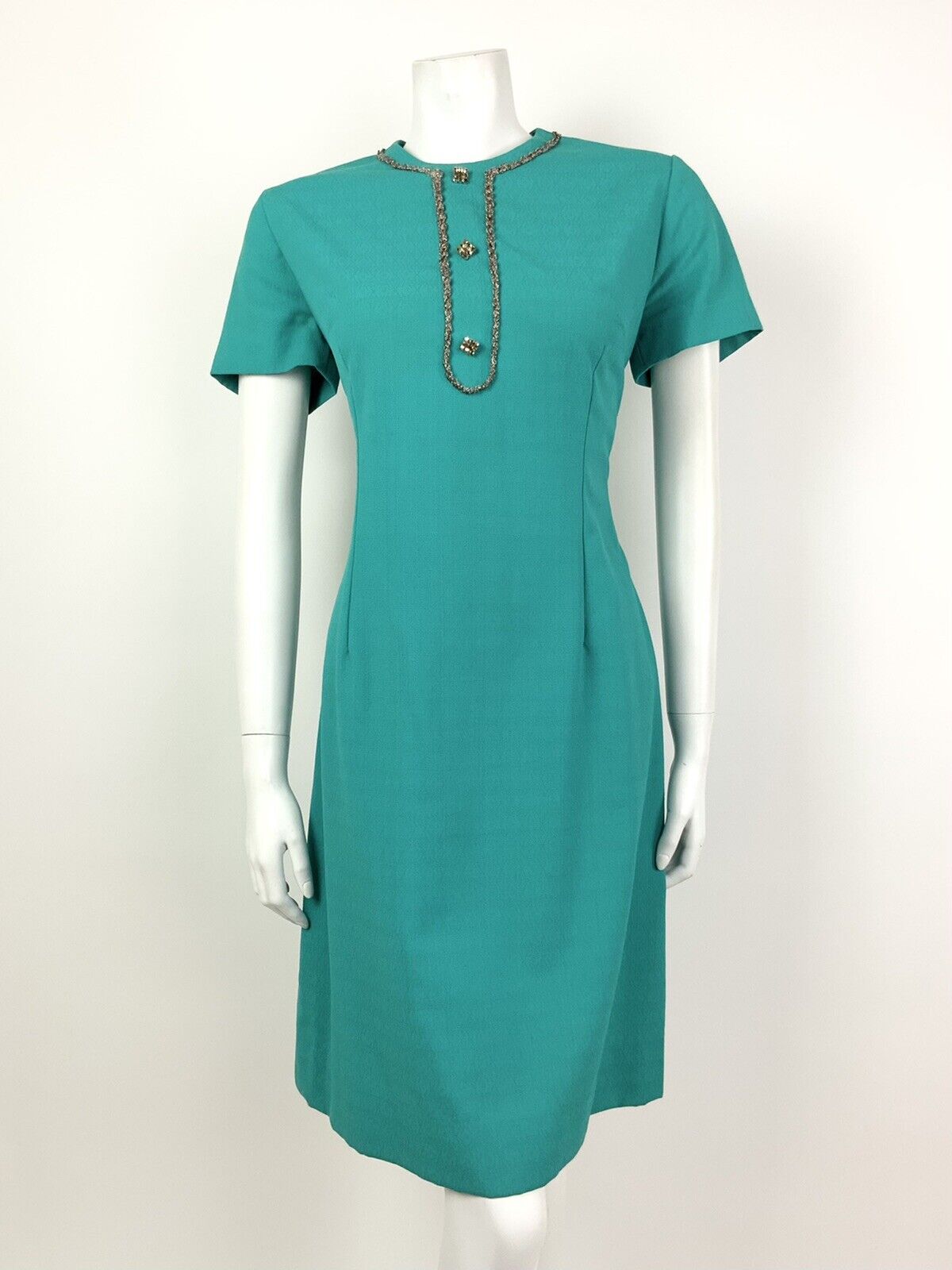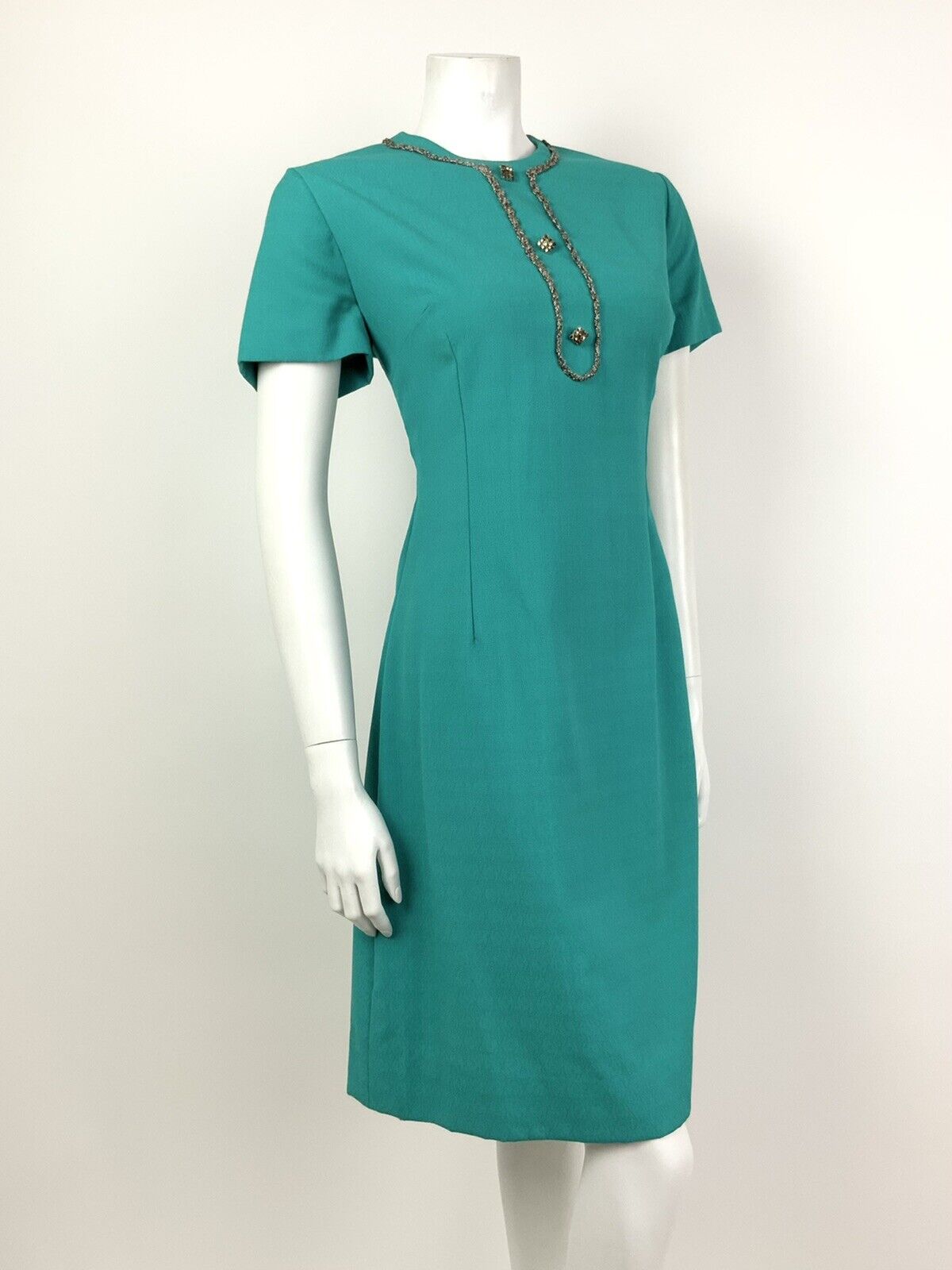 VTG 60s 70s GREEN TEAL BRONZE SILVER DIAMANTE BIRDS-EYE MOD DRESS 14 16