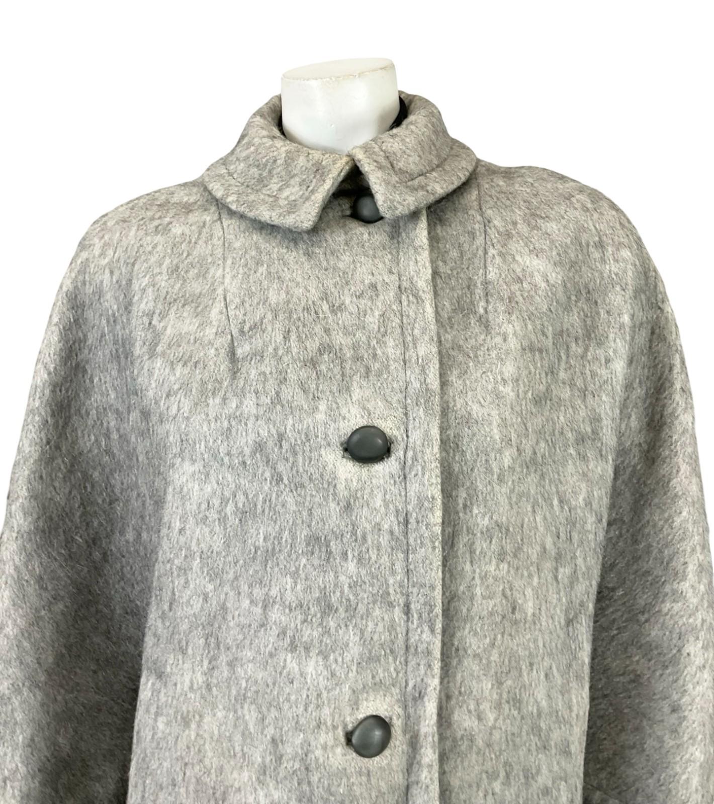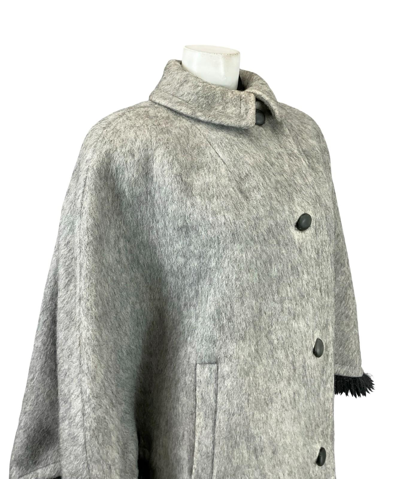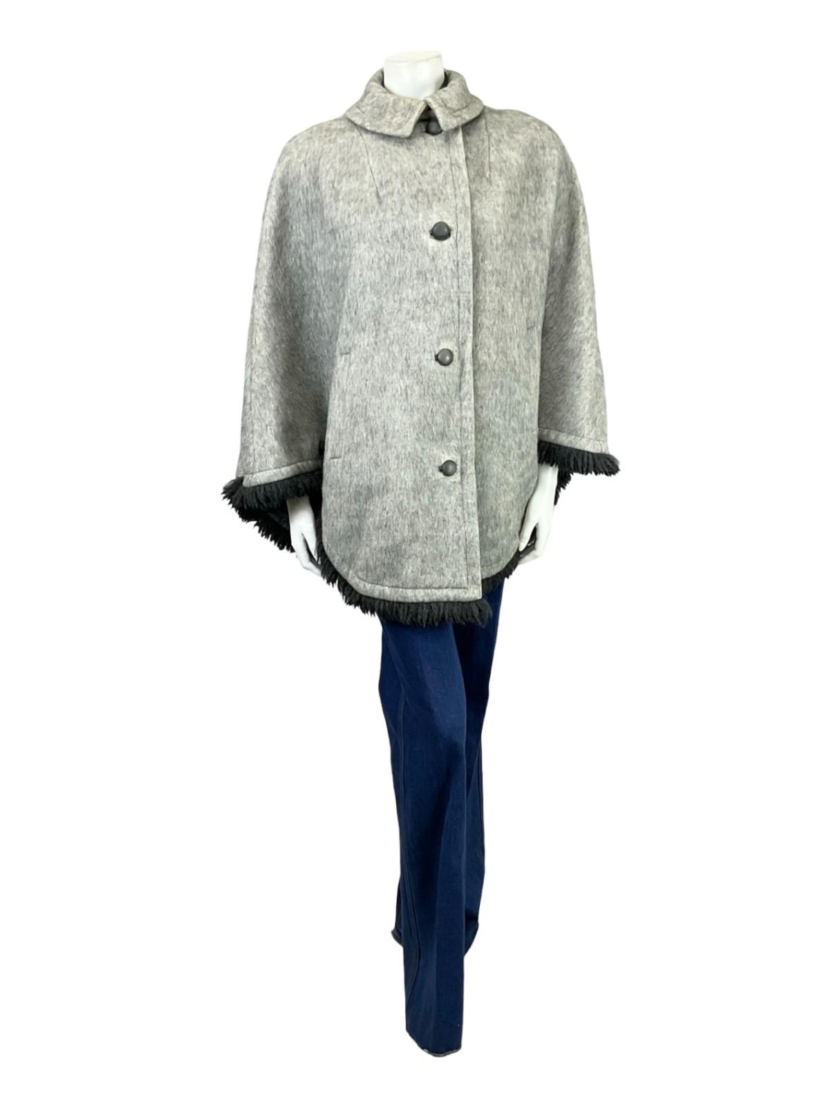 This is a cute 60s 70s cape made from a synthetic wool imitation grey fabric, with black fringe. The cape has a basic collar, two pockets at the front, and buttons down the centre via 4 grey round buttons. There is a smooth synthetic lining, although no material labels to identify composition.