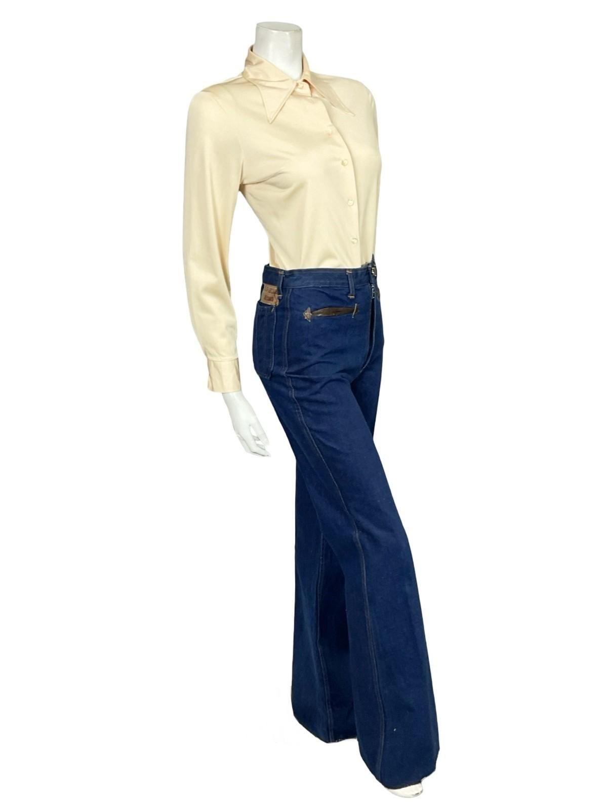 This is a classic 60s 70s Japanese long sleeve dagger collar shirt, perfect for having a base to create outfits with. This shirt is made from a cream synthetic material, although doesn't specify which, and buttons down the front via 7 pearlescent buttons, with two on either cuff.