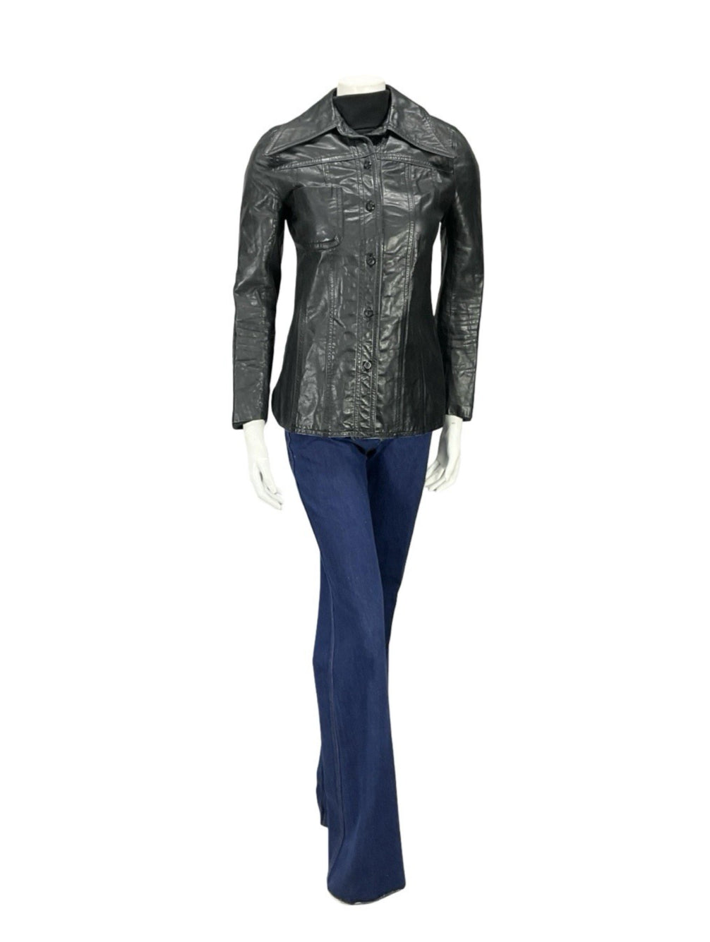 VTG 60S 70S JET BLACK LEATHER MOD DAGGER COLLAR BUTTON UP JACKET 8