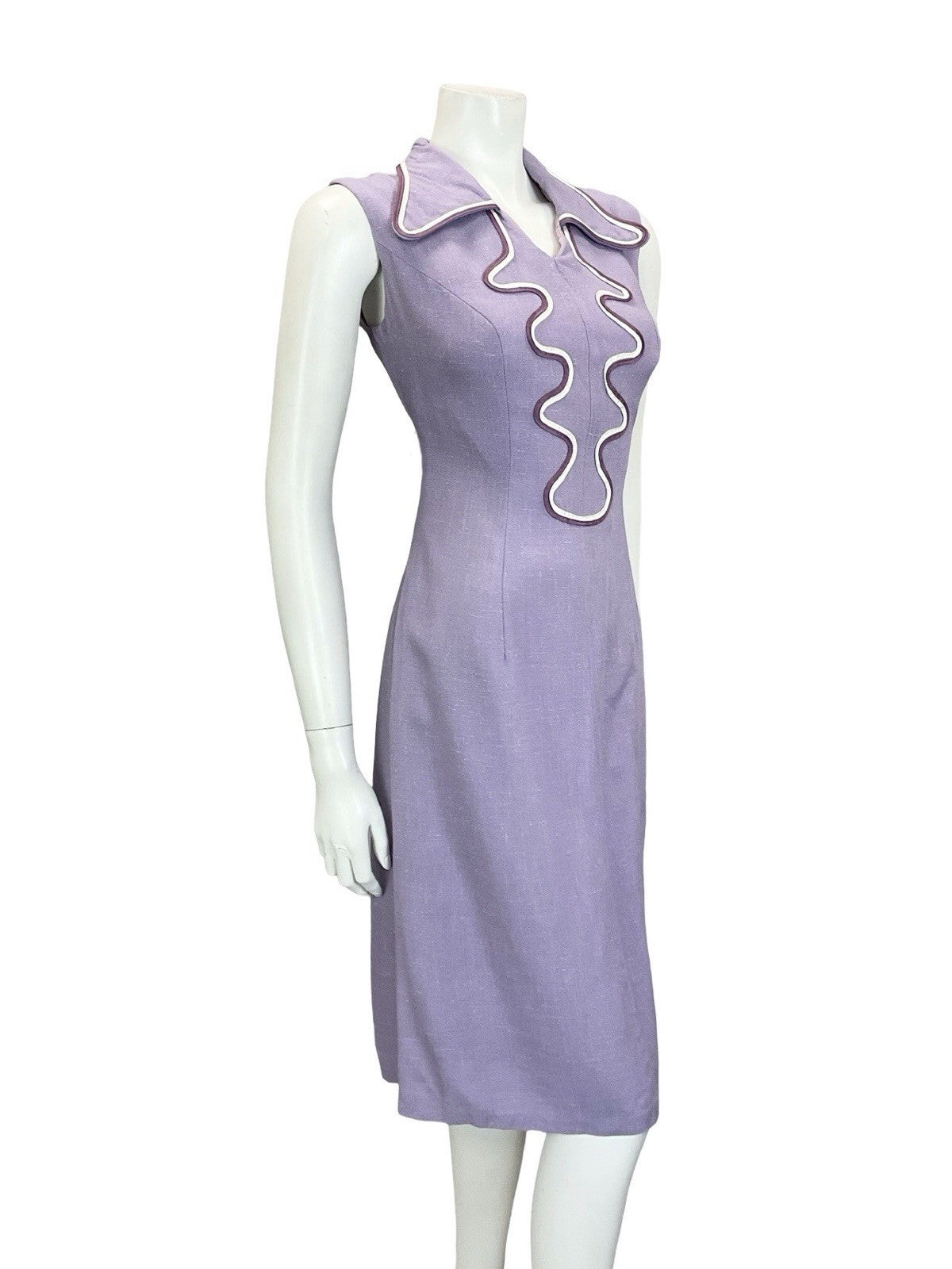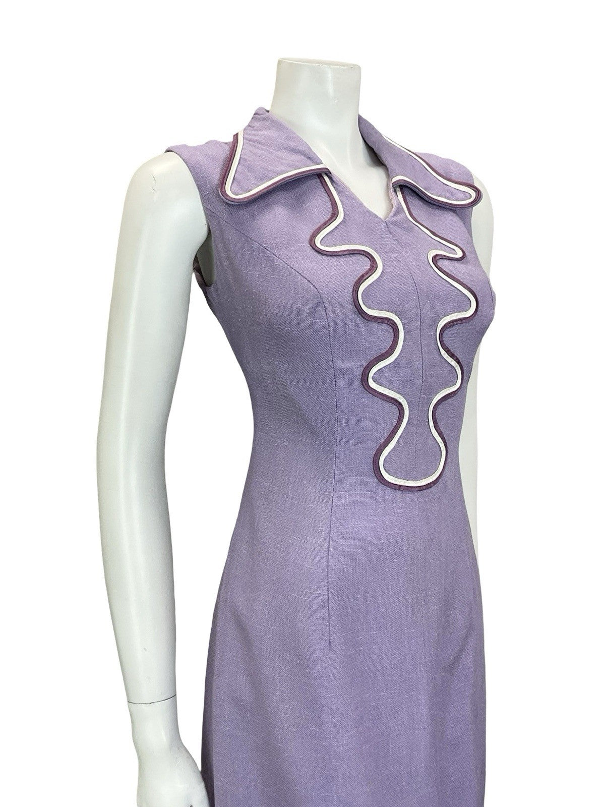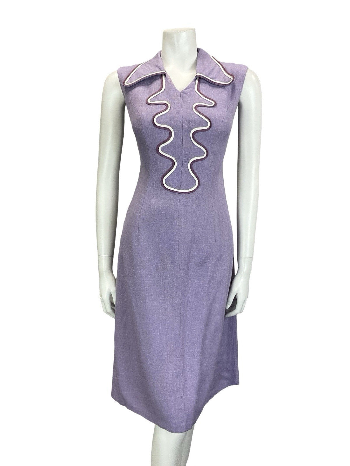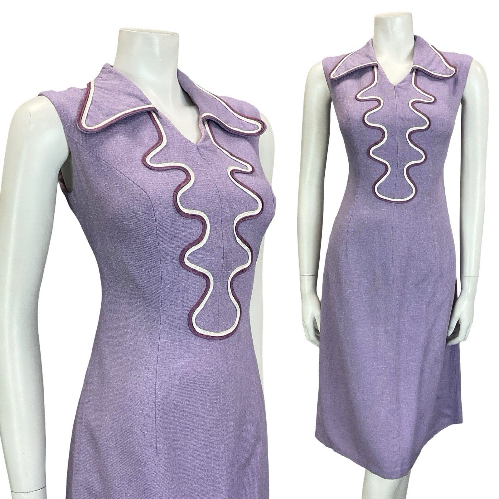 VTG 60S 70S LILAC PURPLE WHITE WAVY DOG EAR COLLAR MOD SHIRT DRESS M 12 14