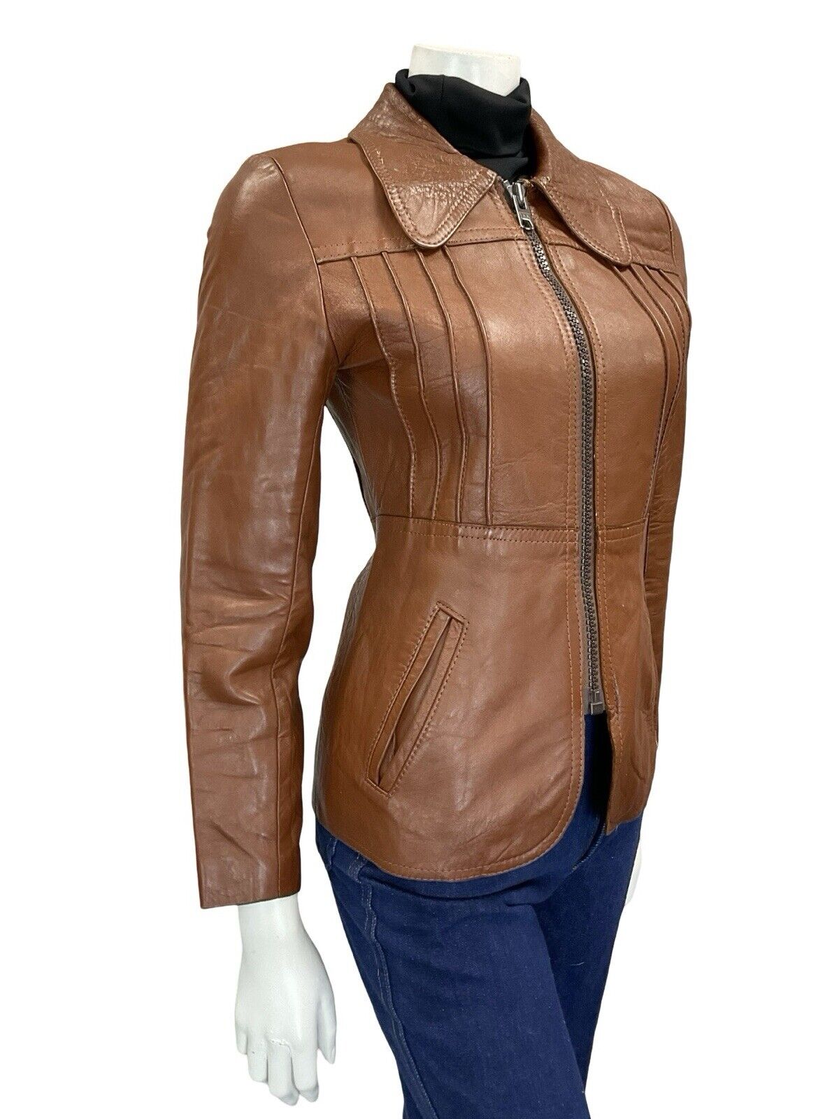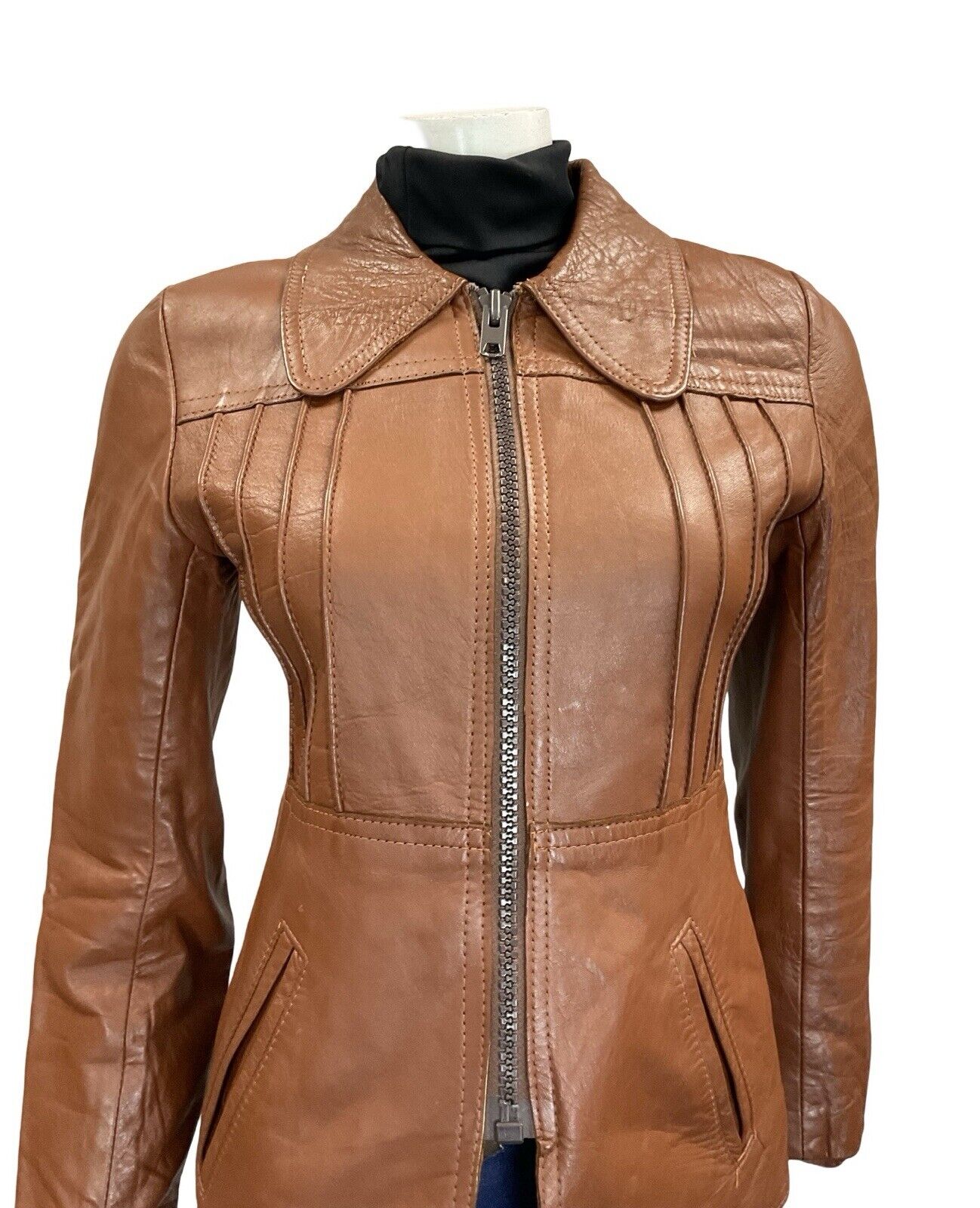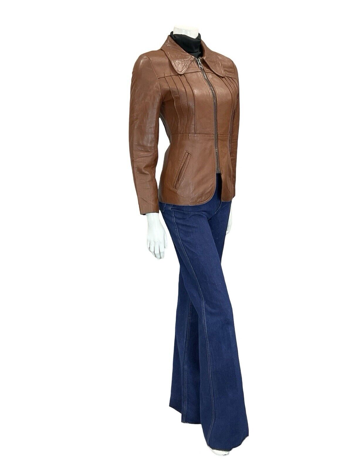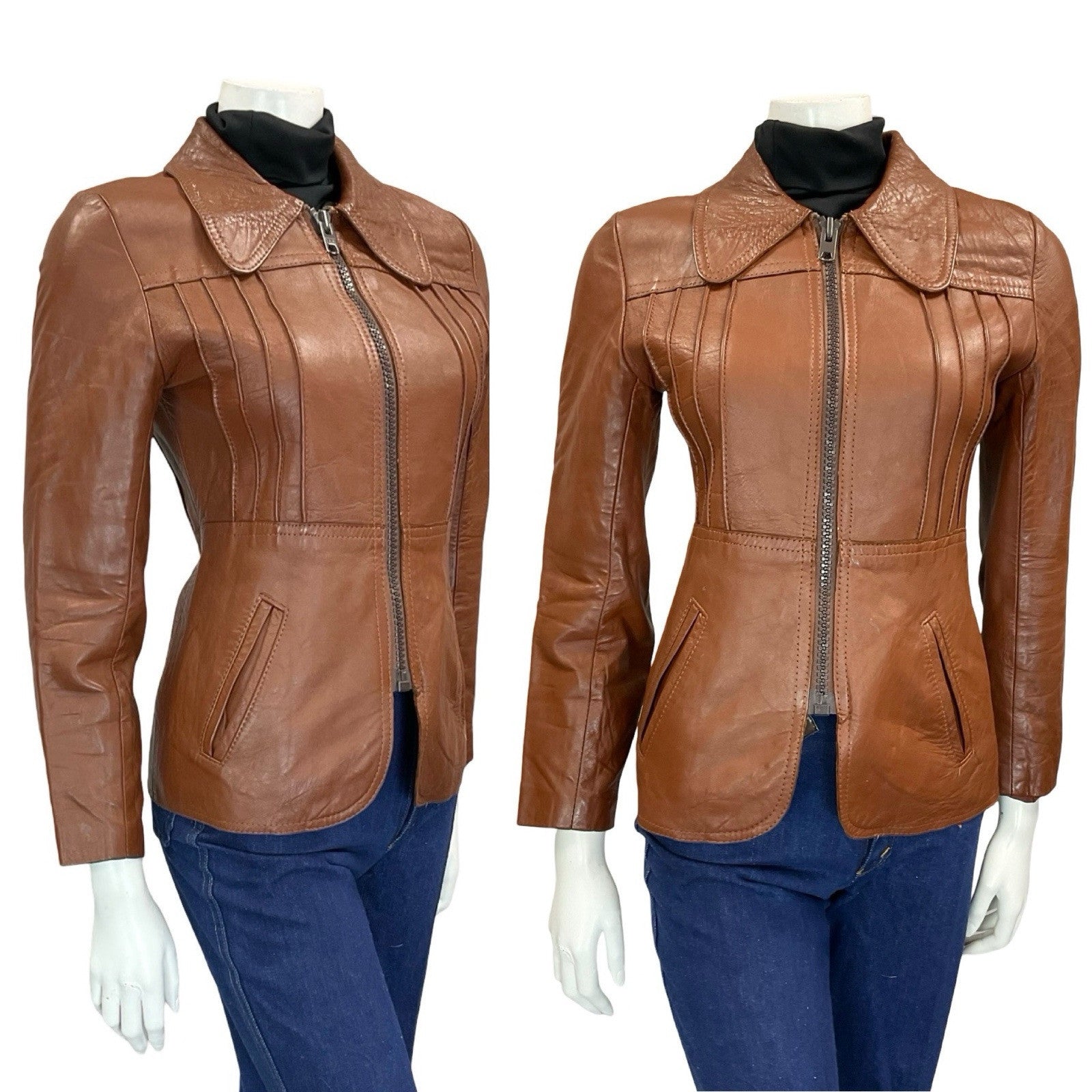 This is a gorgeous 60s 70s dark tan leather jacket with a a rounded dog ear collar and vertical smocking across the bodice. This leather jacket has small pockets on the front as well as a dark brown polyester inner lining. This jacket zips up at the front with a dark brown thick zipper. This is great for anyone looking for a leather jacket which adds vintage flare to any outfit. This figure flattering piece looks great dressed up or down for any occasion and this neutral tone means you have countless outfits to wear it with.