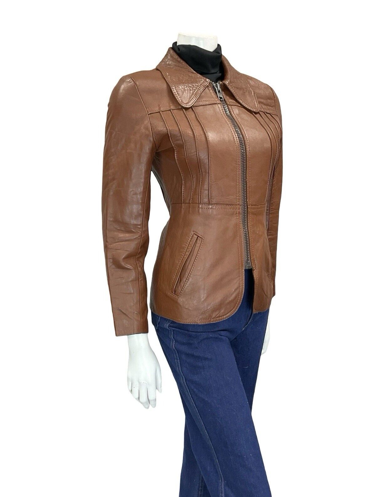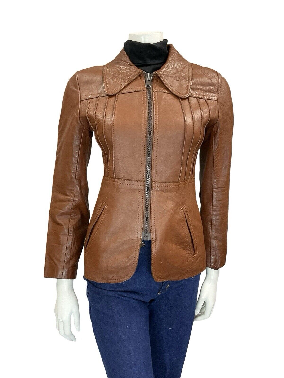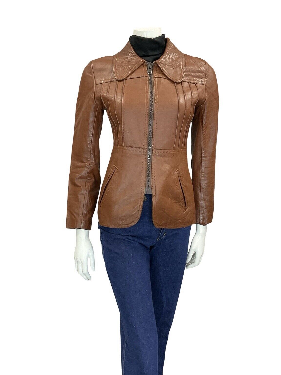 This is a gorgeous 60s 70s dark tan leather jacket with a a rounded dog ear collar and vertical smocking across the bodice. This leather jacket has small pockets on the front as well as a dark brown polyester inner lining. This jacket zips up at the front with a dark brown thick zipper. This is great for anyone looking for a leather jacket which adds vintage flare to any outfit. This figure flattering piece looks great dressed up or down for any occasion and this neutral tone means you have countless outfits to wear it with.