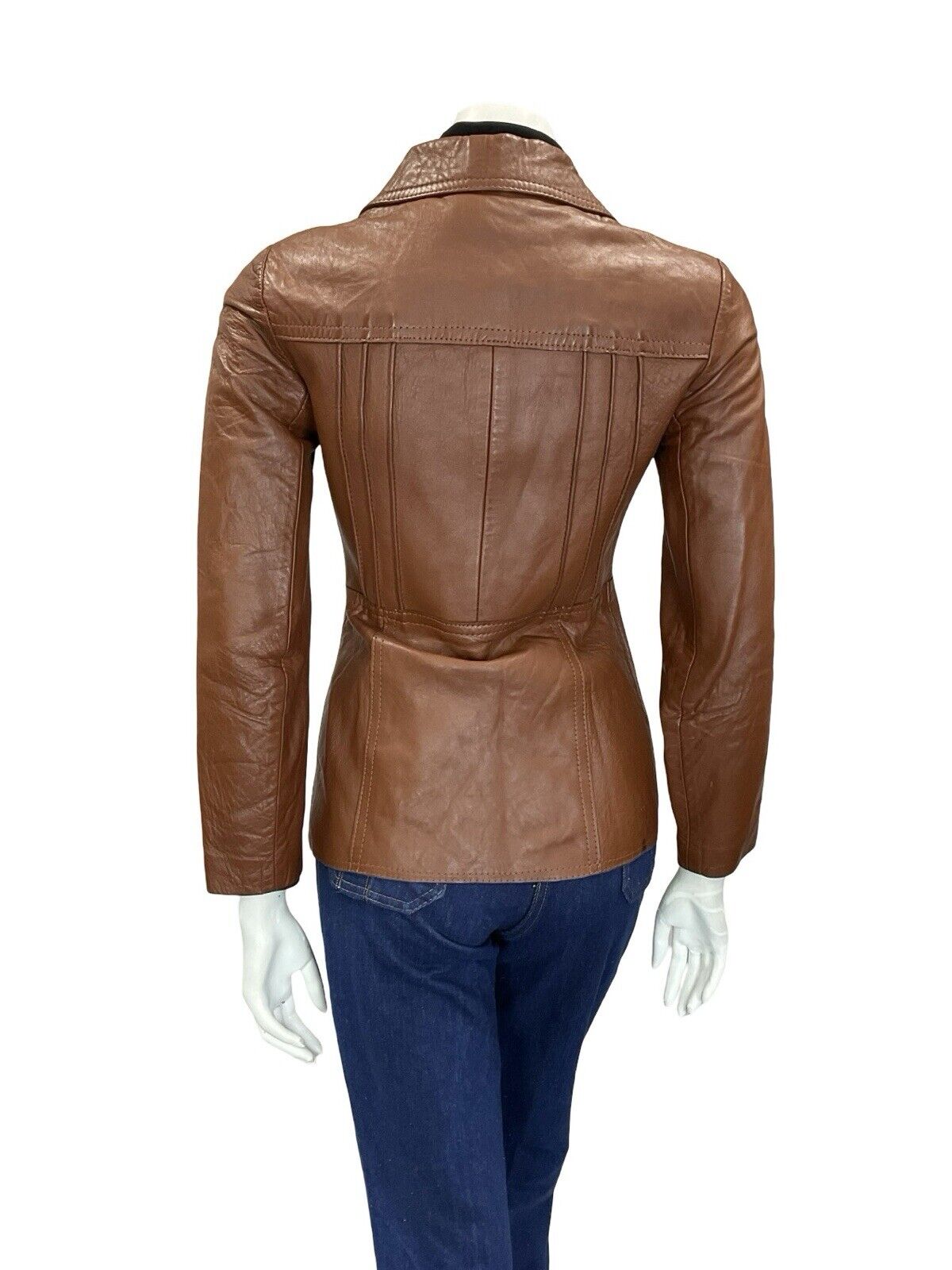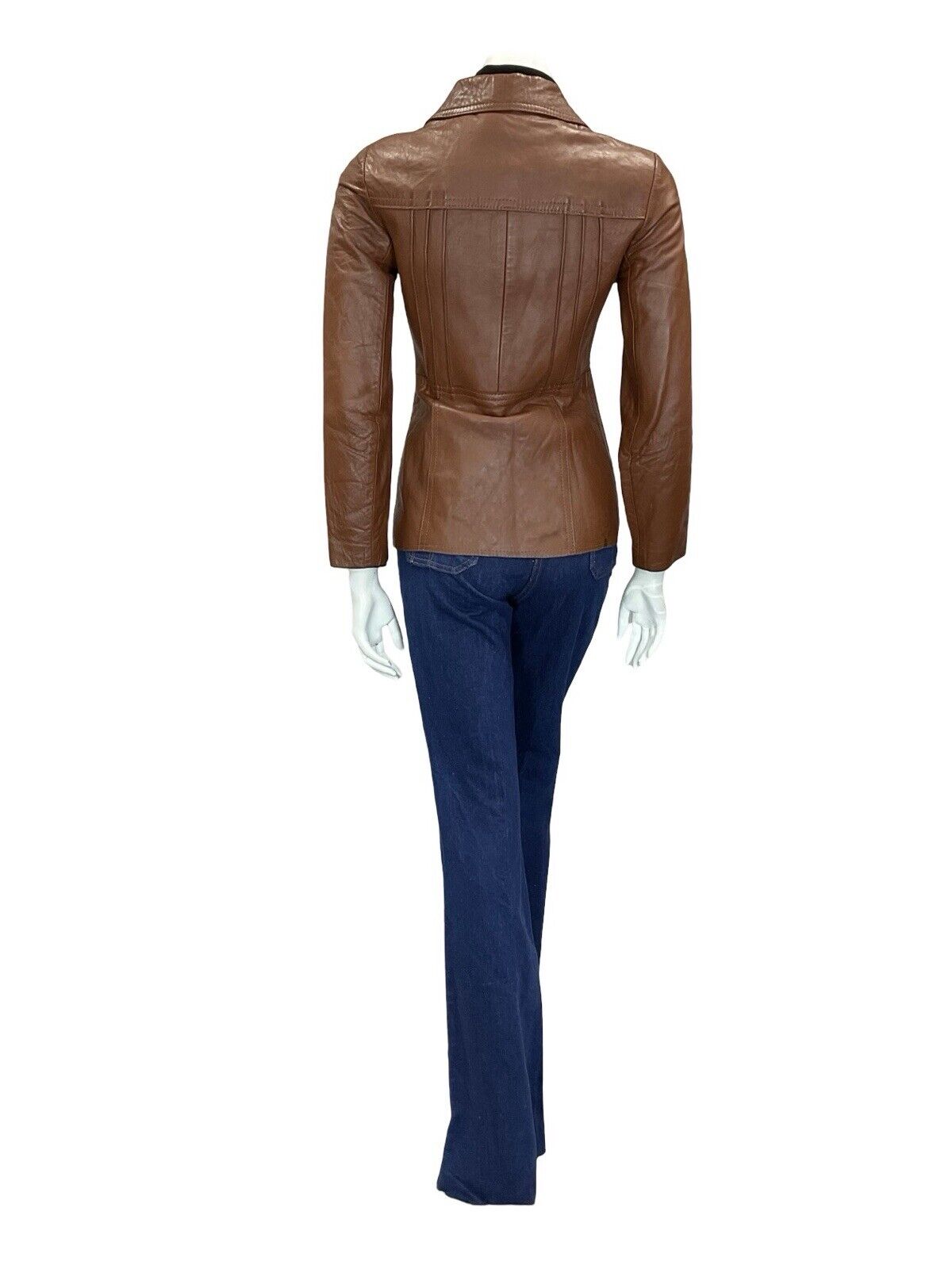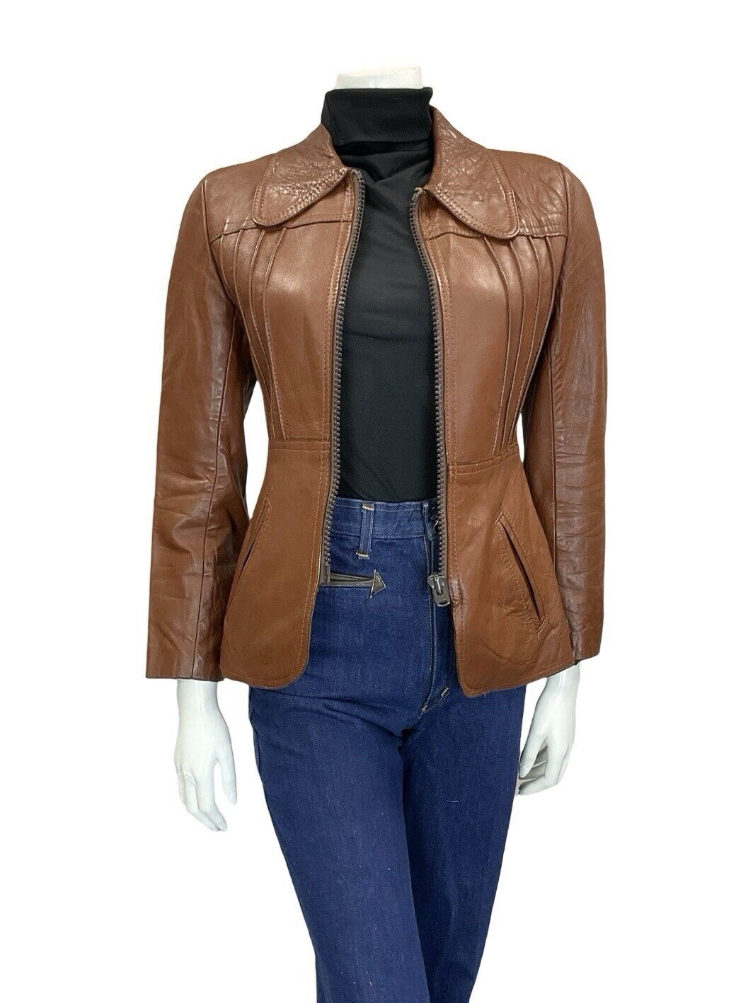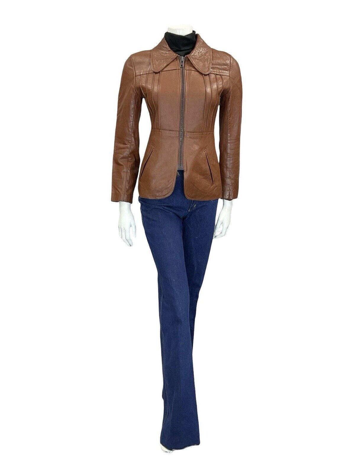 This is a gorgeous 60s 70s dark tan leather jacket with a a rounded dog ear collar and vertical smocking across the bodice. This leather jacket has small pockets on the front as well as a dark brown polyester inner lining. This jacket zips up at the front with a dark brown thick zipper. This is great for anyone looking for a leather jacket which adds vintage flare to any outfit. This figure flattering piece looks great dressed up or down for any occasion and this neutral tone means you have countless outfits to wear it with.
