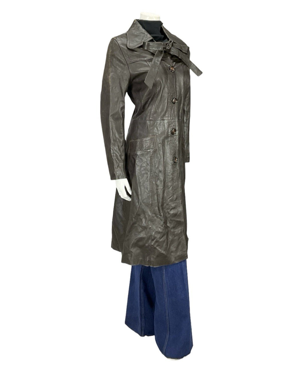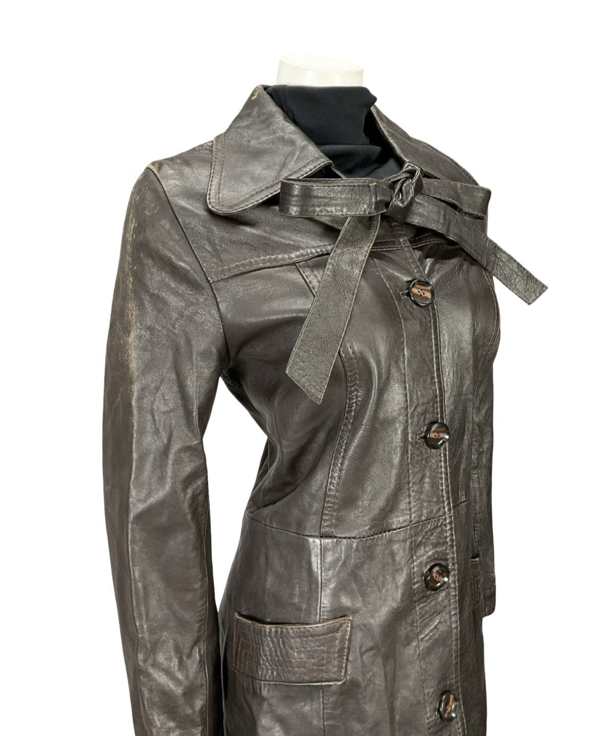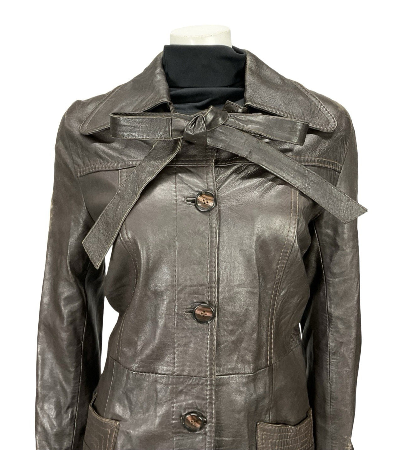 This is a lovely dark brown leather trench coat with a gorgeous dog ear collar and pockets at the hips. This jacket comes with two leather straps buttoned at the top of the jacket, which can be tied in a bow, or tied together to create a waist tie. This jacket is lined inside with a brown synthetic fabric, and buttons down the front via 5 brown marbled buttons. This jacket does show some signs of scuffing at the shoulders, but these do not impact wearability nor durability. This is a fabulous choice for anyone looking for a dependable piece of outerwear, perfect to go with any outfit.