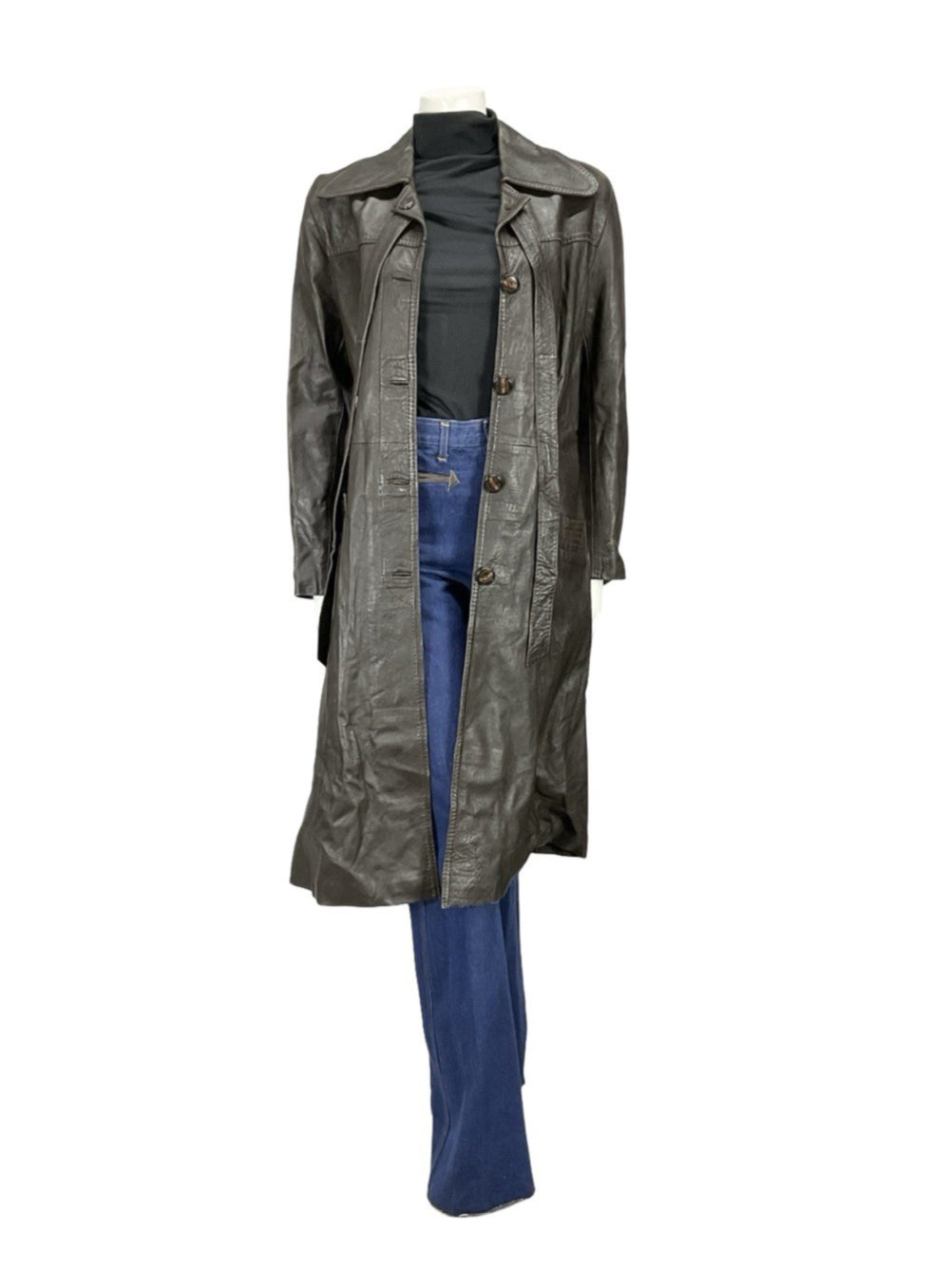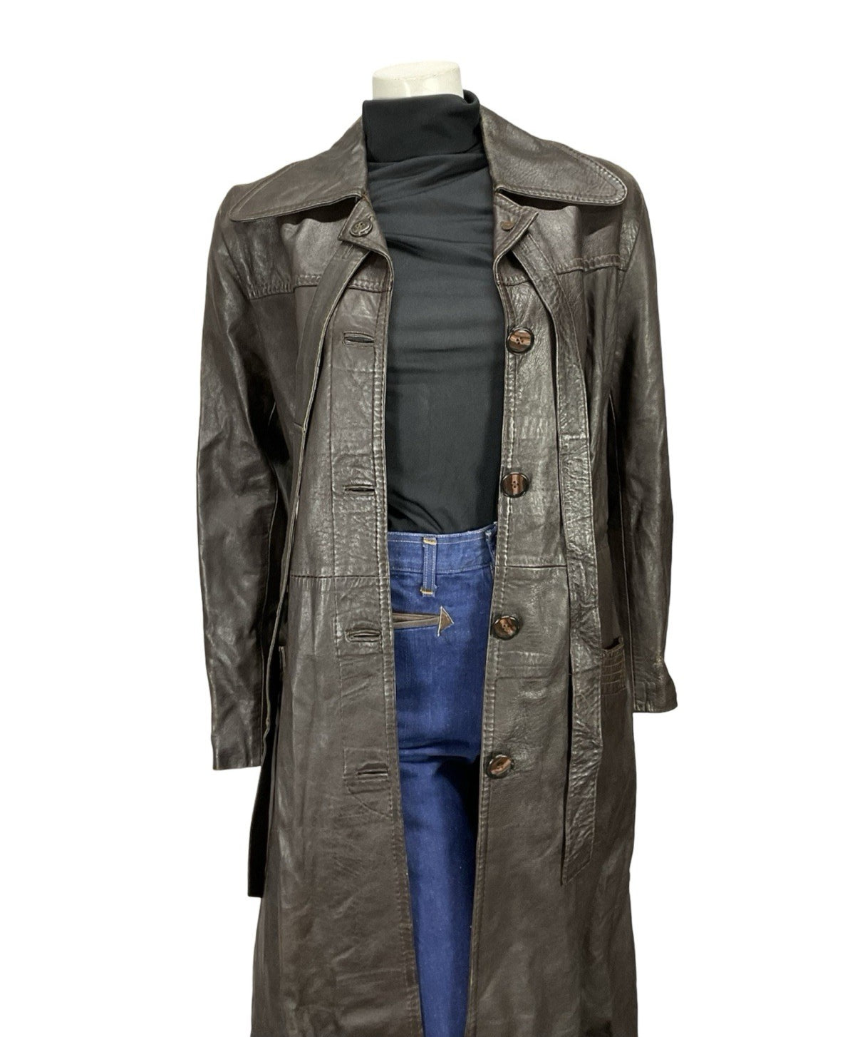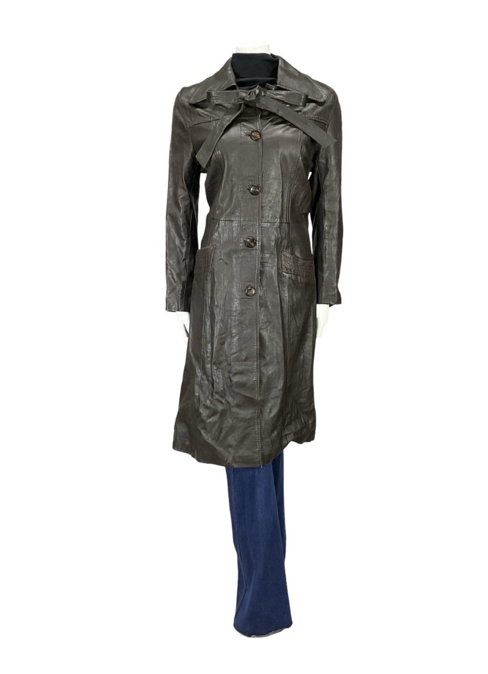 This is a lovely dark brown leather trench coat with a gorgeous dog ear collar and pockets at the hips. This jacket comes with two leather straps buttoned at the top of the jacket, which can be tied in a bow, or tied together to create a waist tie. This jacket is lined inside with a brown synthetic fabric, and buttons down the front via 5 brown marbled buttons. This jacket does show some signs of scuffing at the shoulders, but these do not impact wearability nor durability. This is a fabulous choice for anyone looking for a dependable piece of outerwear, perfect to go with any outfit.