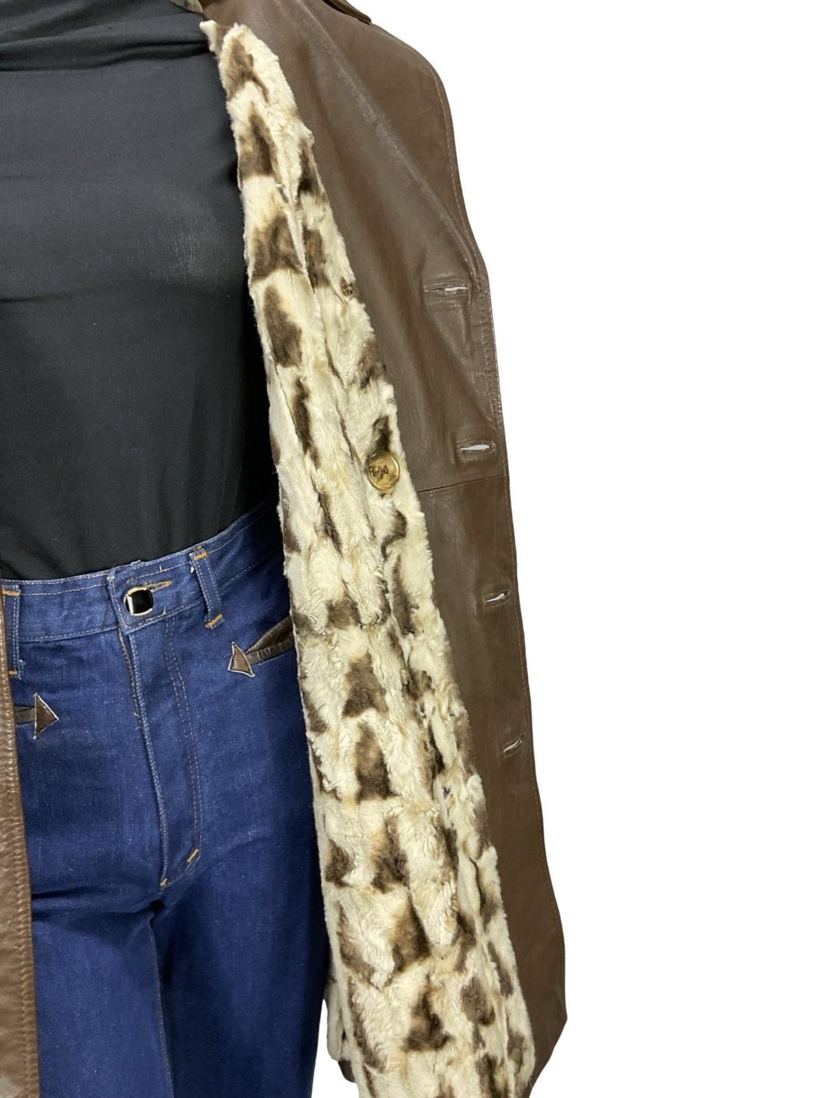 VTG 60S 70S MOD DOUBLE BREAST BROWN LEATHER TRENCH MAC FAUX FUR LINED JACKET 16