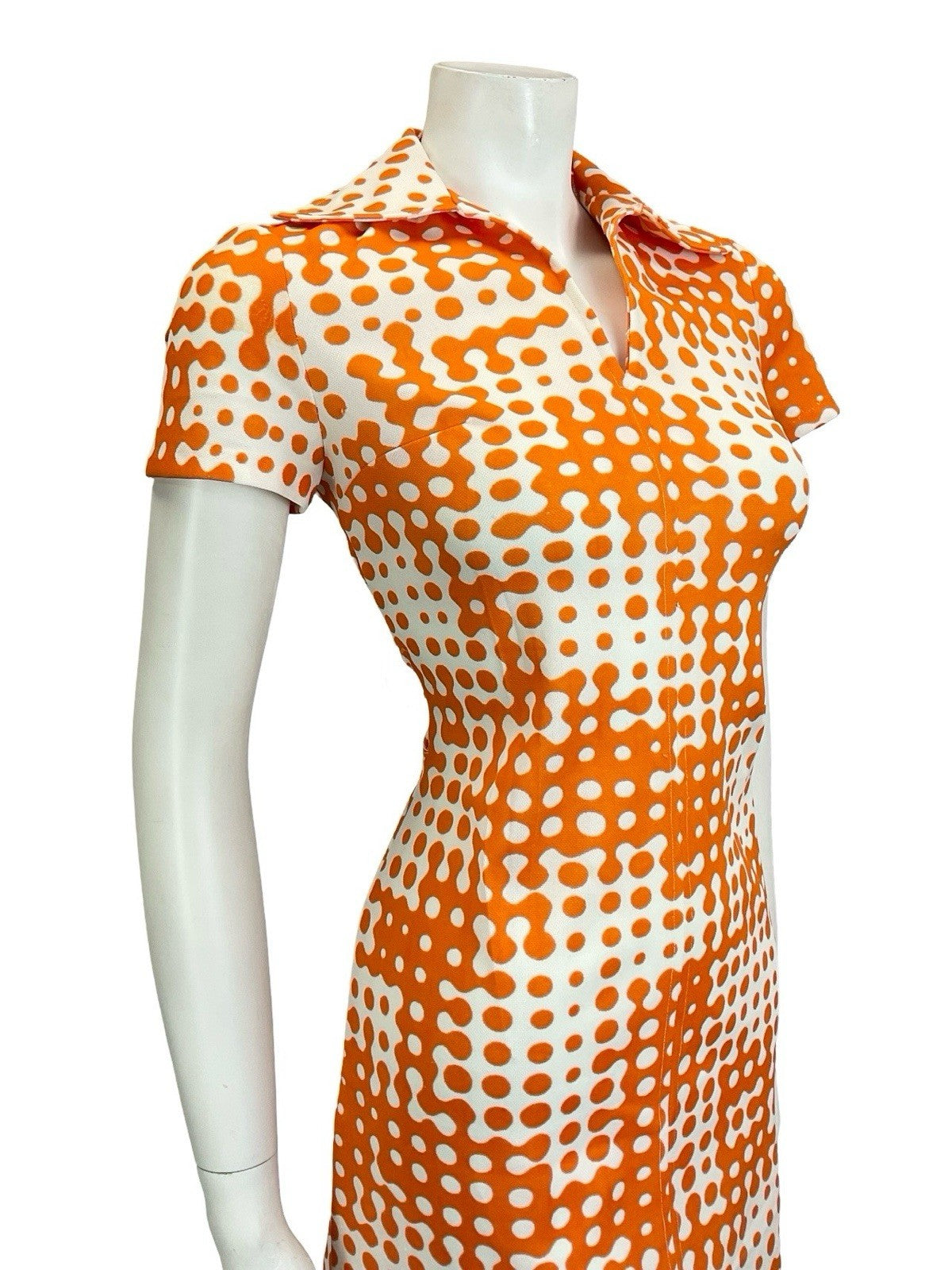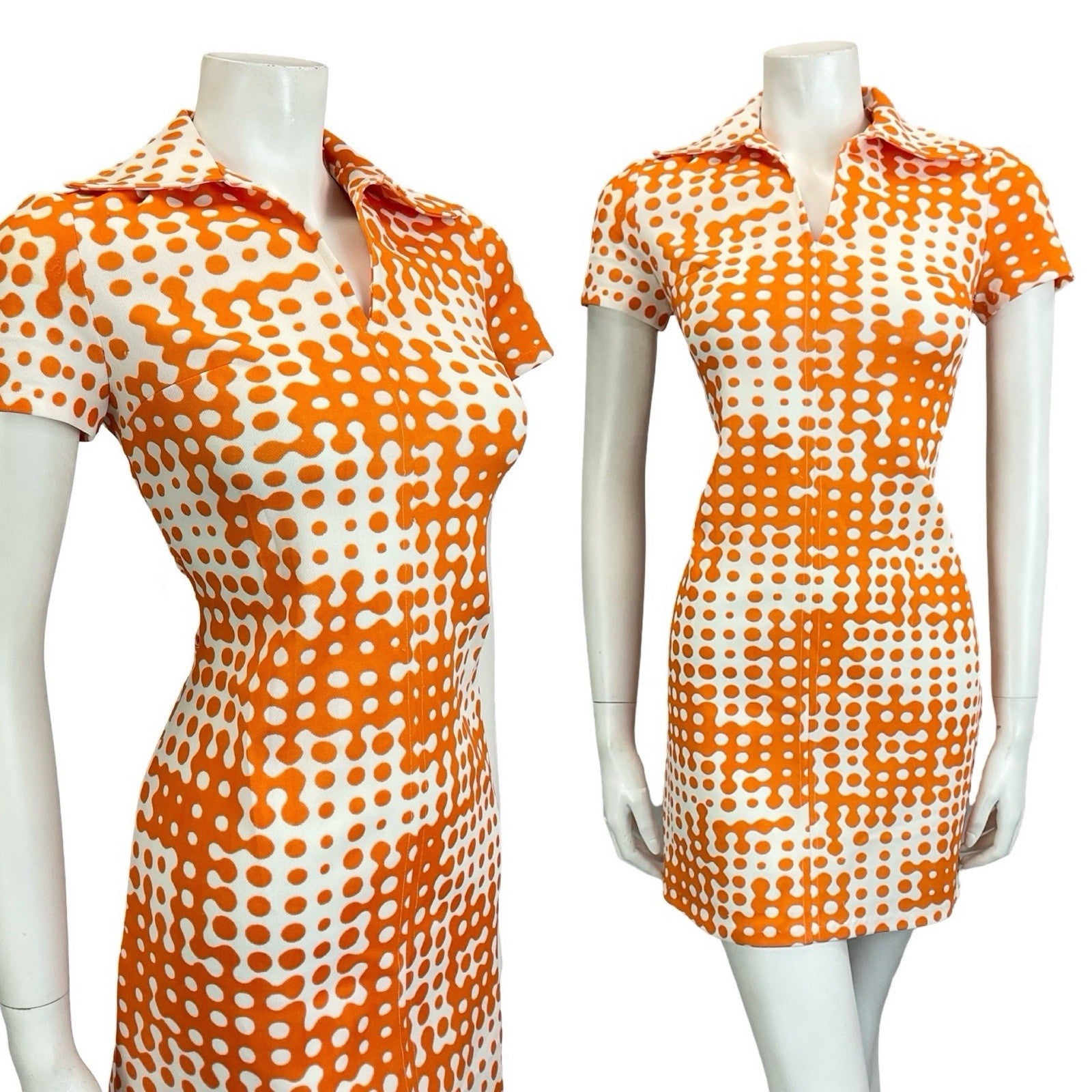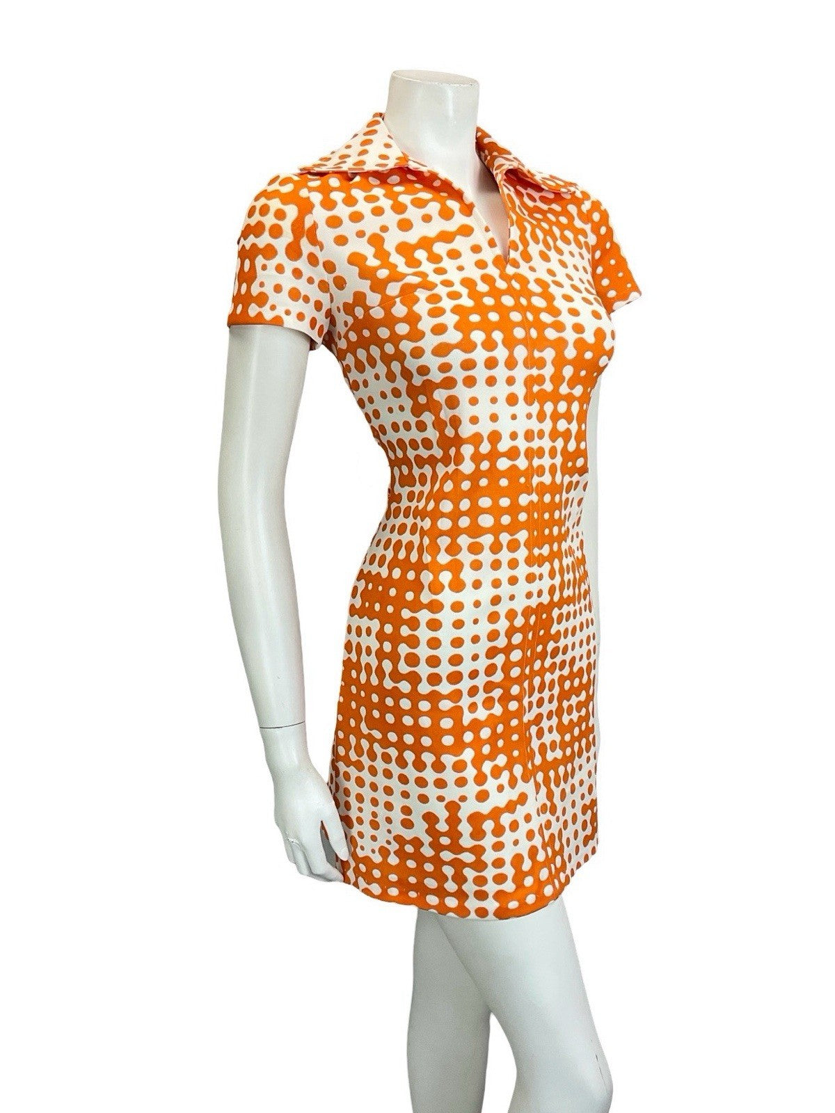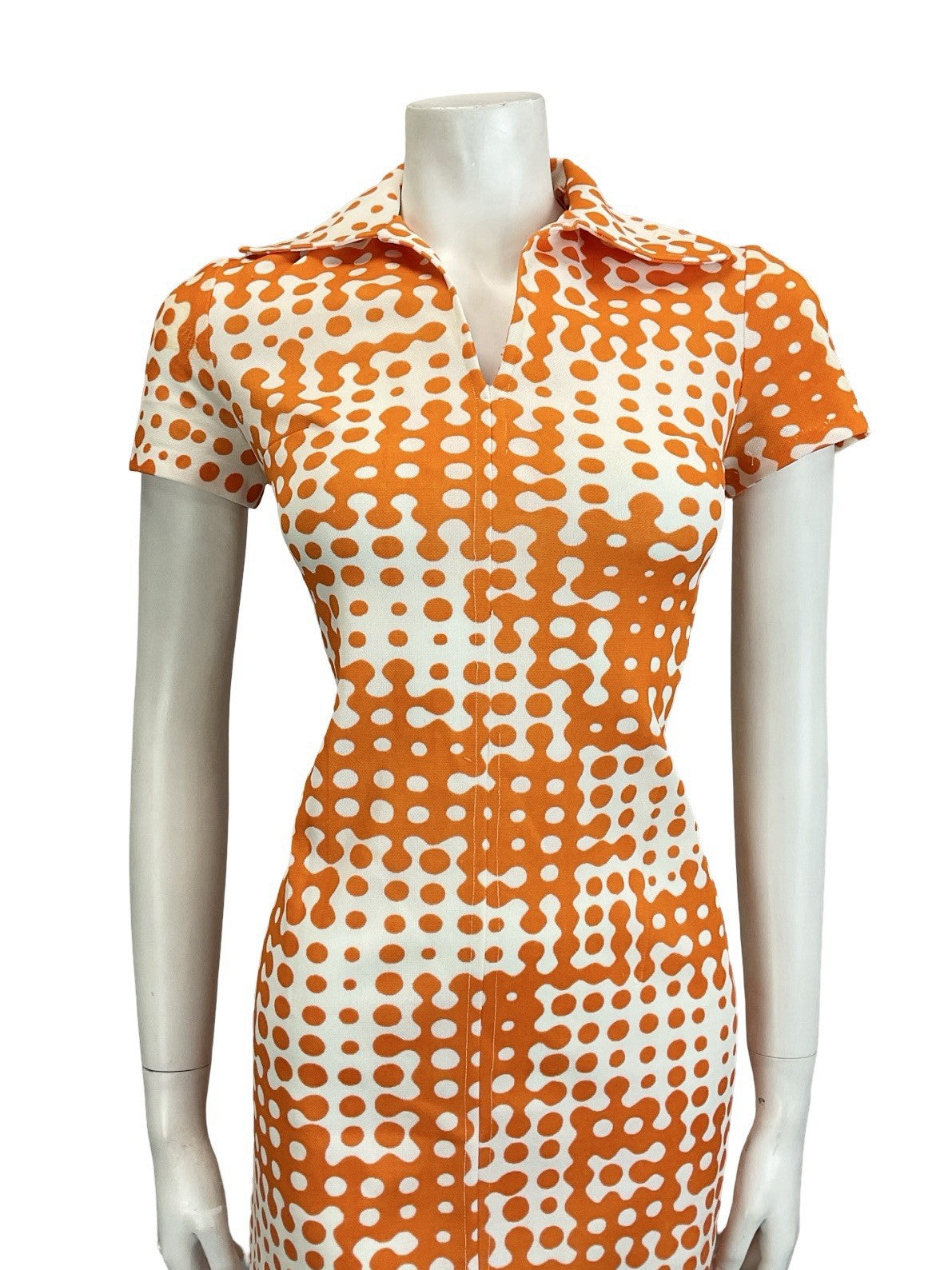 VTG 60S 70S MOD GEOMETRIC WHITE ORANGE ROUNDED COLLAR MINI SHIRT DRESS 10