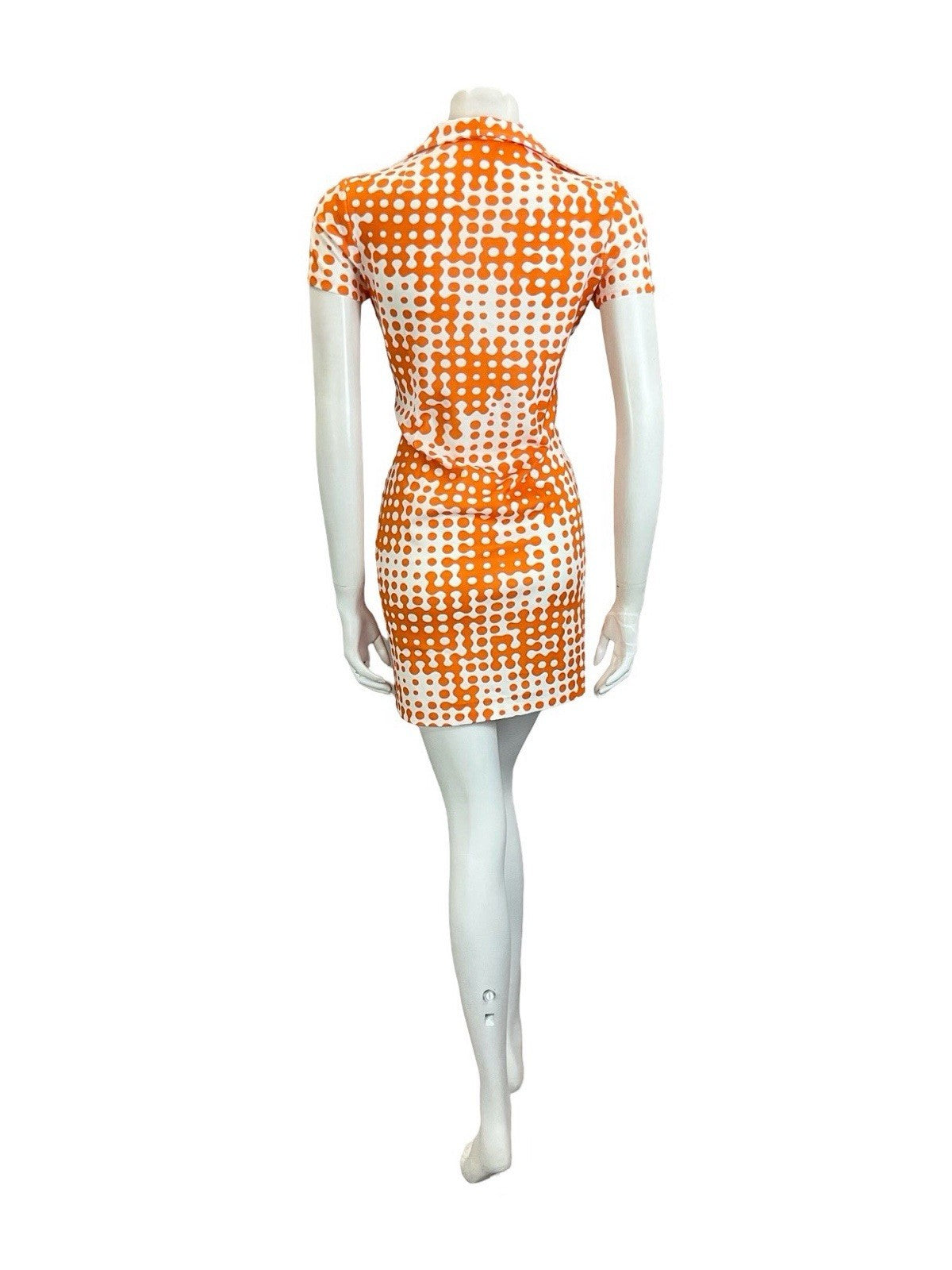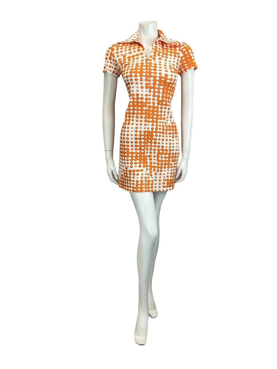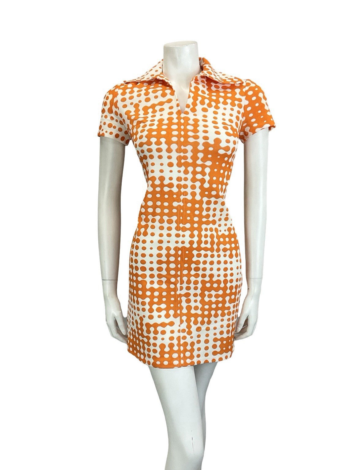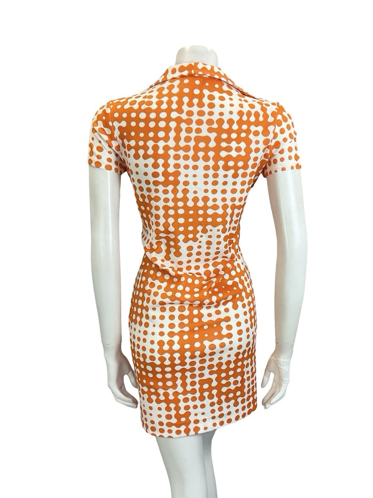 VTG 60S 70S MOD GEOMETRIC WHITE ORANGE ROUNDED COLLAR MINI SHIRT DRESS 10