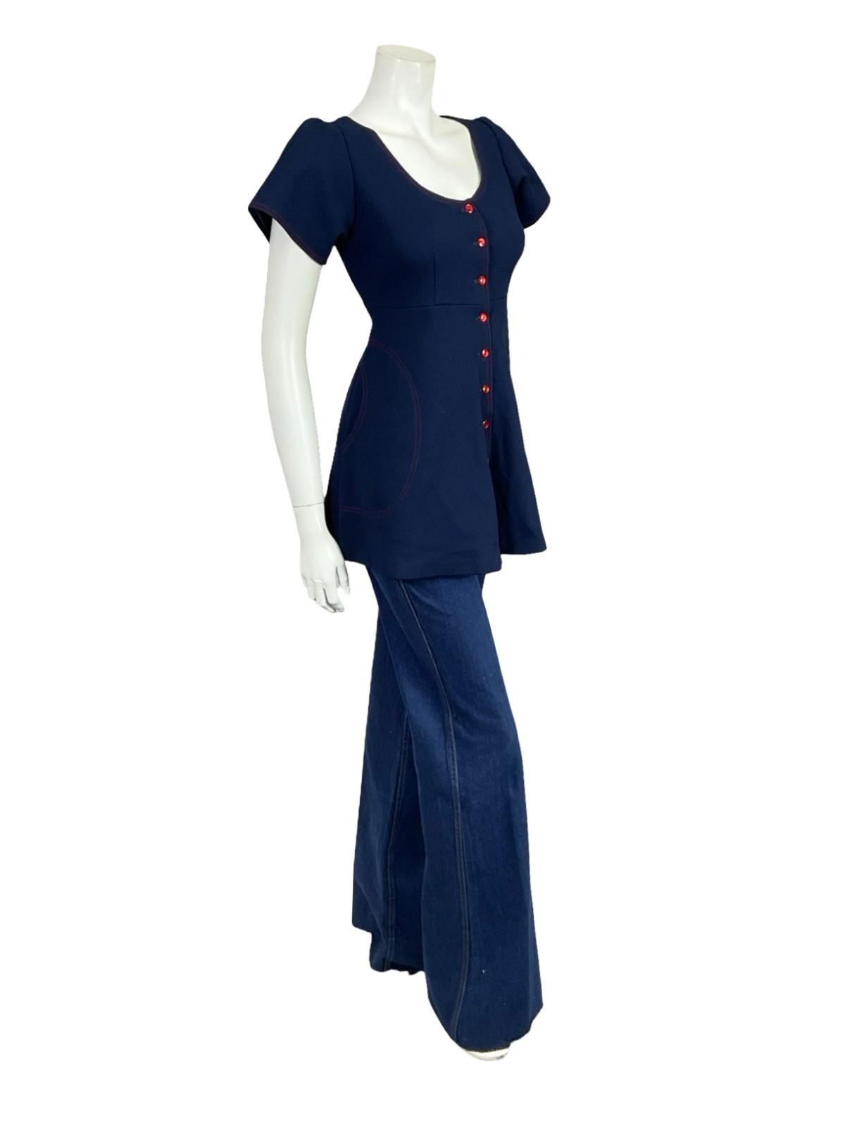 VTG 60S 70S MOD GOGO NAVY BLUE RED STITCH EMPIRE TUNIC MICRO MINI DRESS 8