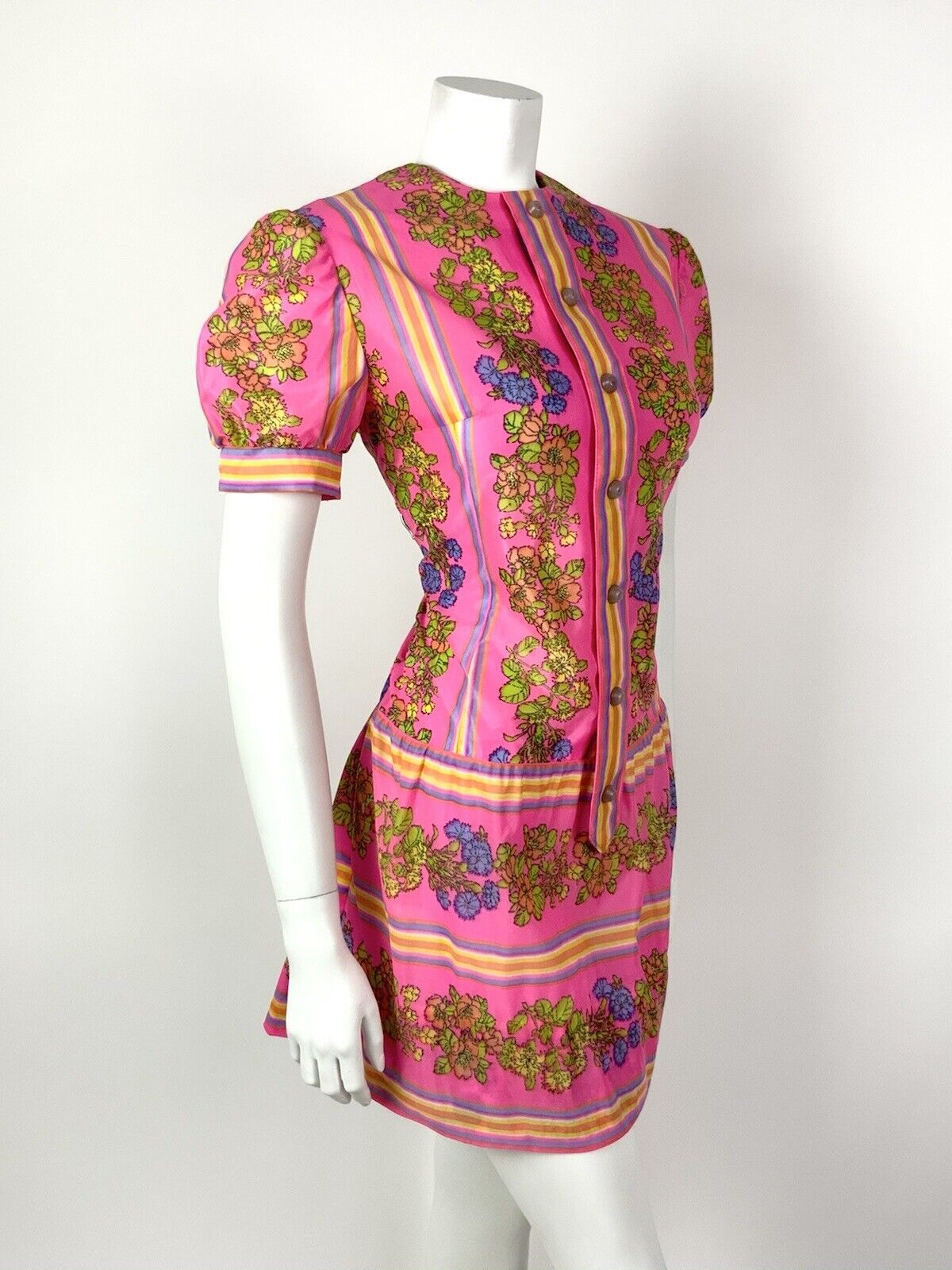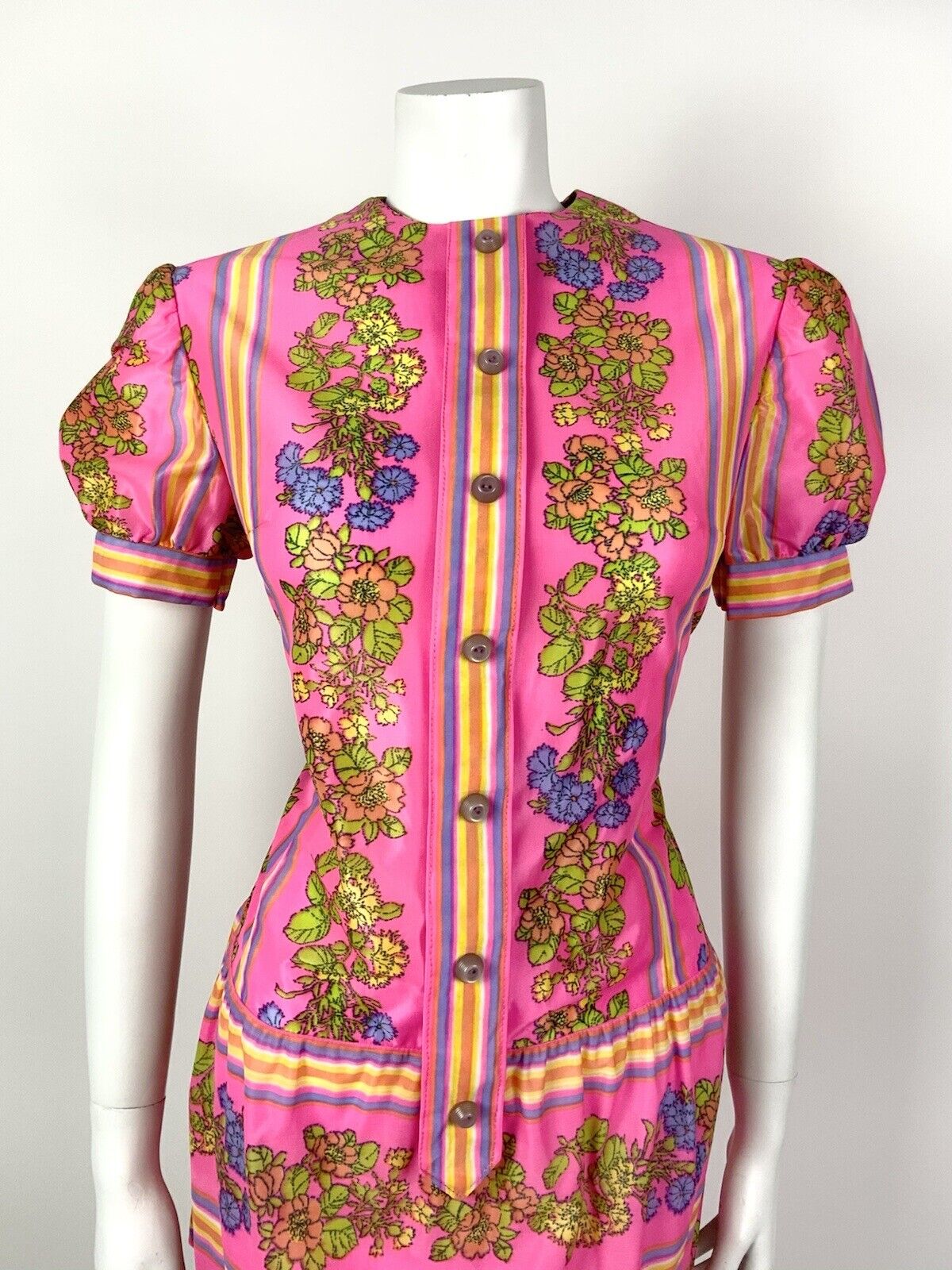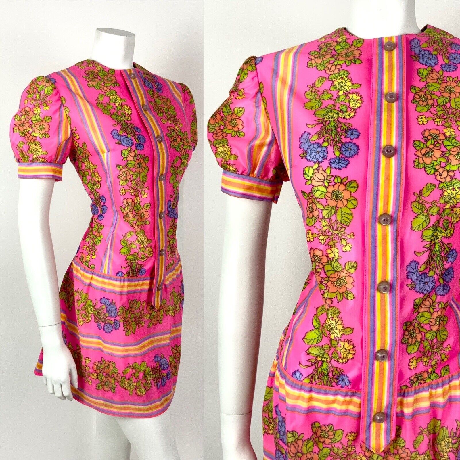 VTG 60s 70s NEON PINK YELLOW PURPLE STRIPED FLORAL MOD DROP WAIST DRESS 10 12