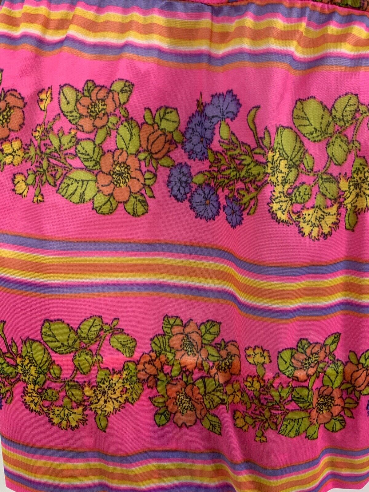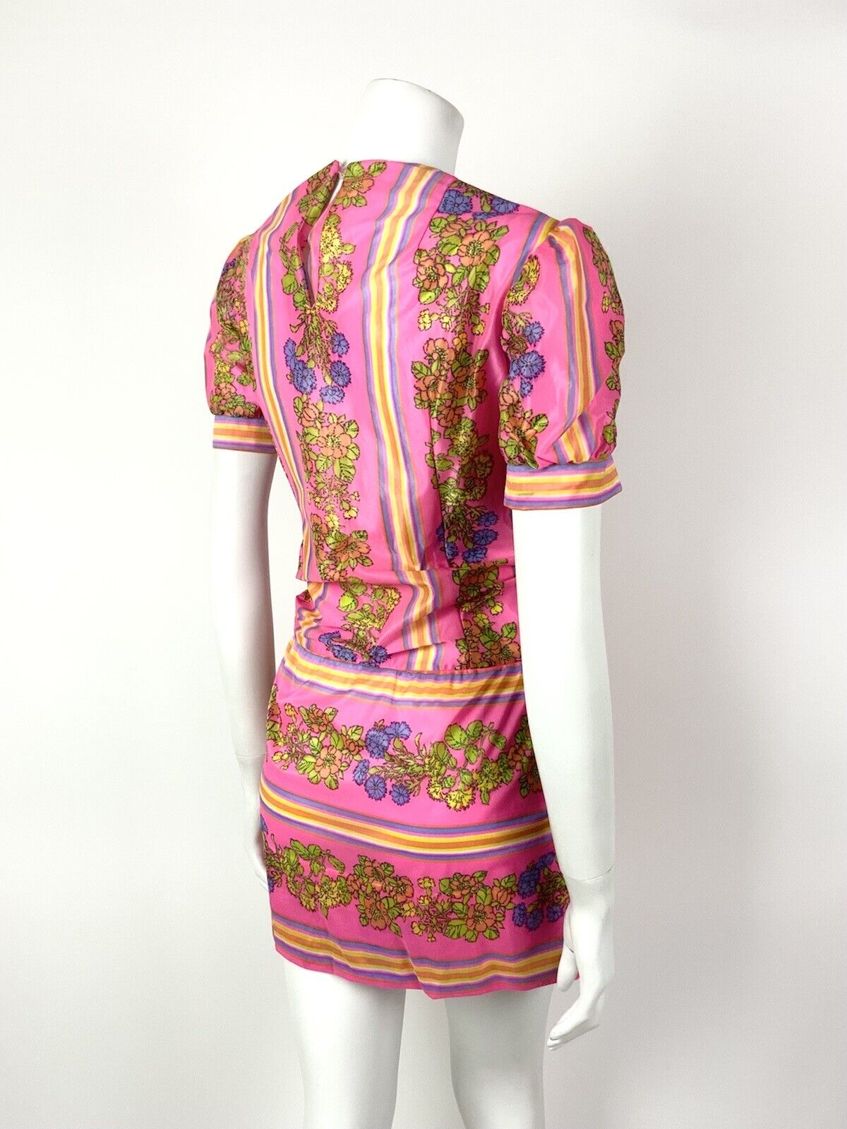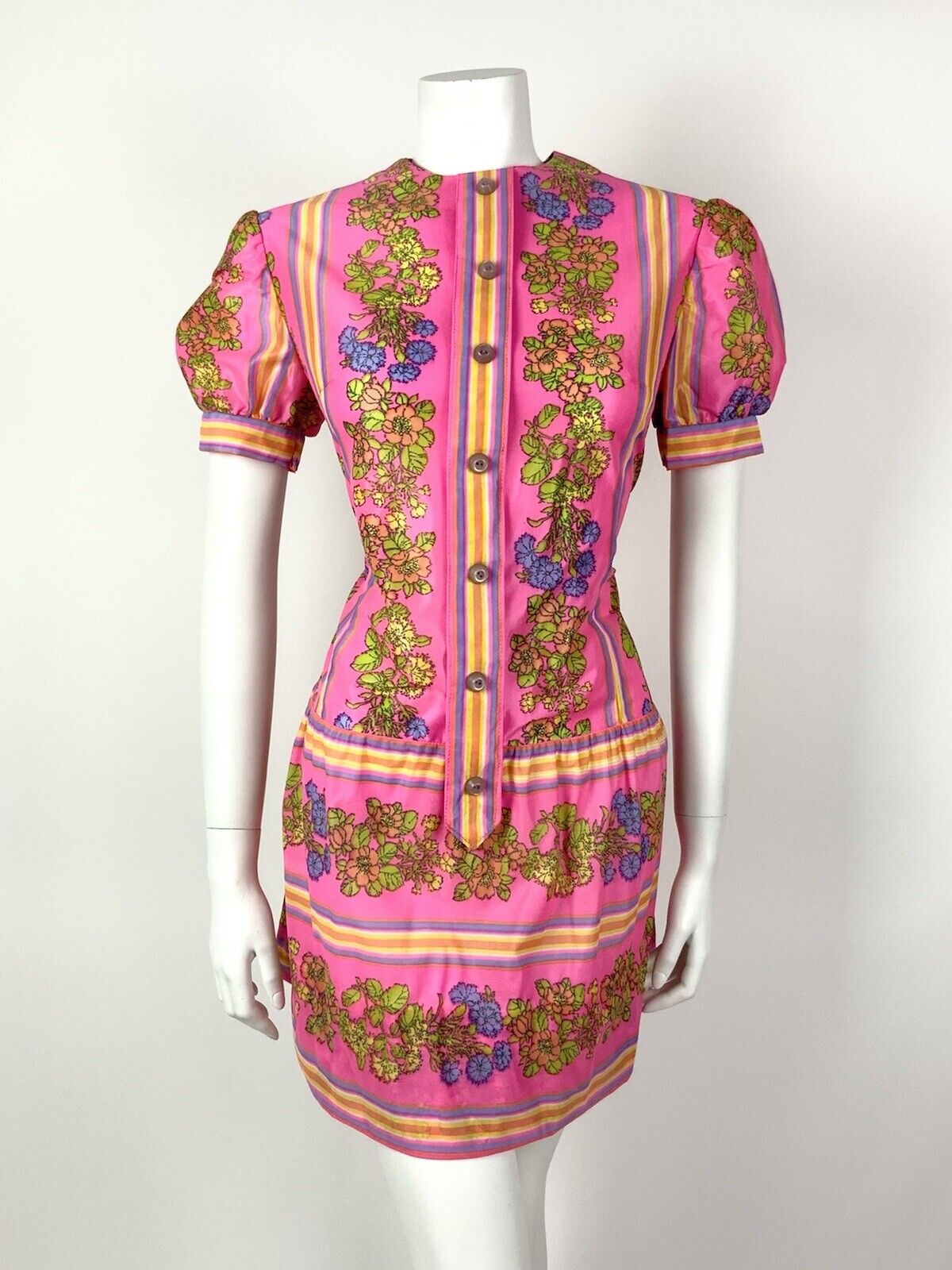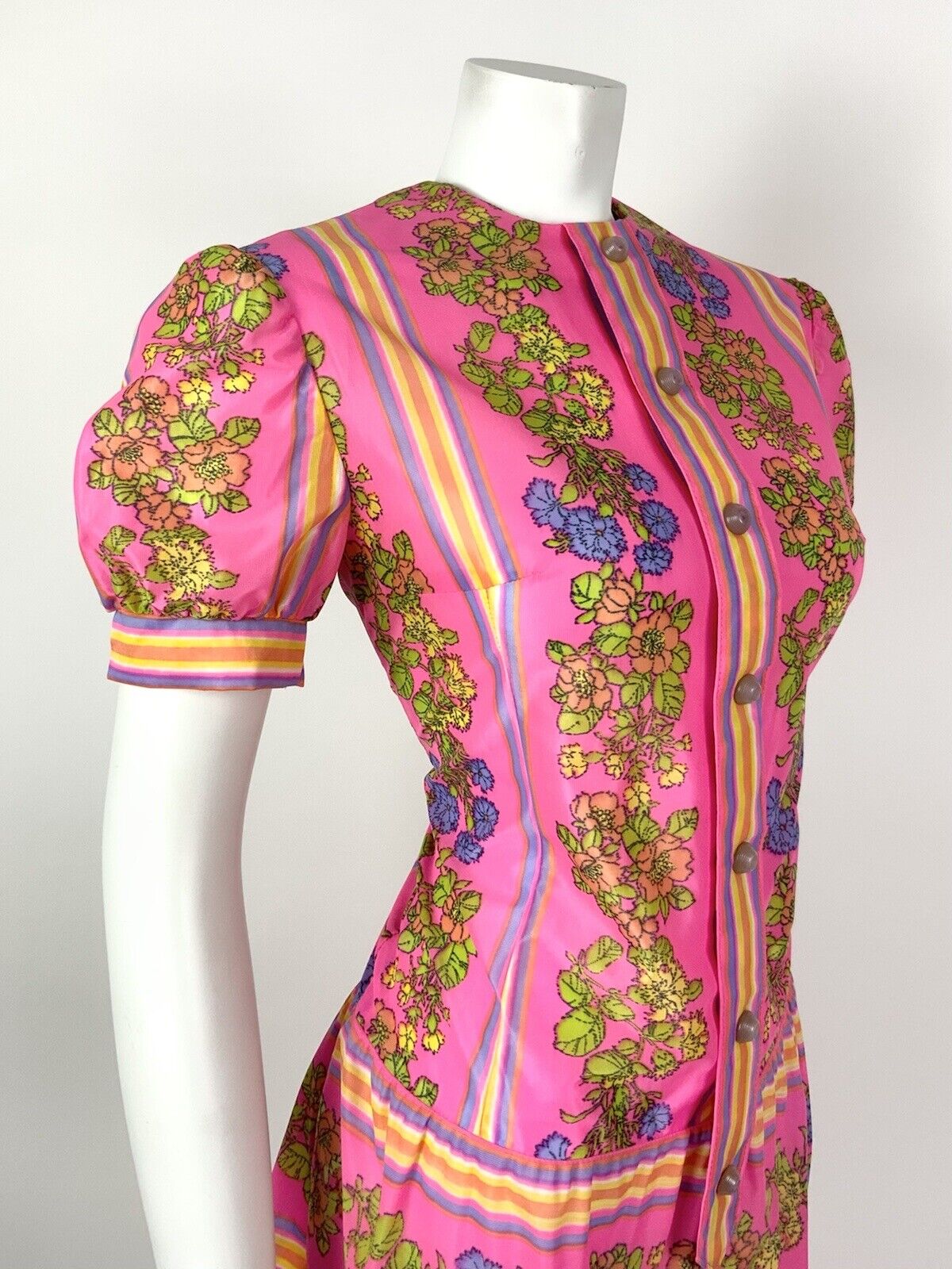 VTG 60s 70s NEON PINK YELLOW PURPLE STRIPED FLORAL MOD DROP WAIST DRESS 10 12