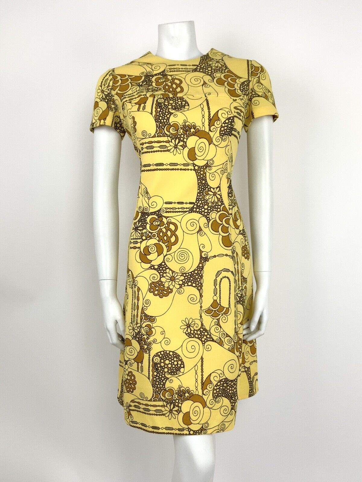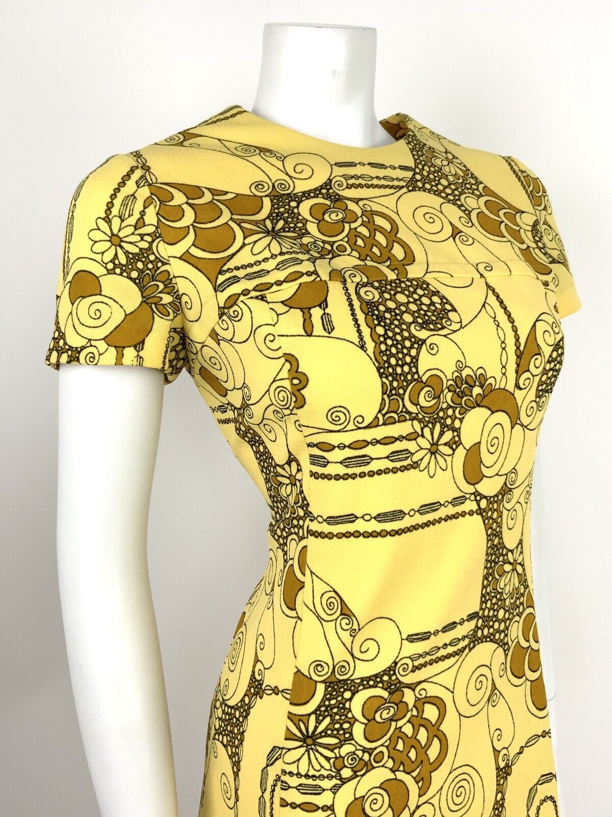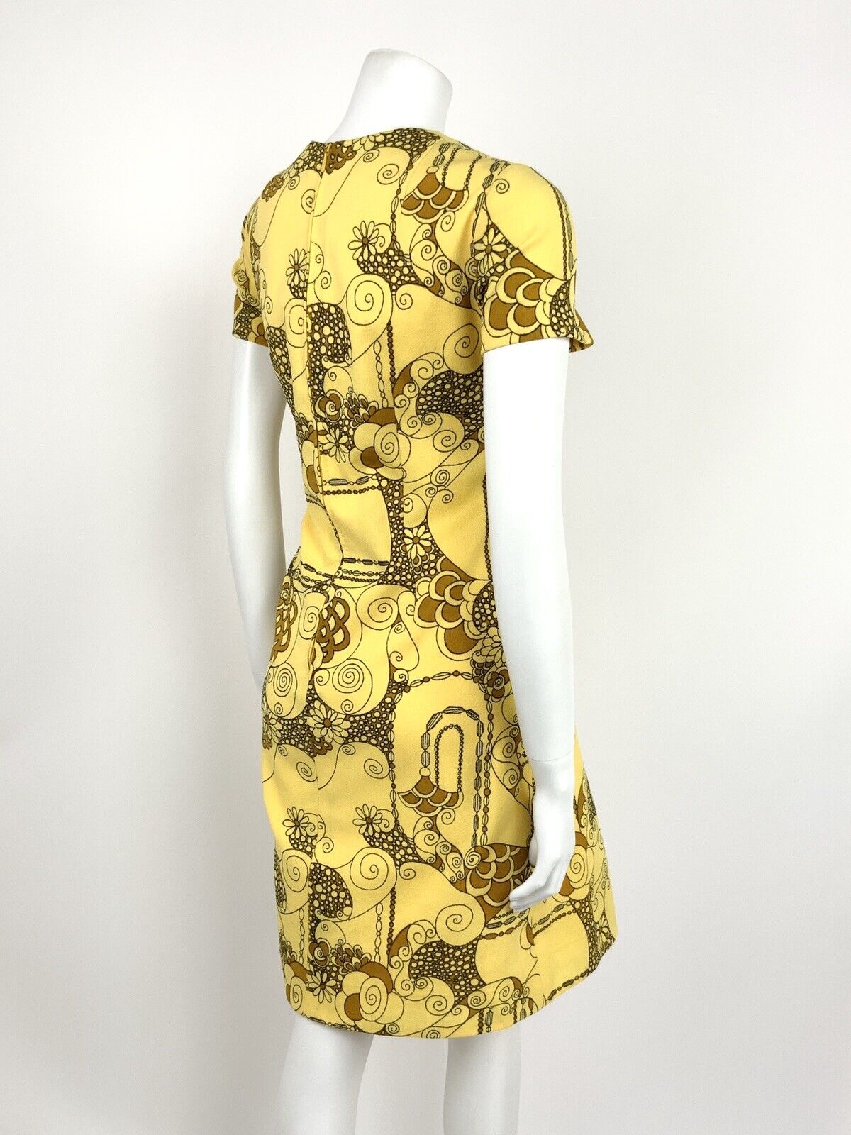 VTG 60s 70s PASTEL YELLOW BLACK BROWN ABSTRACT FLORAL SWIRL A-LINE DRESS 10 12