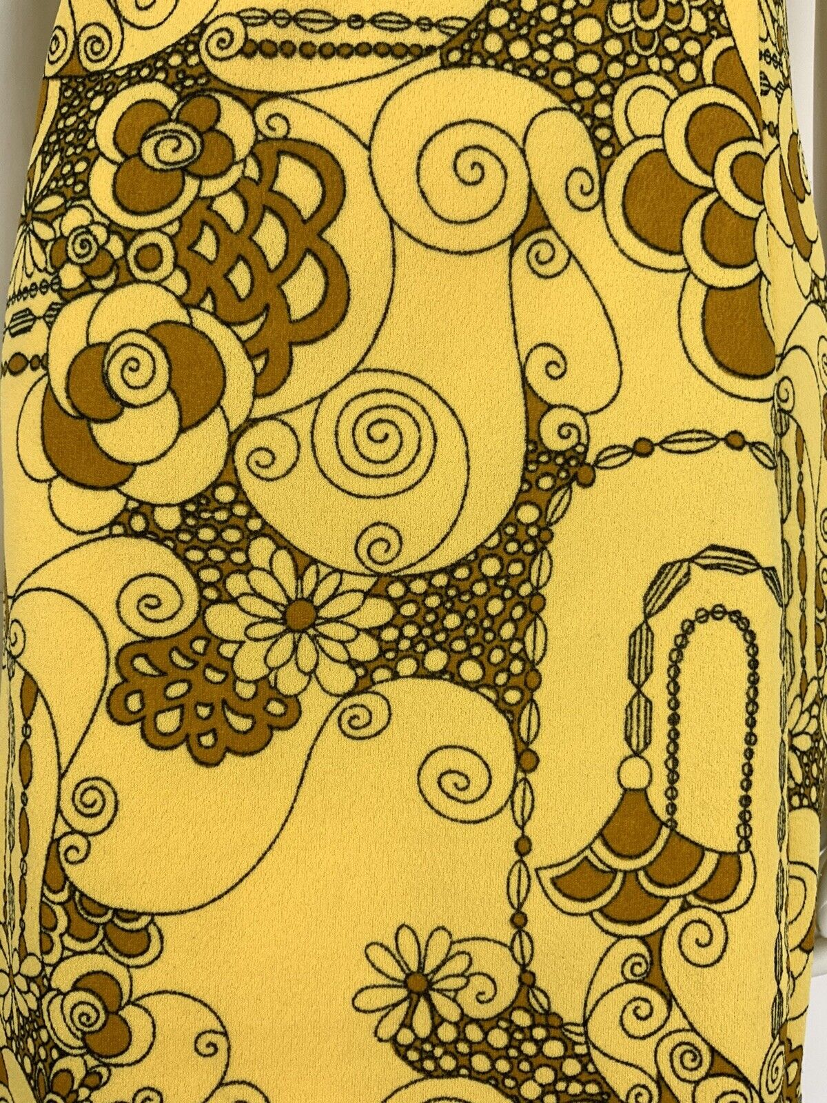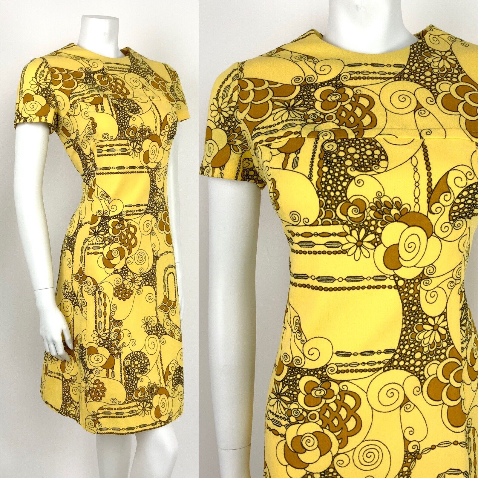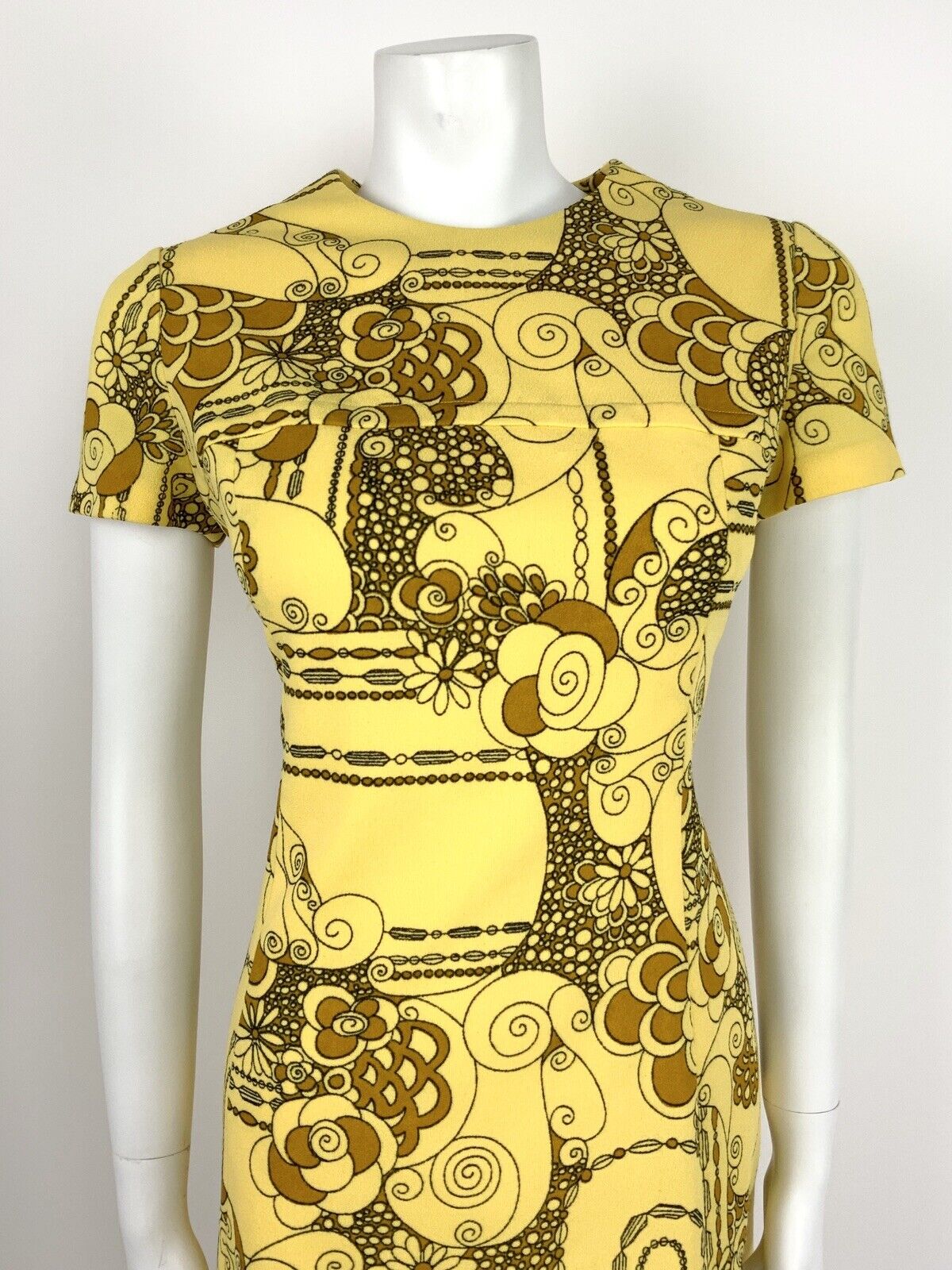 VTG 60s 70s PASTEL YELLOW BLACK BROWN ABSTRACT FLORAL SWIRL A-LINE DRESS 10 12