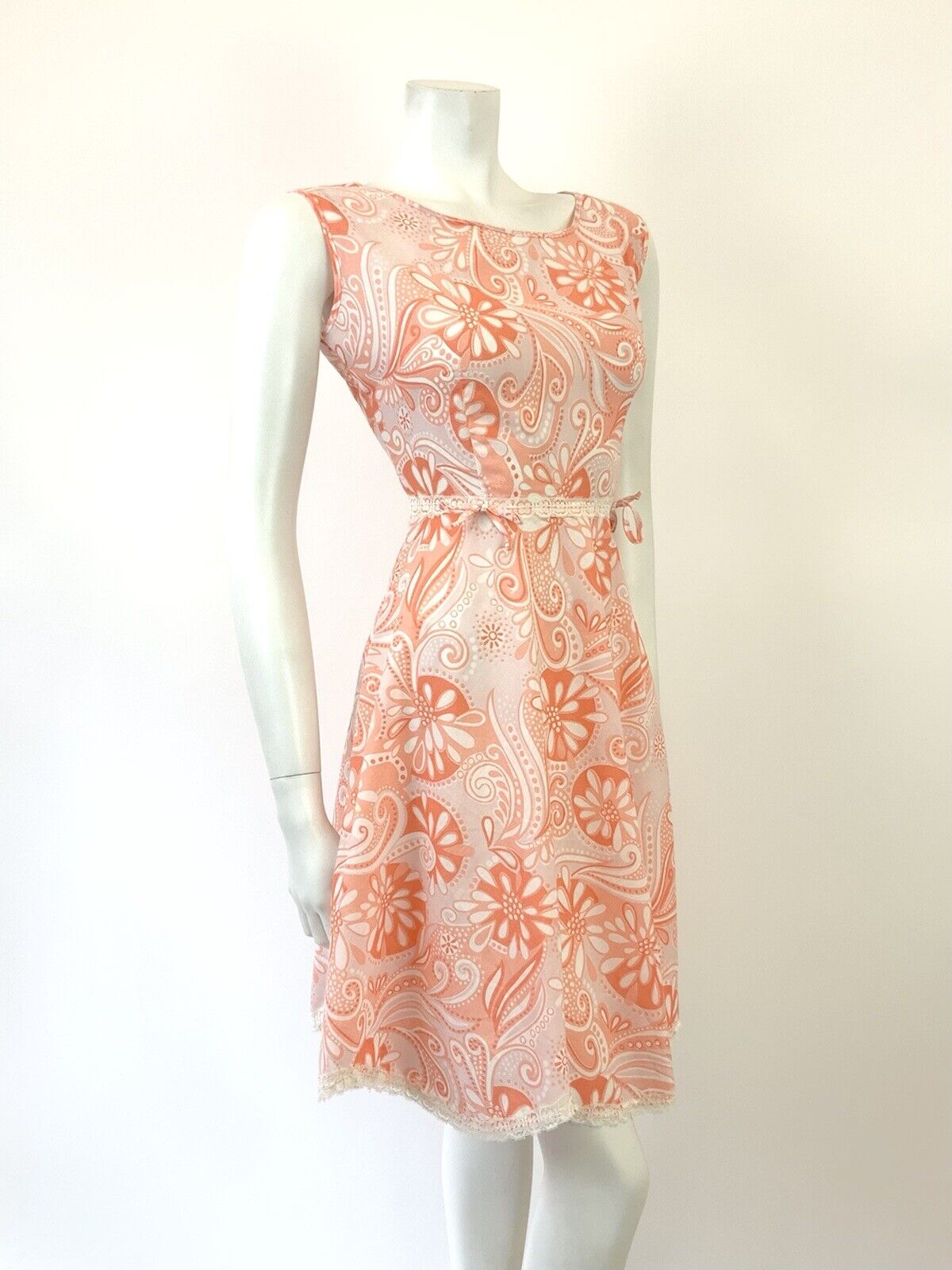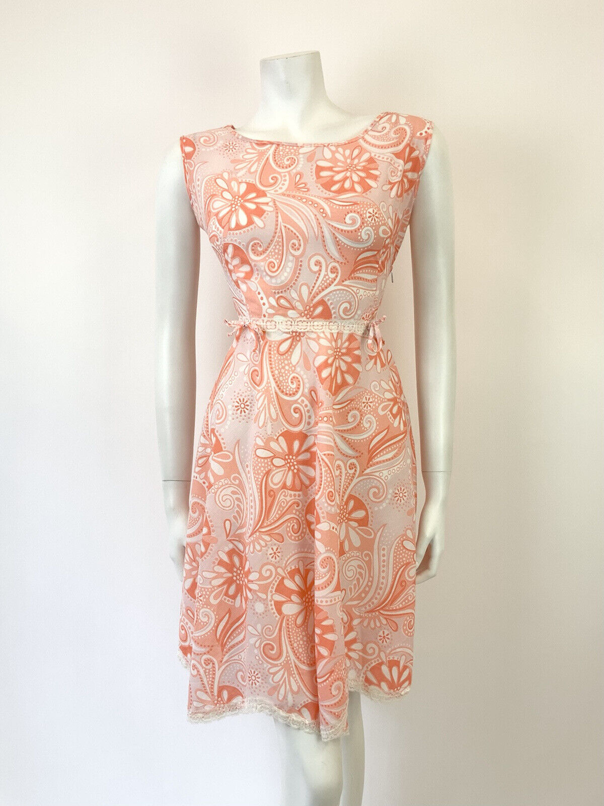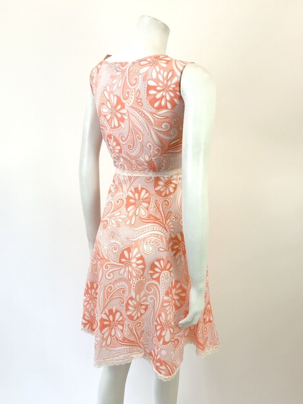 VTG 60s 70s PINK ORANGE WHITE PSYCHEDELIC FLORAL PAISLEY LACE MOD DRESS 10 12