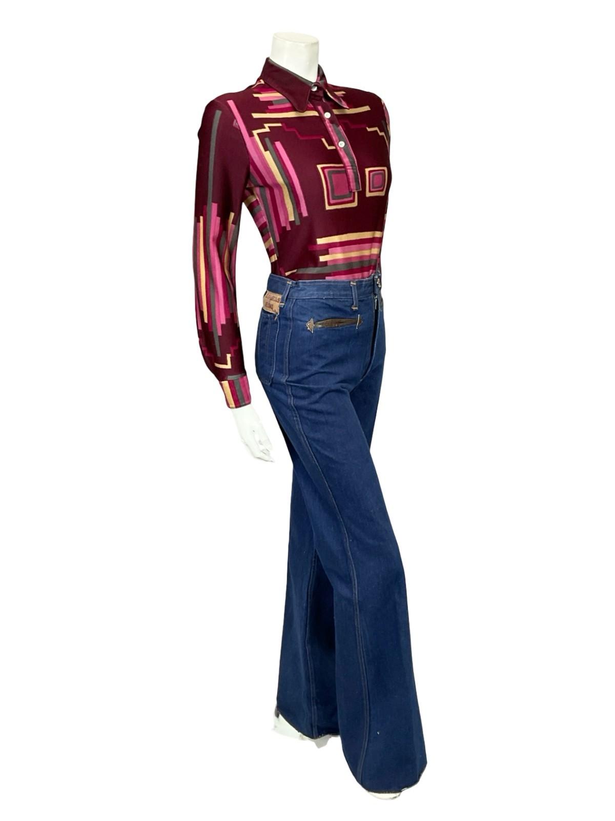 This is a lovely 60s 70s long sleeve shirt with a dog ear collar and geometric print. This shirt is made from a blend of 70% triacetate and 30% synthetics, featuring a print of stripes, zigzags and cubes in plum, pink, beige and grey. This shirt has no inner lining, and fastens below the collar with 3 pearlescent buttons, with one button on either cuff.
