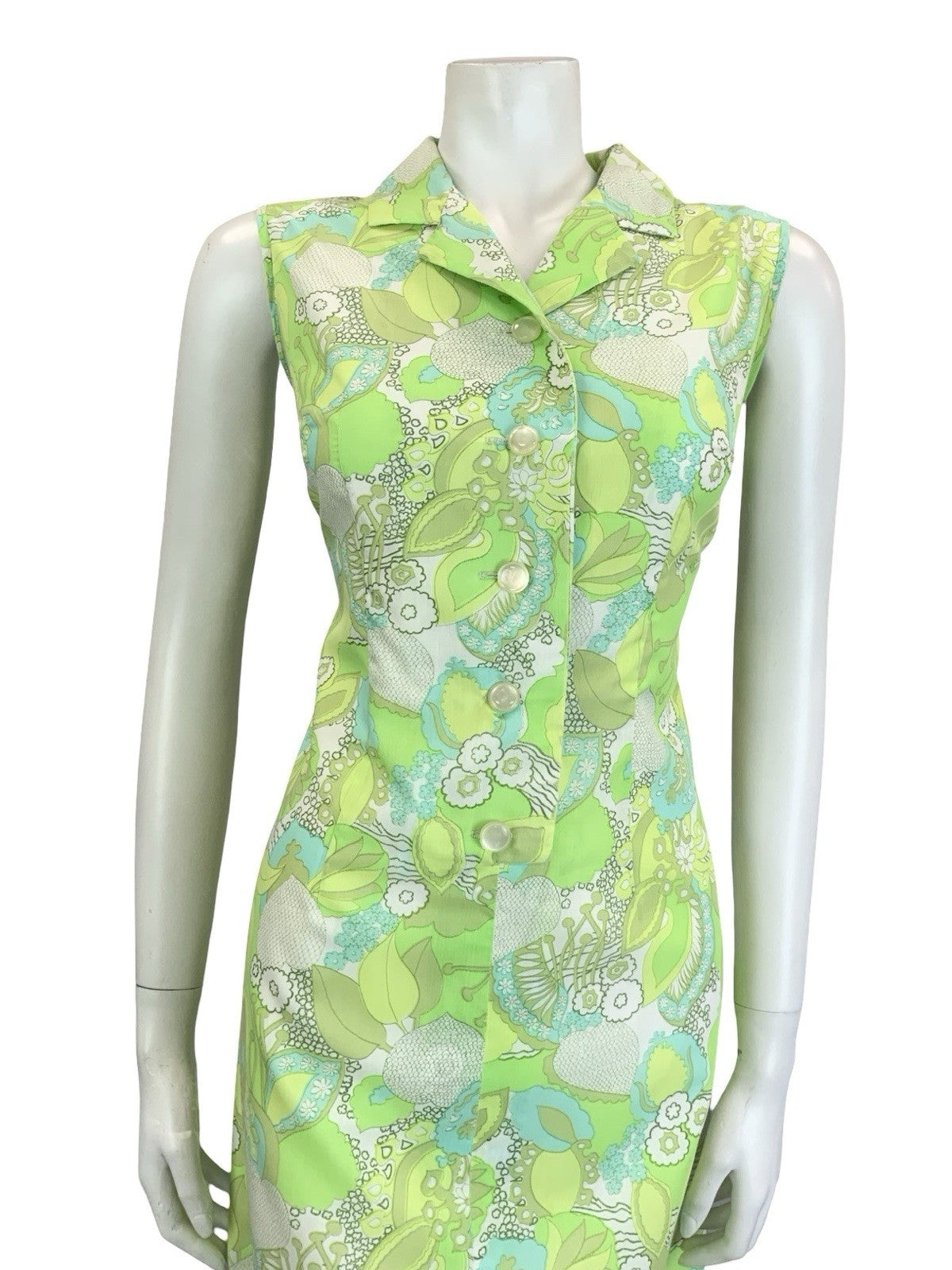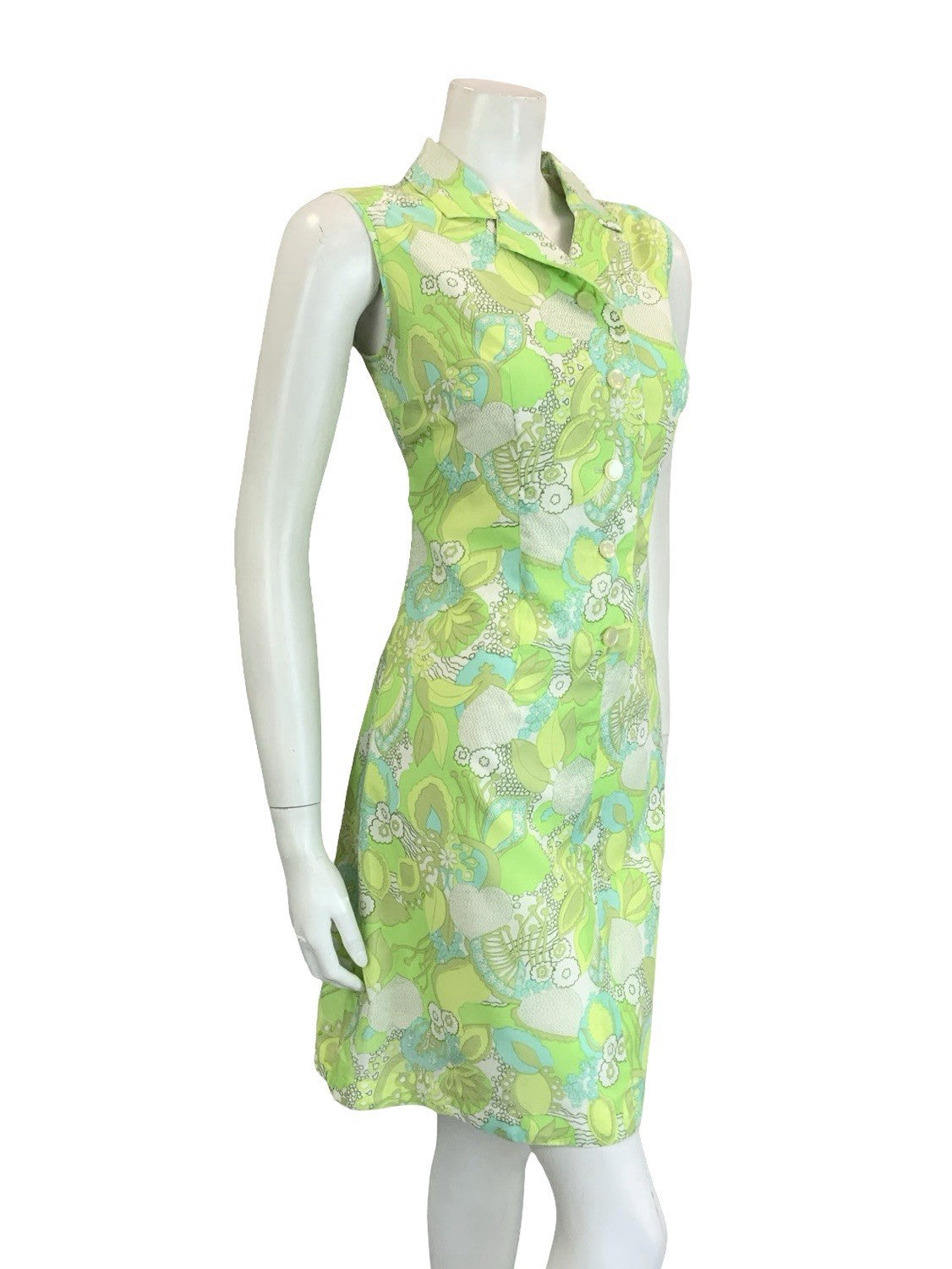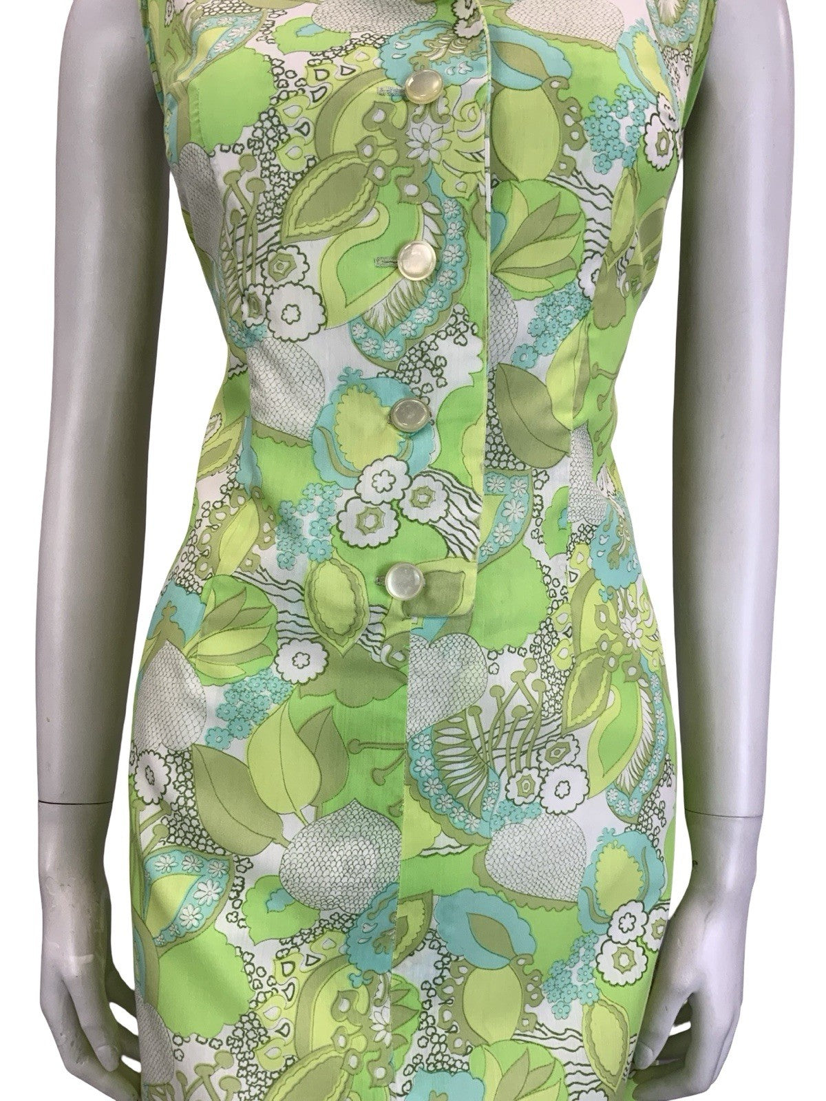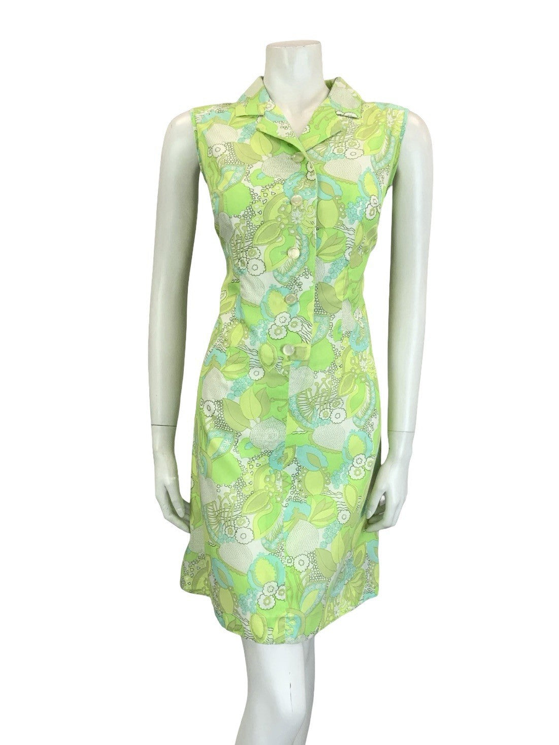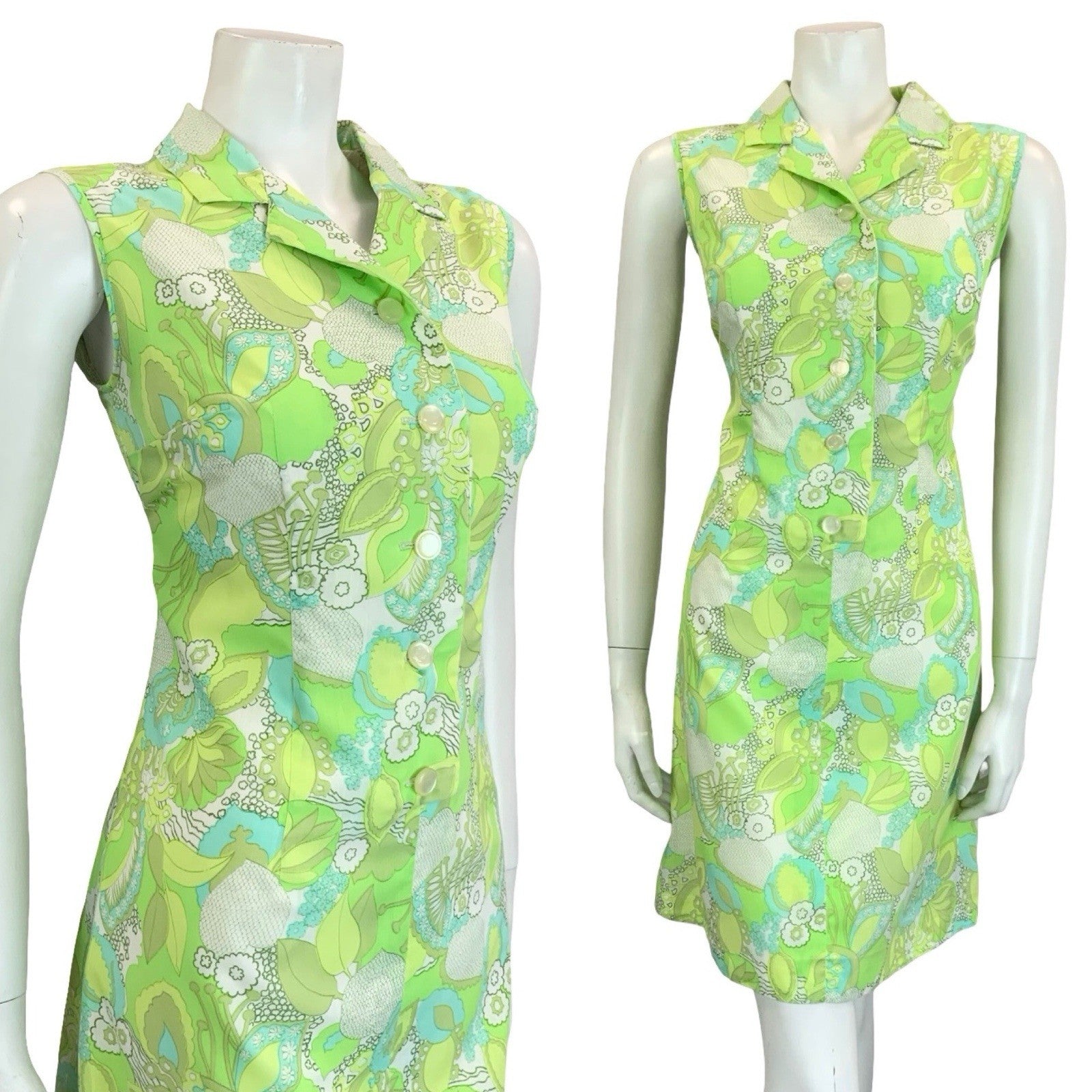 VTG 60S 70S PSYCHEDELIC FLORAL LEAFY GREEN WHITE MOD SHIFT DRESS 10