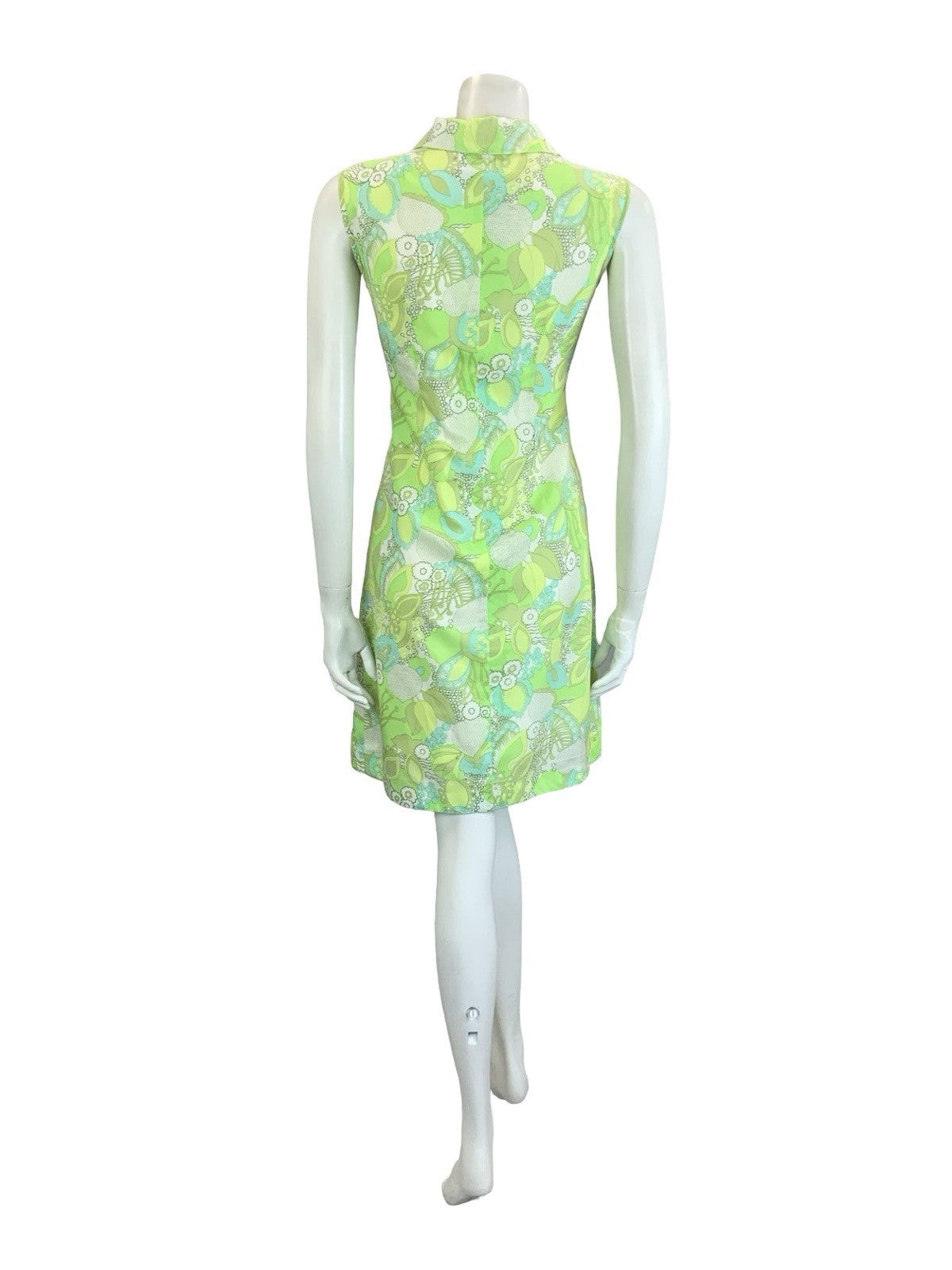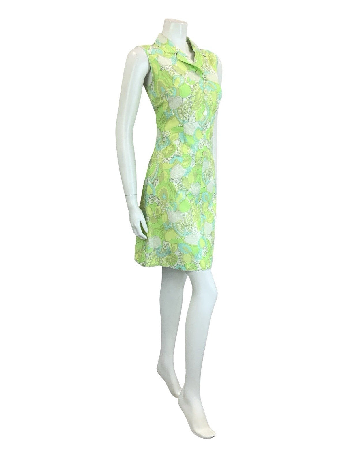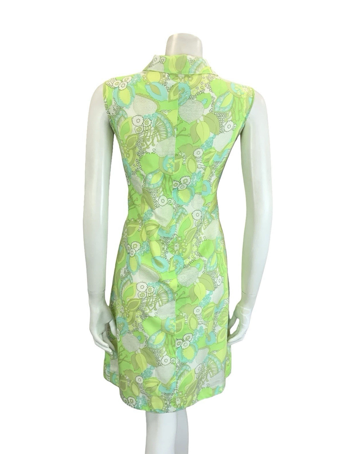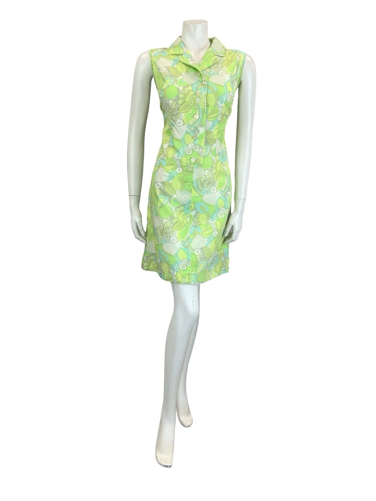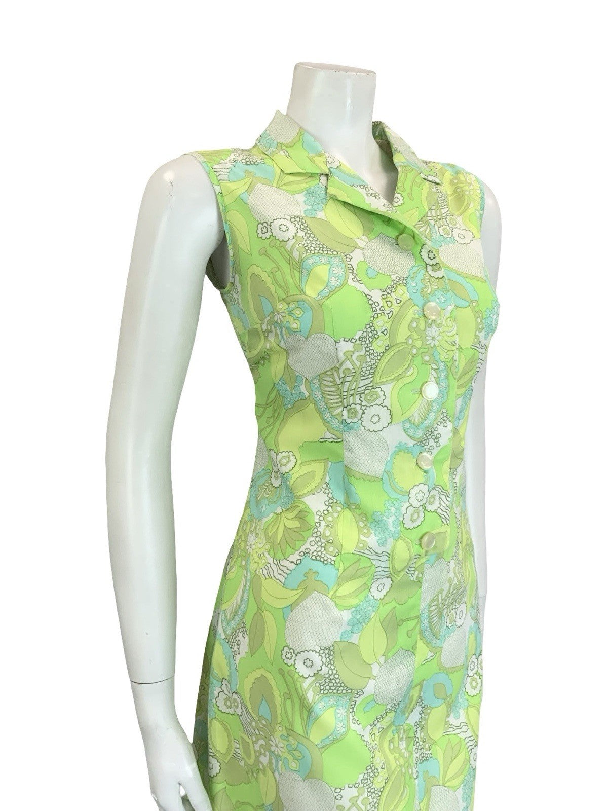 VTG 60S 70S PSYCHEDELIC FLORAL LEAFY GREEN WHITE MOD SHIFT DRESS 10