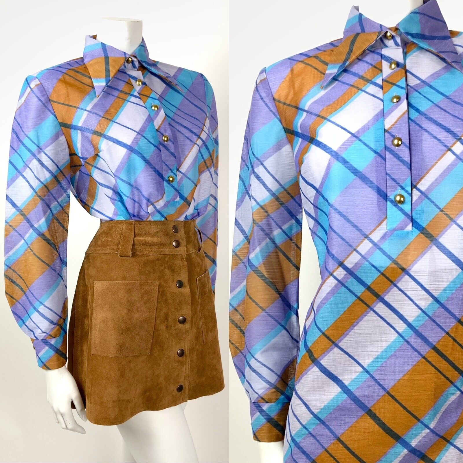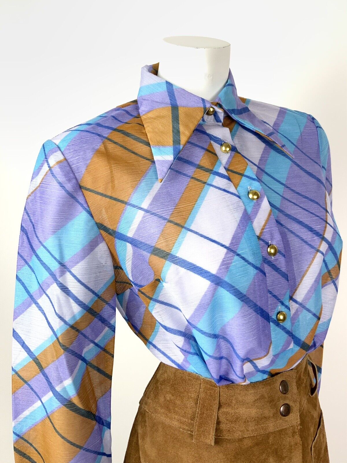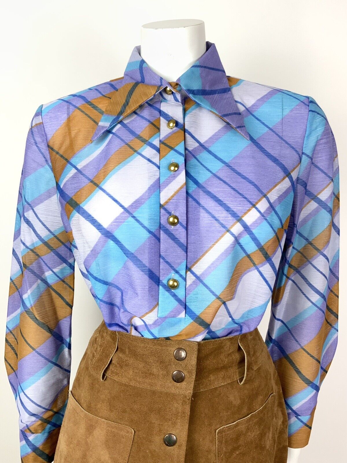 VTG 60s 70s PURPLE BLUE BRONZE CHECKED PLAID DAGGER COLLAR SHIRT BLOUSE 12 14