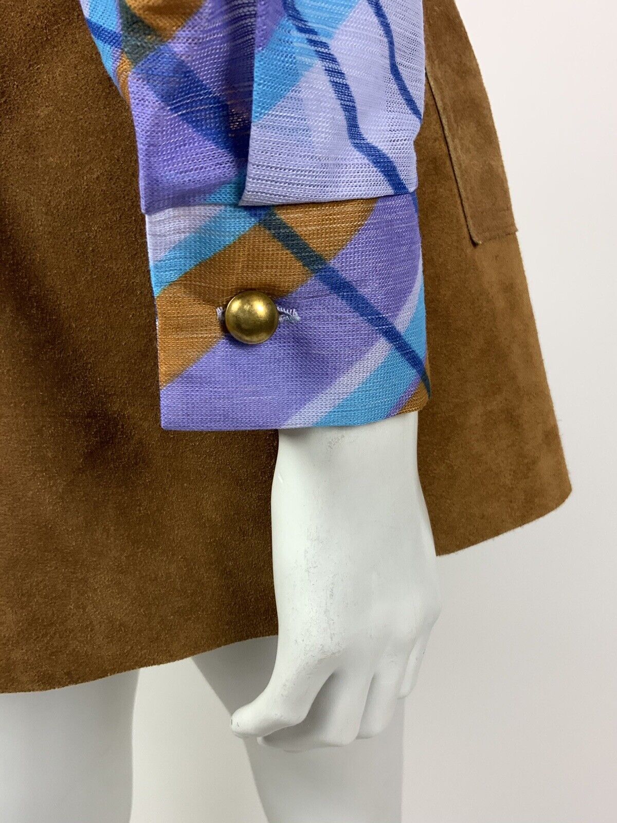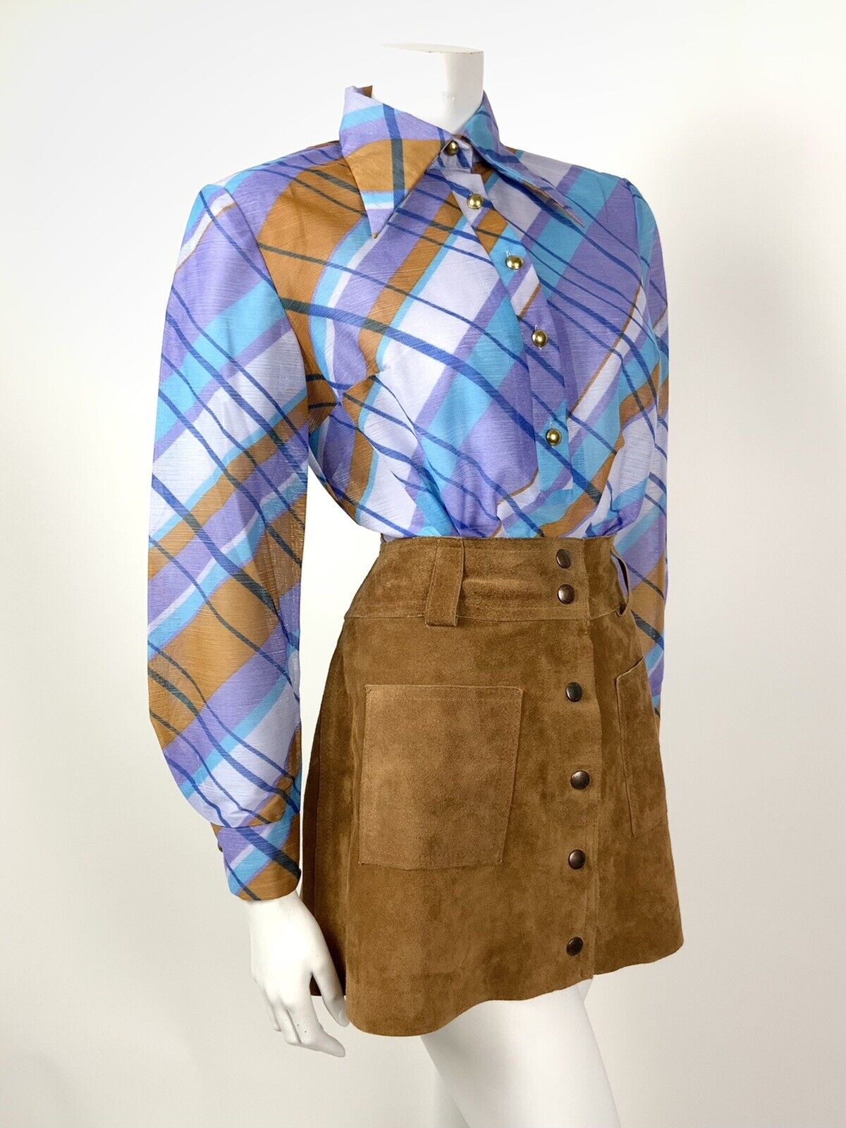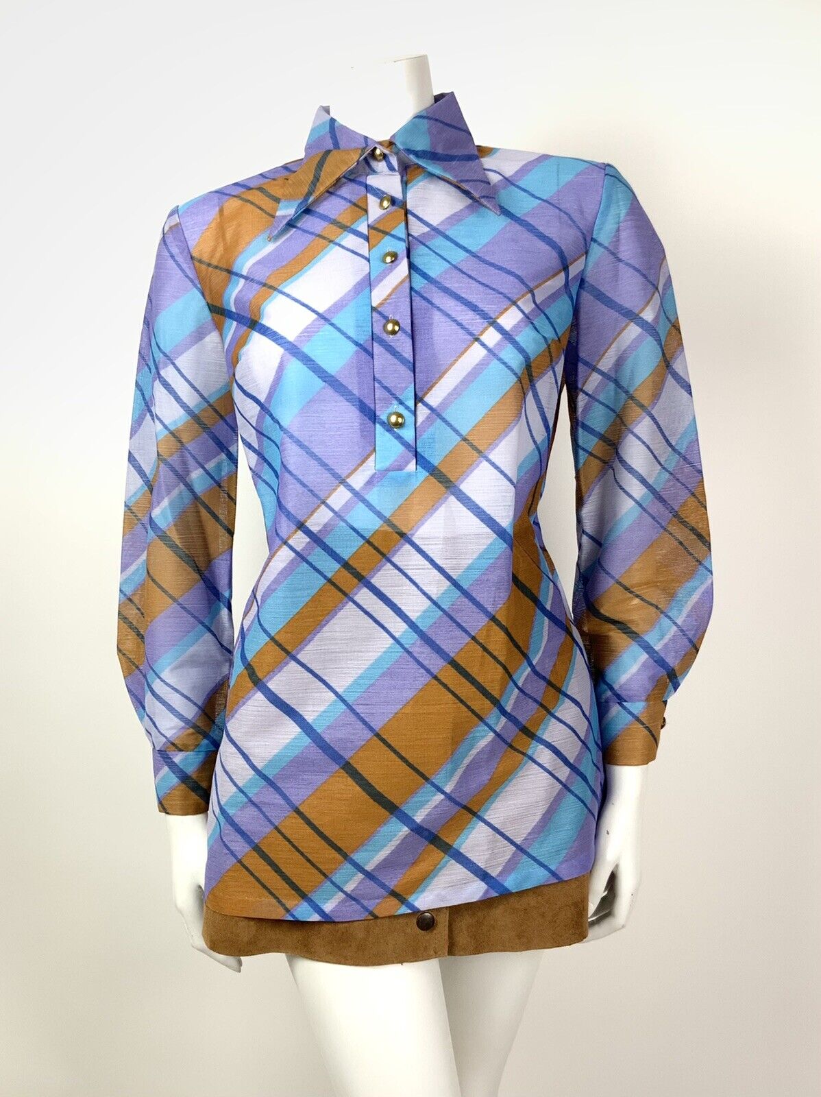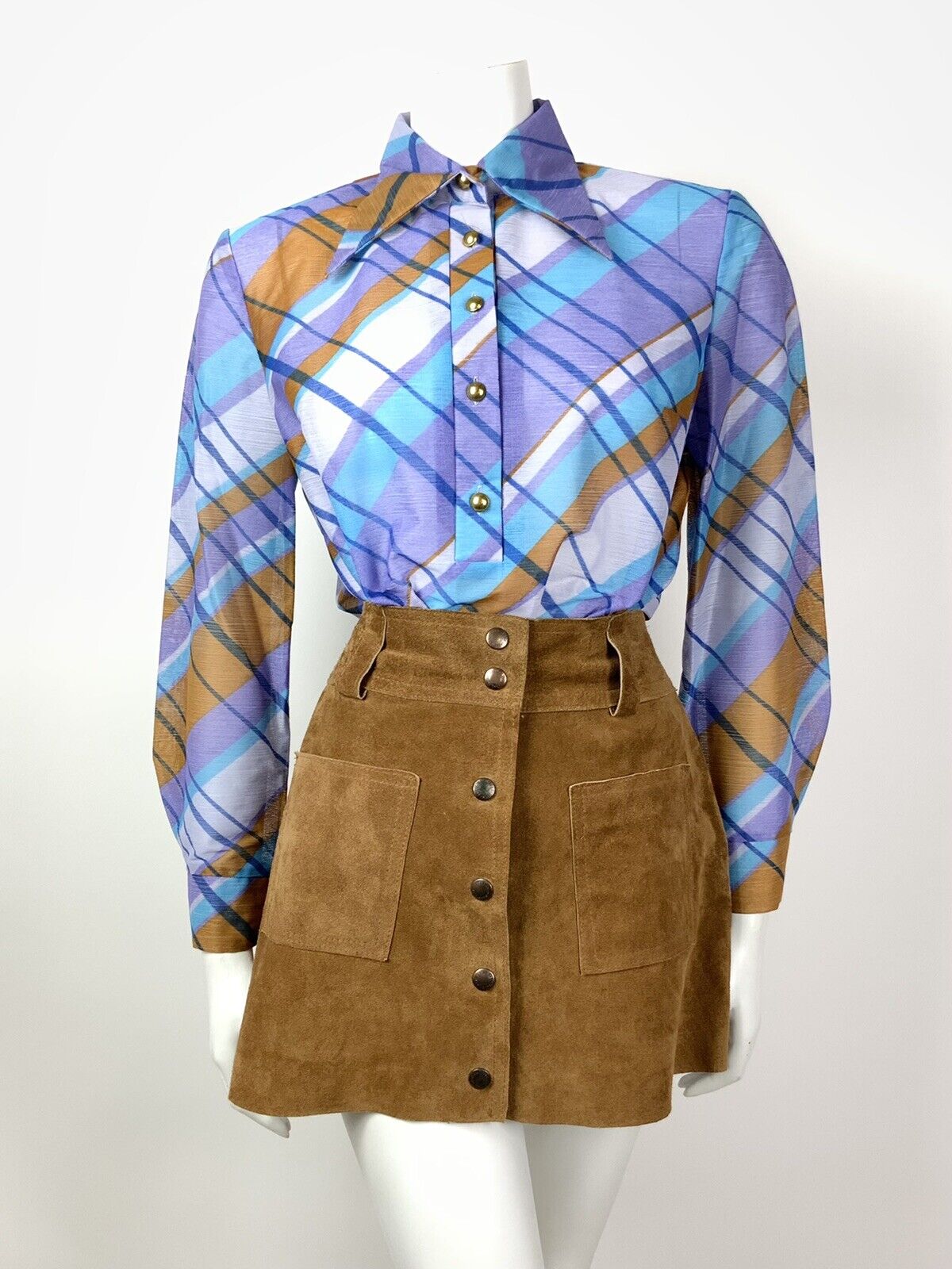 VTG 60s 70s PURPLE BLUE BRONZE CHECKED PLAID DAGGER COLLAR SHIRT BLOUSE 12 14