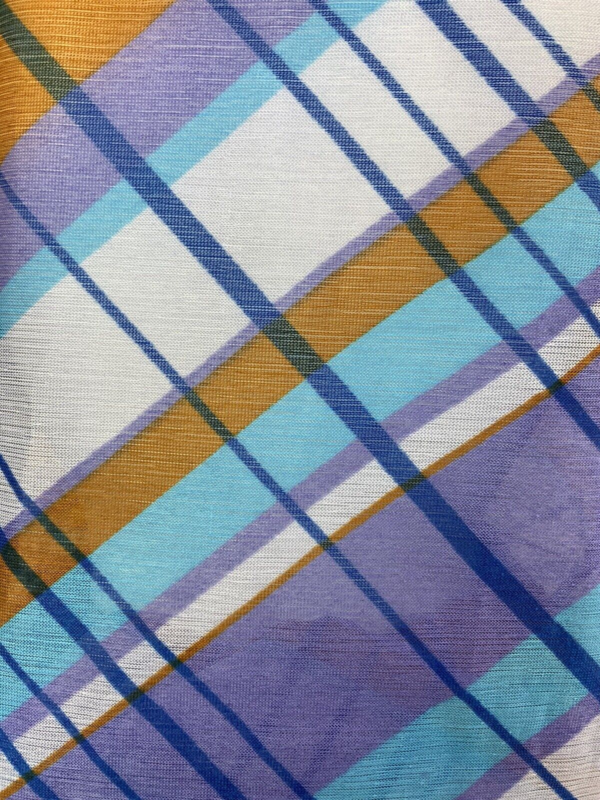 Covering the shirt is a bright checked plaid pattern in cool tones of purple, blue, and bronze.