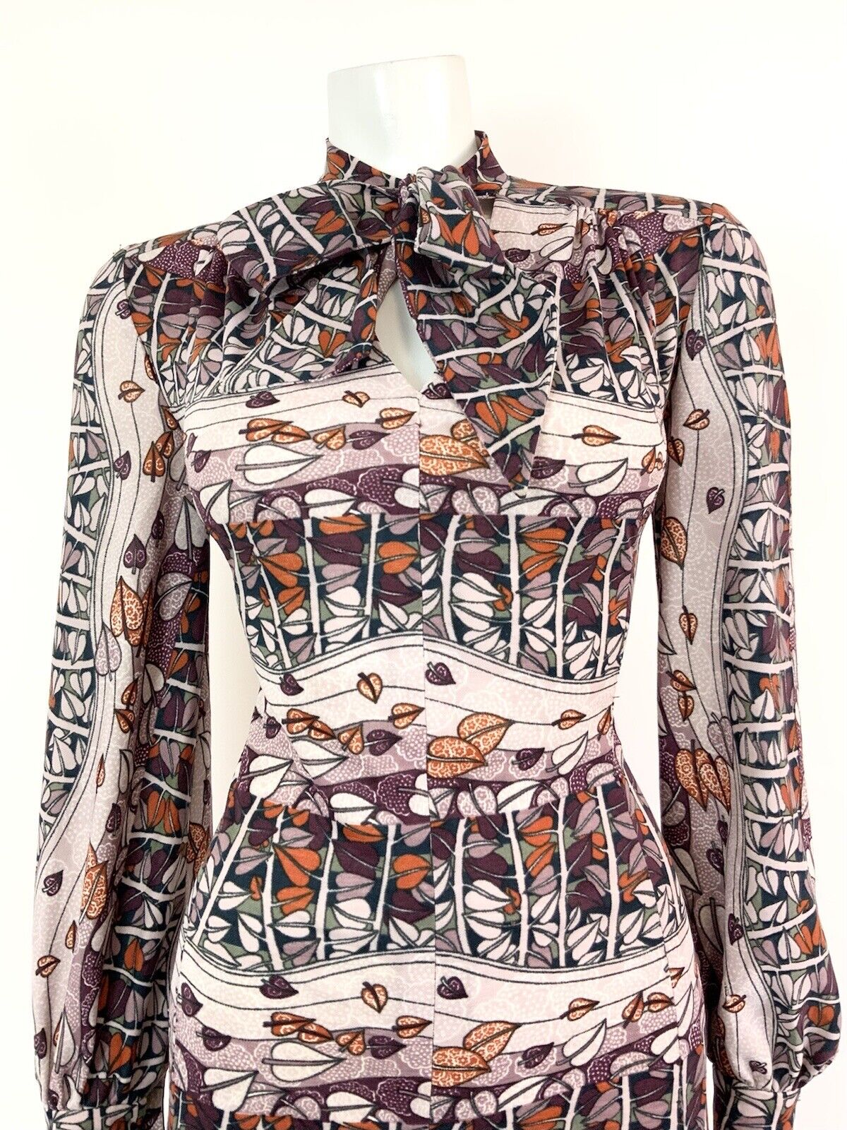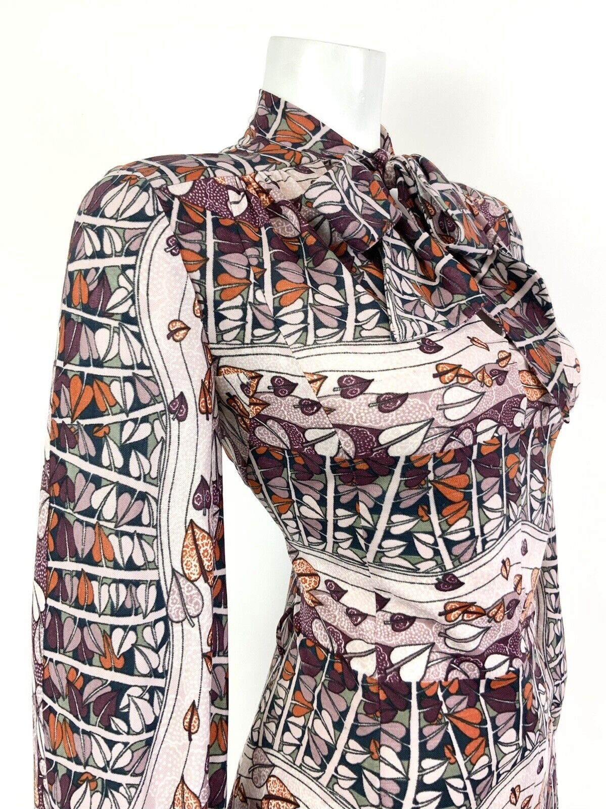 VTG 60s 70s PURPLE PINK ORANGE LEAFY TREE VINE PSYCHEDELIC PUSSYBOW DRESS 14 16