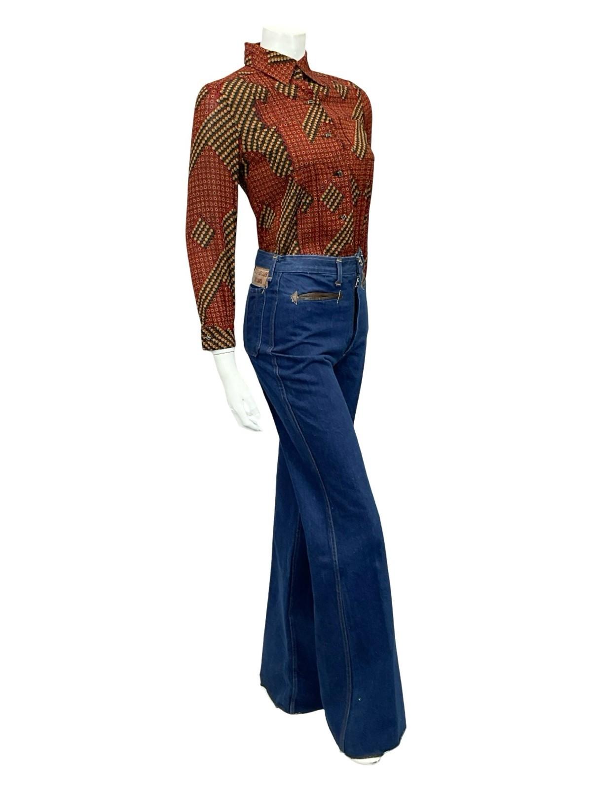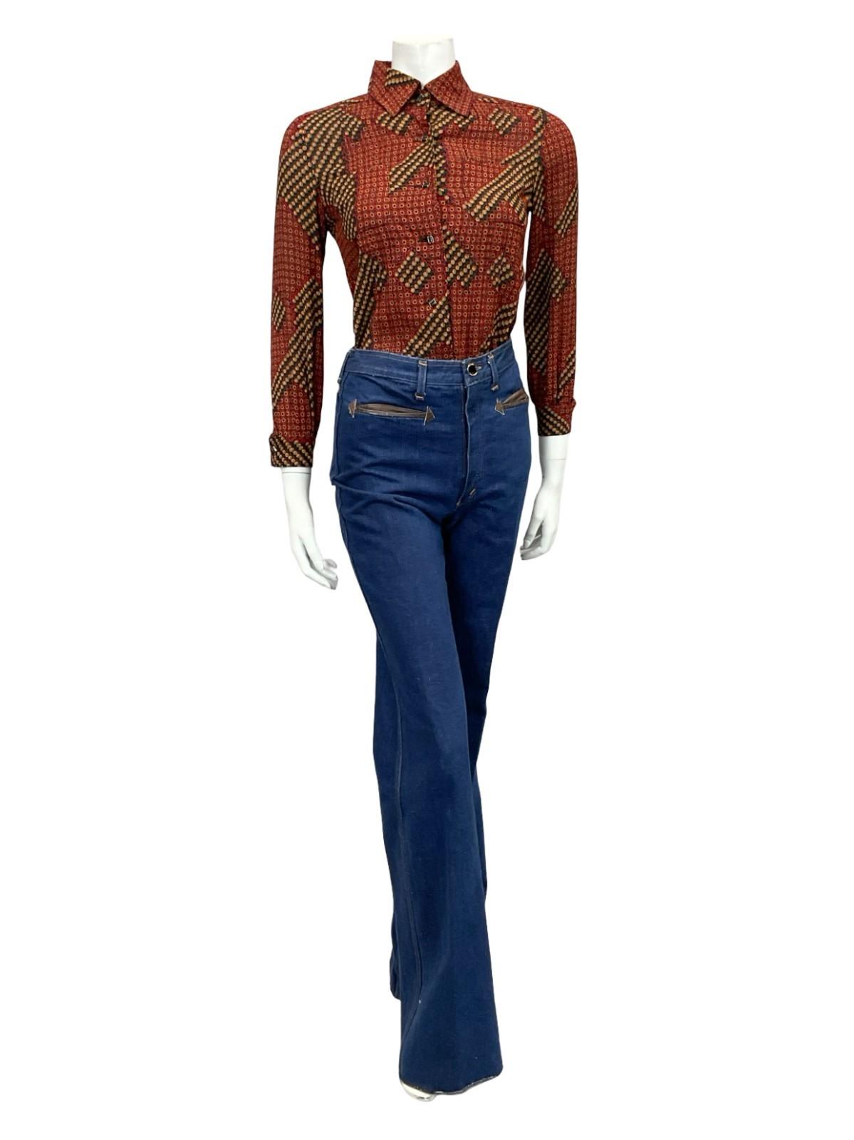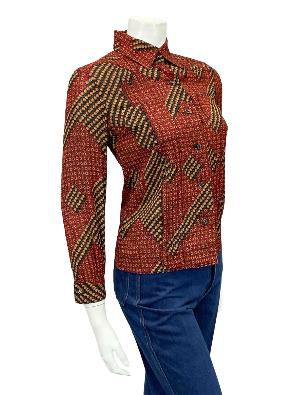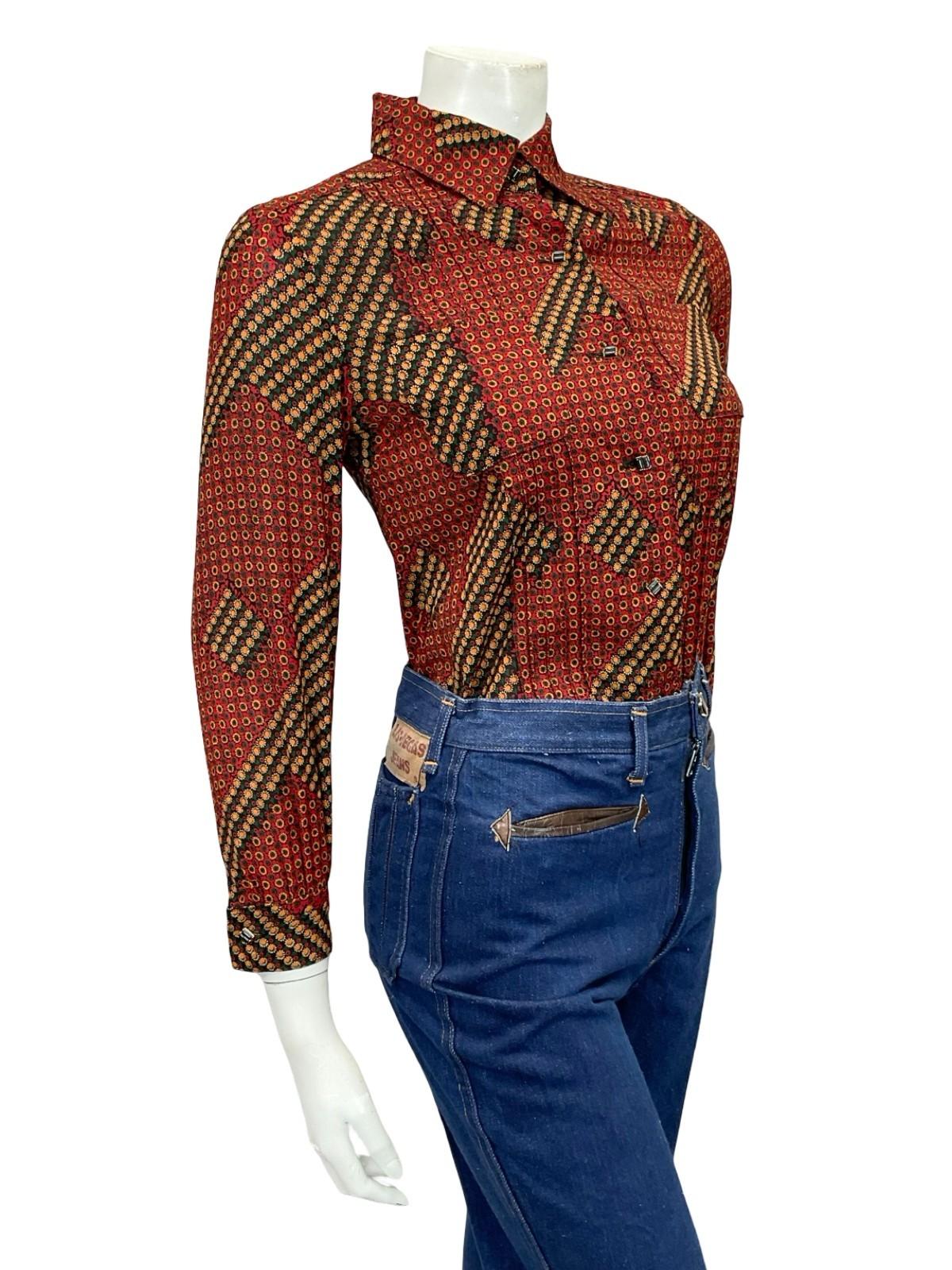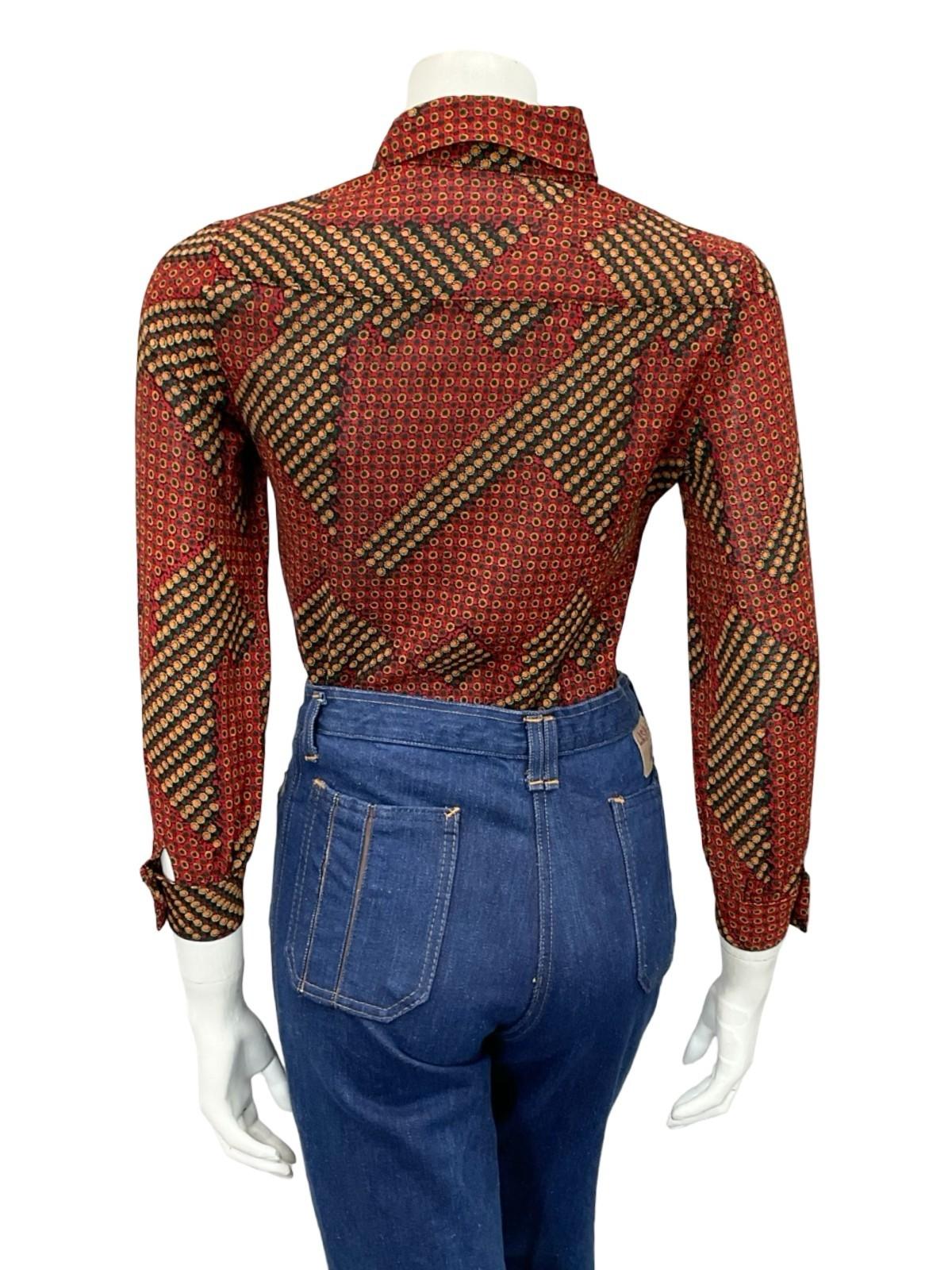 VTG 60S 70S RED GREEN BLACK YELLOW WHITE GEOMETRIC DAISY FLORAL SHIRT 6 XS