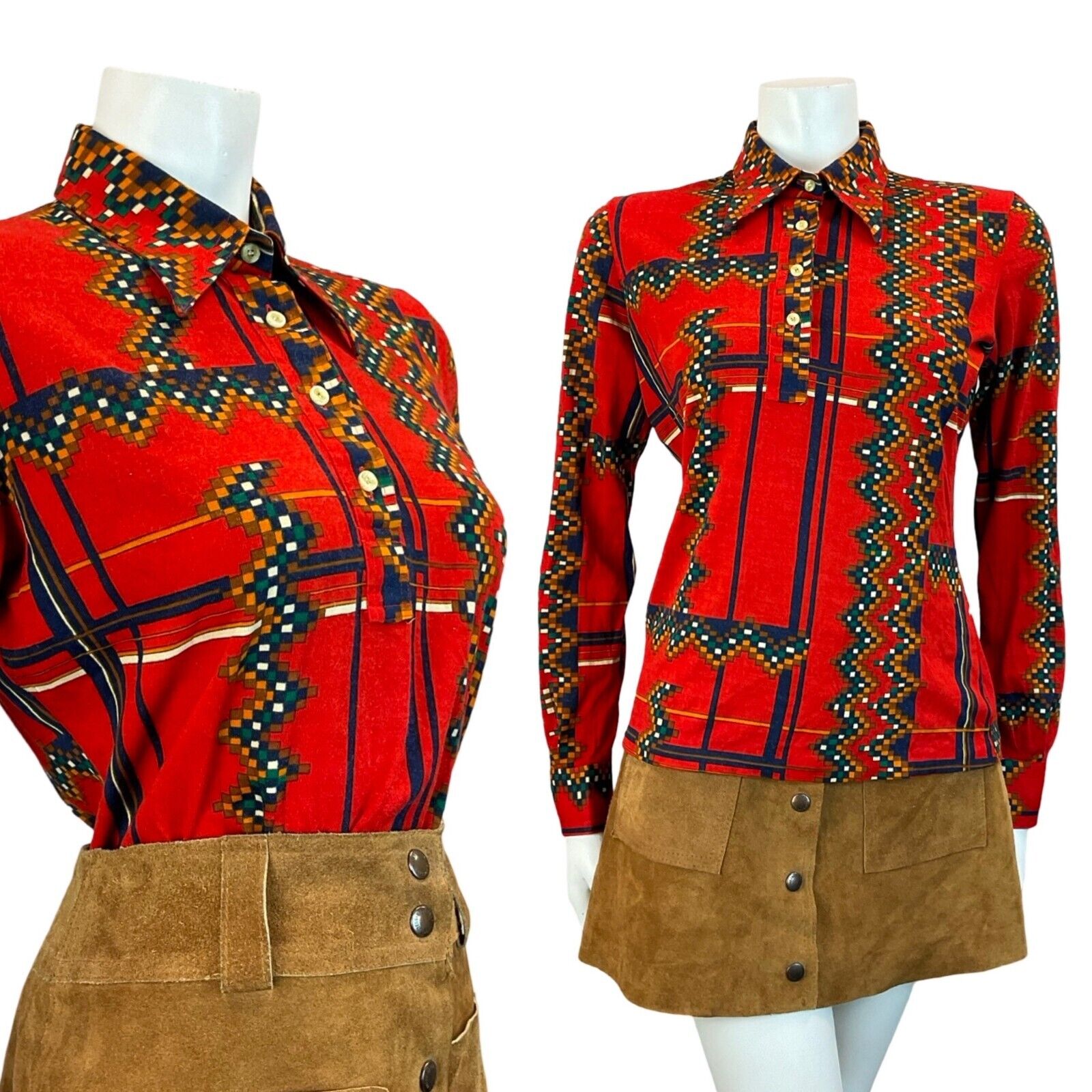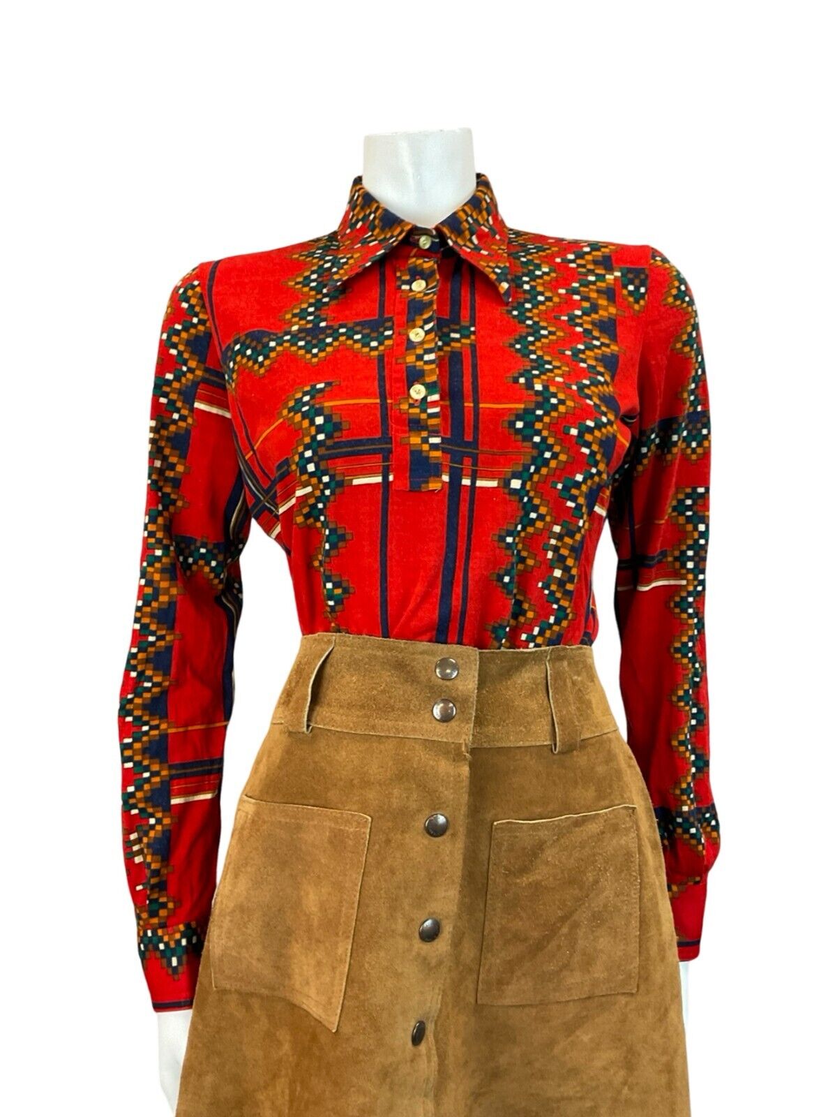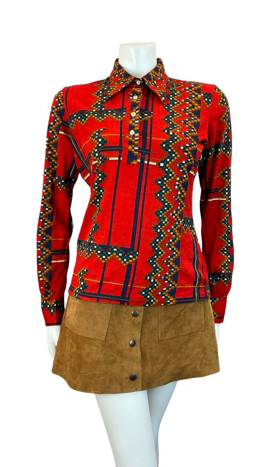 VTG 60S 70S RED NAVY BLUE GREEN PSYCHDELIC GEOMETRIC DAGGER COLLAR SHIRT 12