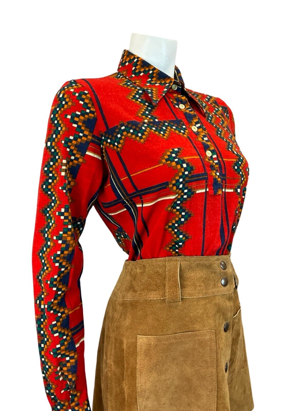 This is a wonderful 60s 70s psychedelic, dagger collared shirt made from a geometric red, navy blue and green polycotton. This shirt quarter fastens with 4 cream coloured buttons at the chest, and a cream button on each cuff.