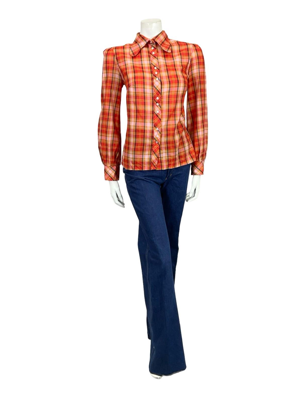 This is a cute 60s 70s long sleeve shirt with a dog ear collar and plaid print in red, pink, yellow and black. The shirt is made from a 65% polyester 35% cotton blend. There are 12 white buttons down the front of the shirt, and one button on either cuff to fasten you in.