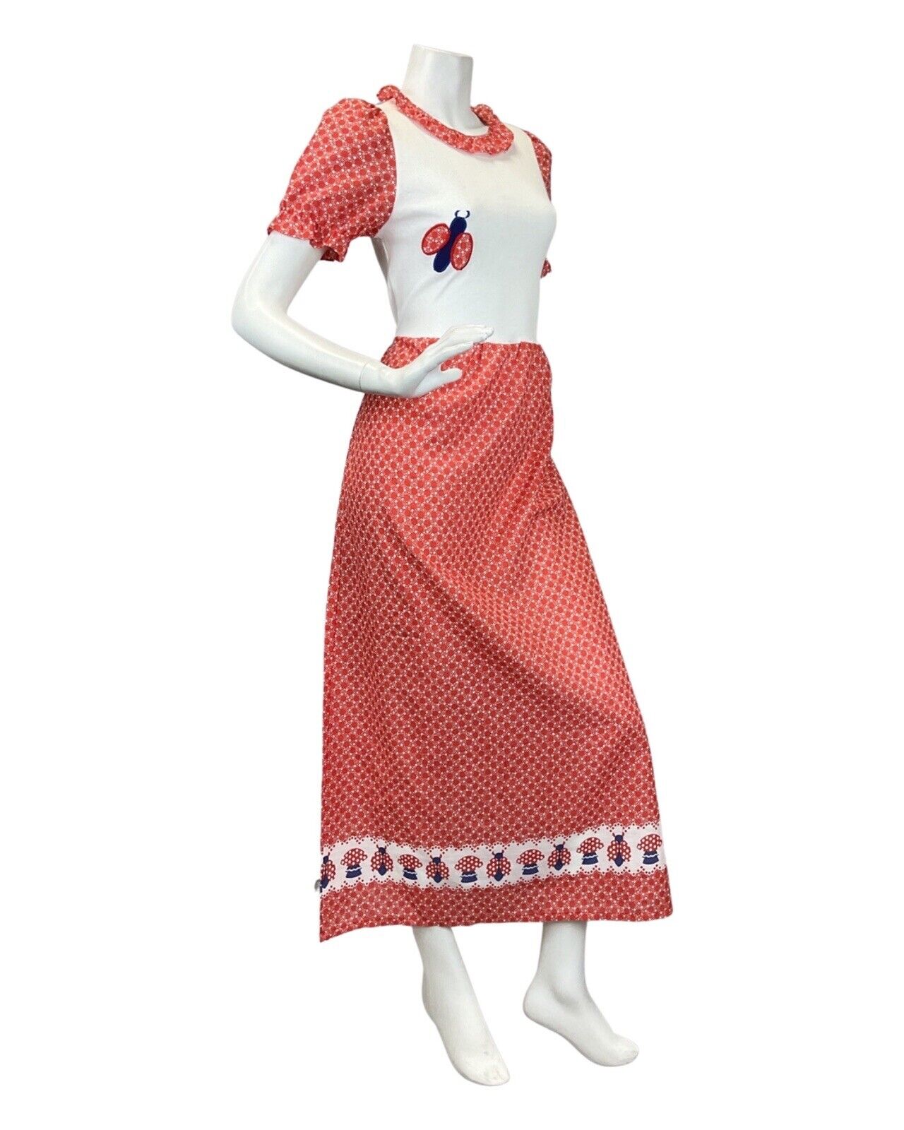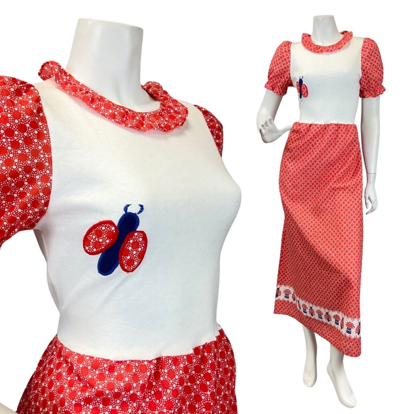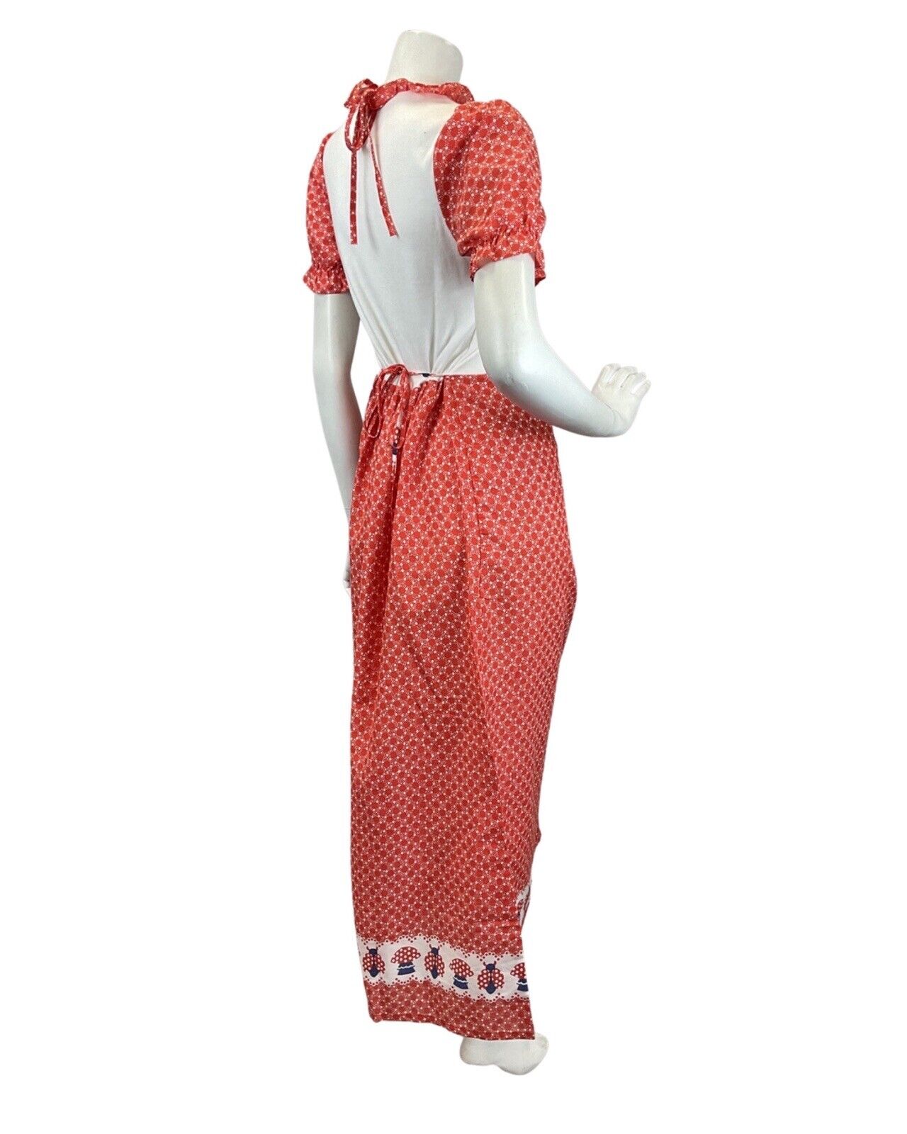 VTG 60s 70s RED WHITE BLLUE DOTTY LADYBIRD MUSHROOM MOD PRAIRIE MAXI DRESS 8 10