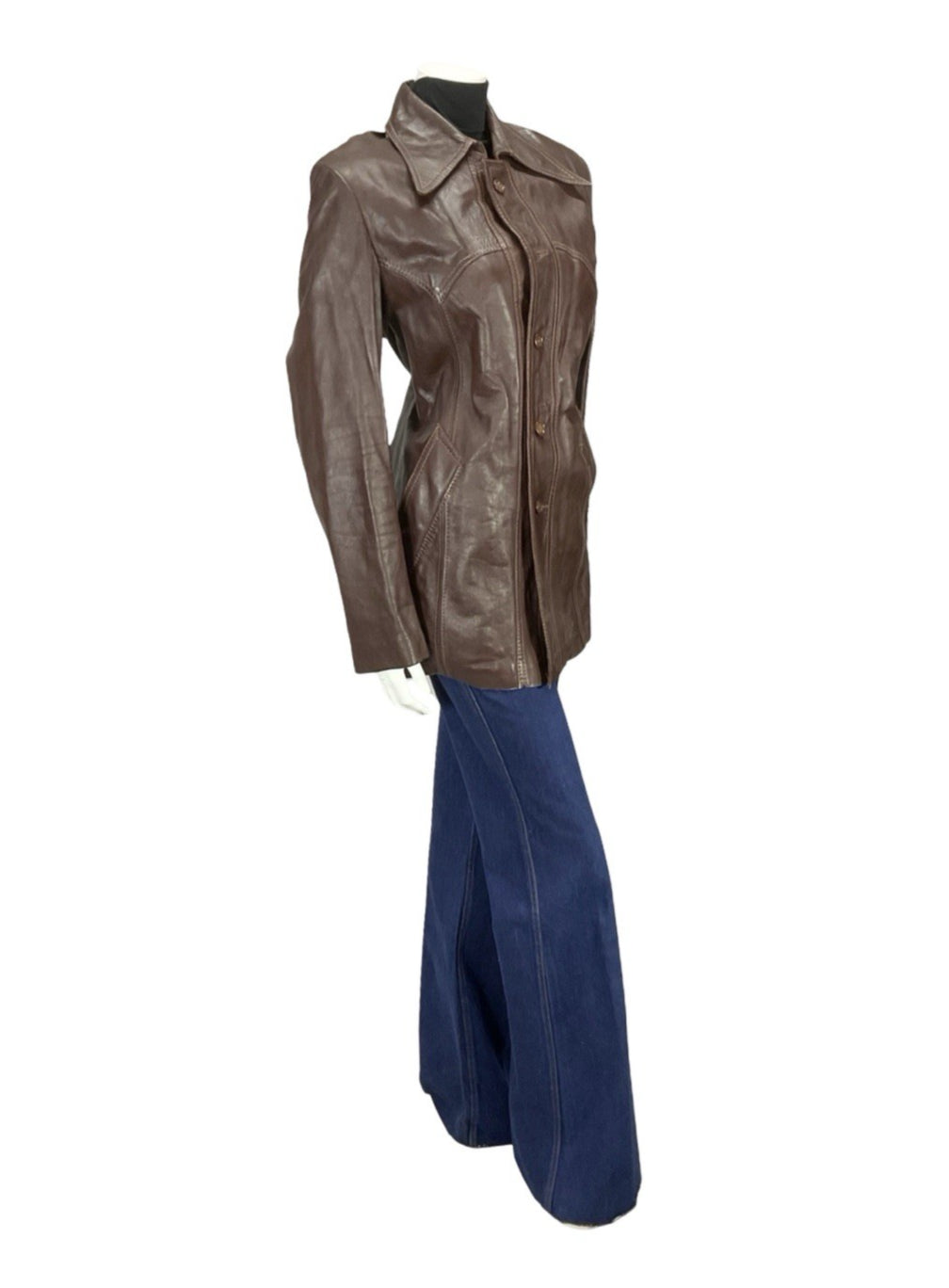This is a fantastic 60s 70s reddish brown leather jacket with a long dagger collar and slanted pockets. This jacket has a boxy cut, reflected in the measurements, and has. Western feel to it from the shapes of the seams. This jacket is lined with a dark brown synthetic fabric, and features an inner welt pocket. There are 4 brown buttons to fasten you in, with the second button down missing.
