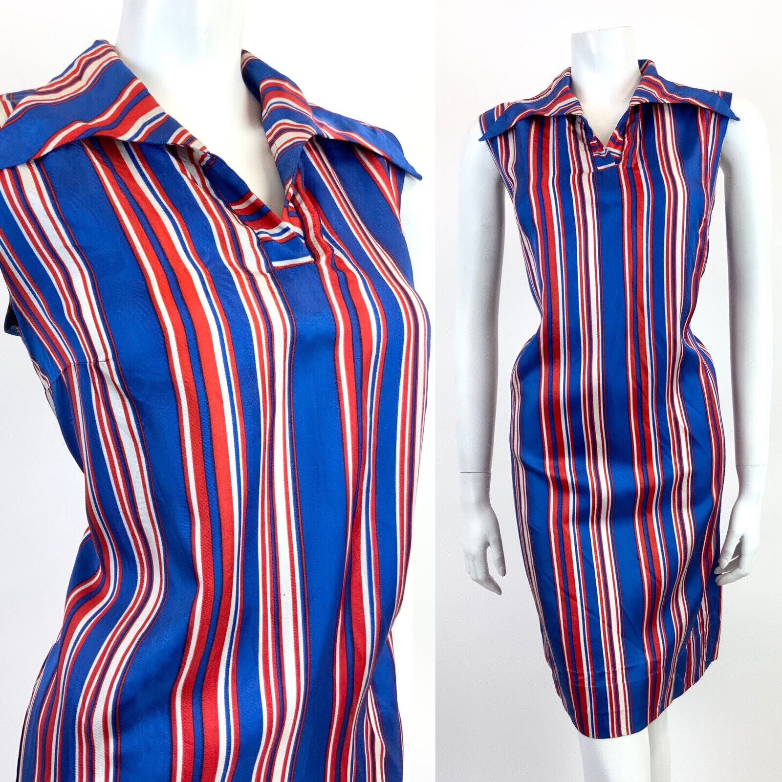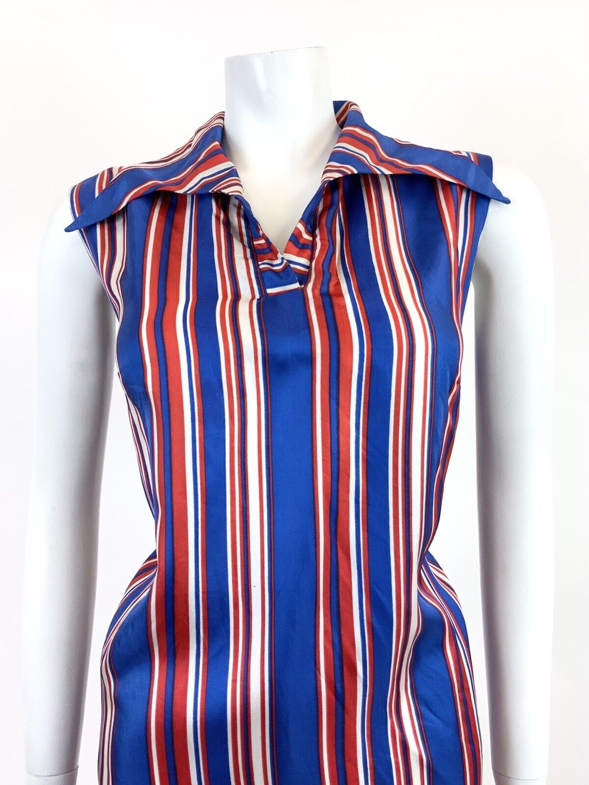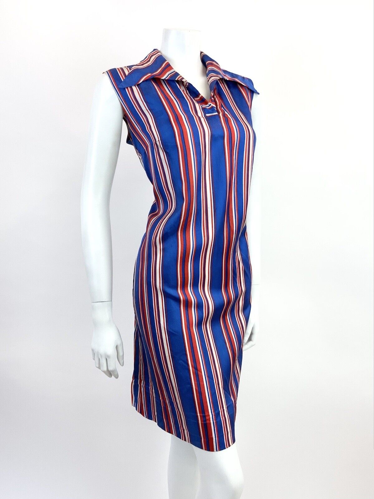 VTG 60s 70s ROYAL BLUE RED WHITE STRIPED WING COLLAR MOD SHIRT SHIFT DRESS 12 14