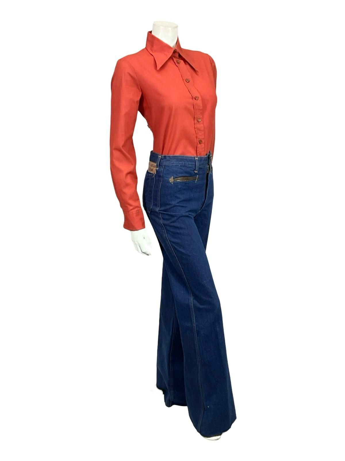 This is a gorgeous 60s 70s long sleeve shirt with a dagger collar in a classic rusty red/brown colour. This shirt has no material composition label, but feels to be made from a polycotton blend. There are 7 colour matched buttons down the front, alongside one button on either cuff.