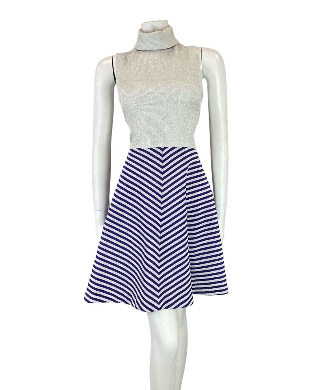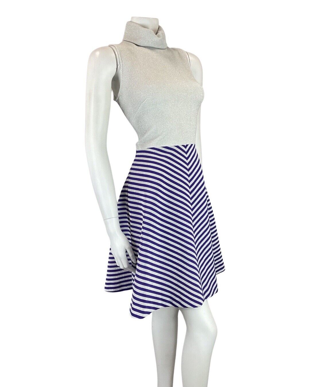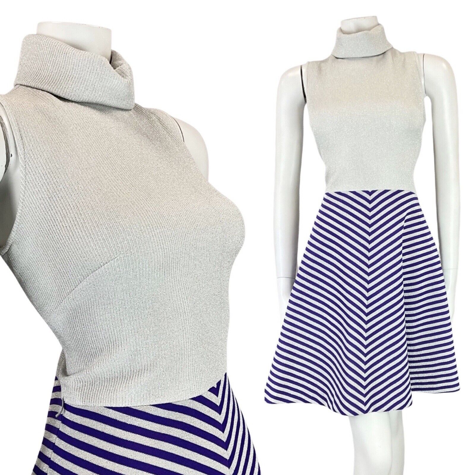 VTG 60s 70s SILVER PURPLE STRIPED LUREX TURTLENECK FIT & FLARE MOD DRESS 8 10