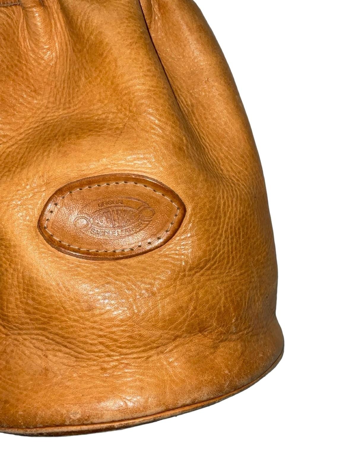 This is a cute 60s 70s tan brown leather drawstring pouch bag with an adjustable strap and accompanying purse. This bag opens to reveal one unlined compartment.