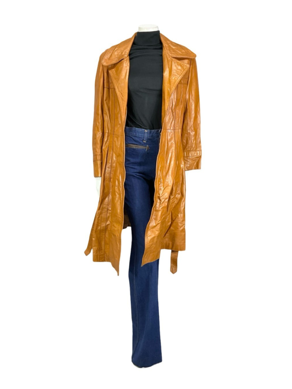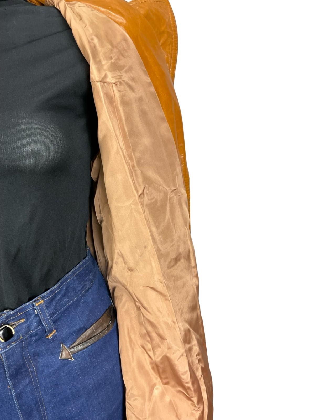 This is a lovely 70s tan brown leather trench coat with a notch lapel collar and matching leather tie. This jacket has no buttoning at the front, wrapping close and tying at the waist. This jacket is lined with a shiny brown synthetic fabric, ensuring you have comfort throughout wear. This is a perfect choice for any vintage lover looking for outerwear that showcases the figure, as well as providing stylish protection from the elements.