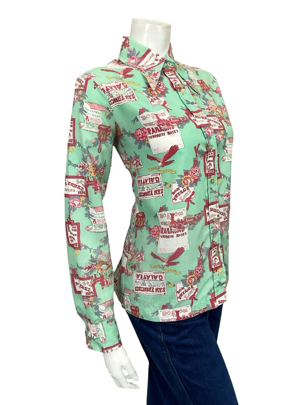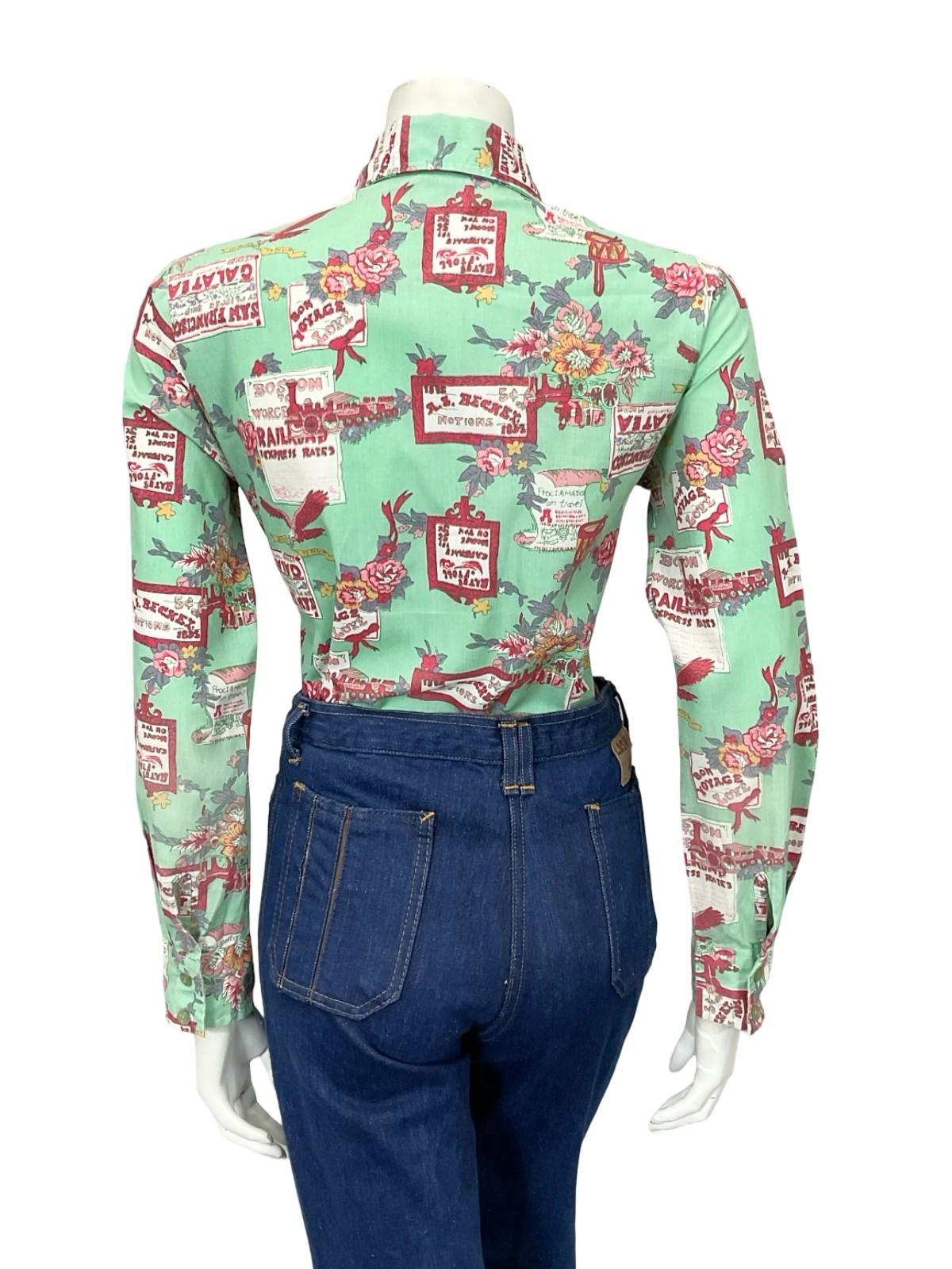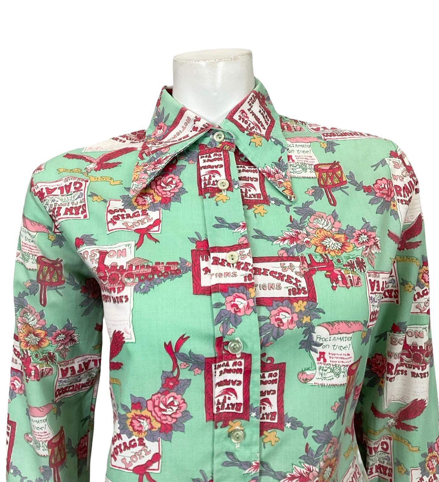 This is a cute 60s 70s long sleeve dagger collar shirt made from a light teal 65% polyester 35% cotton blend fabric, printed with magenta pink, purple and beige florals, birds and signs. This shirt buttons down the front via 7 small light green buttons, with two matching buttons on either cuff.