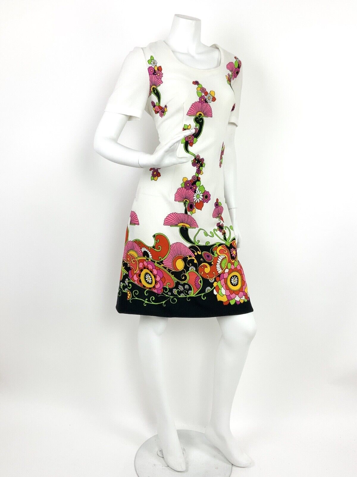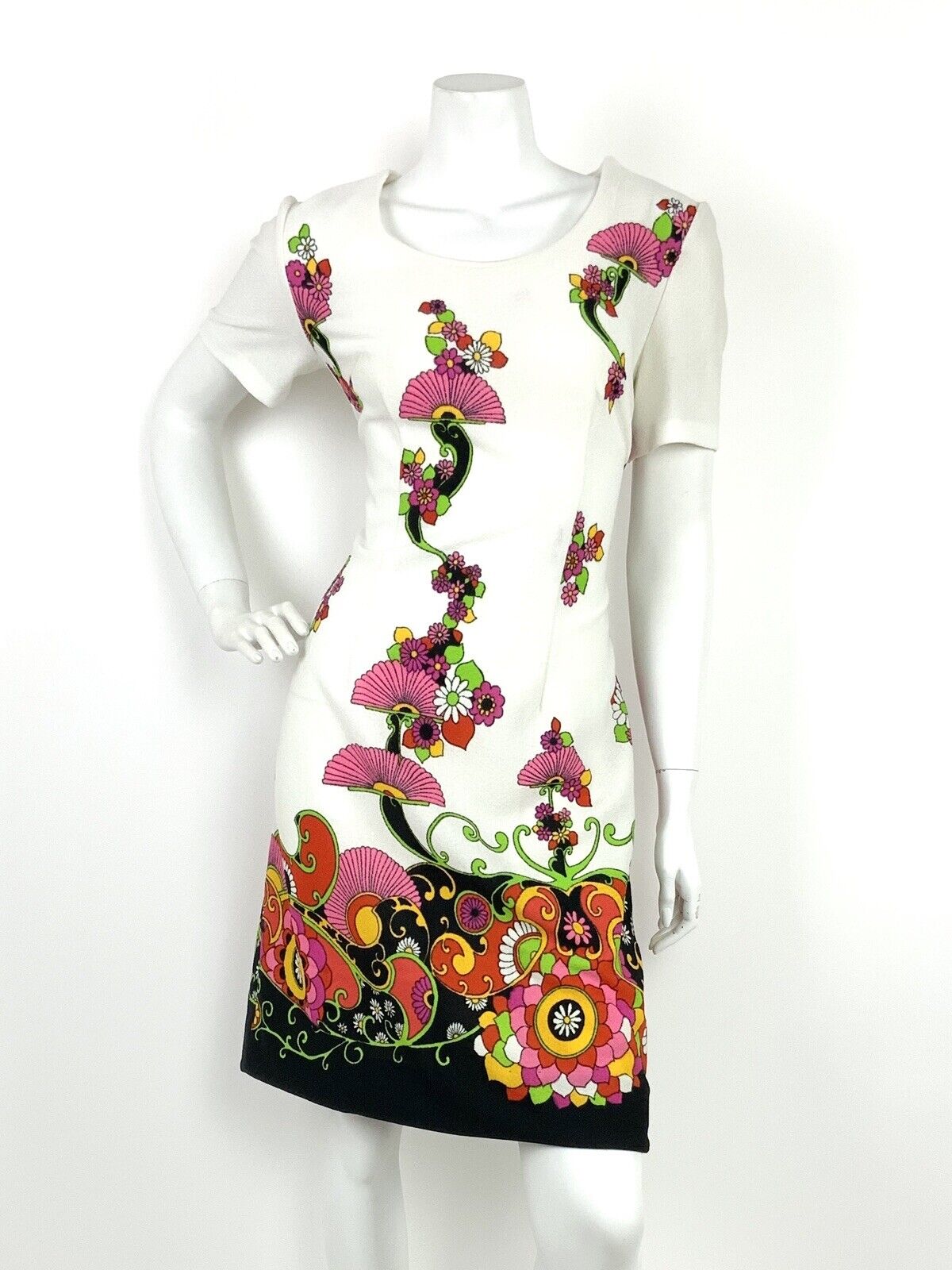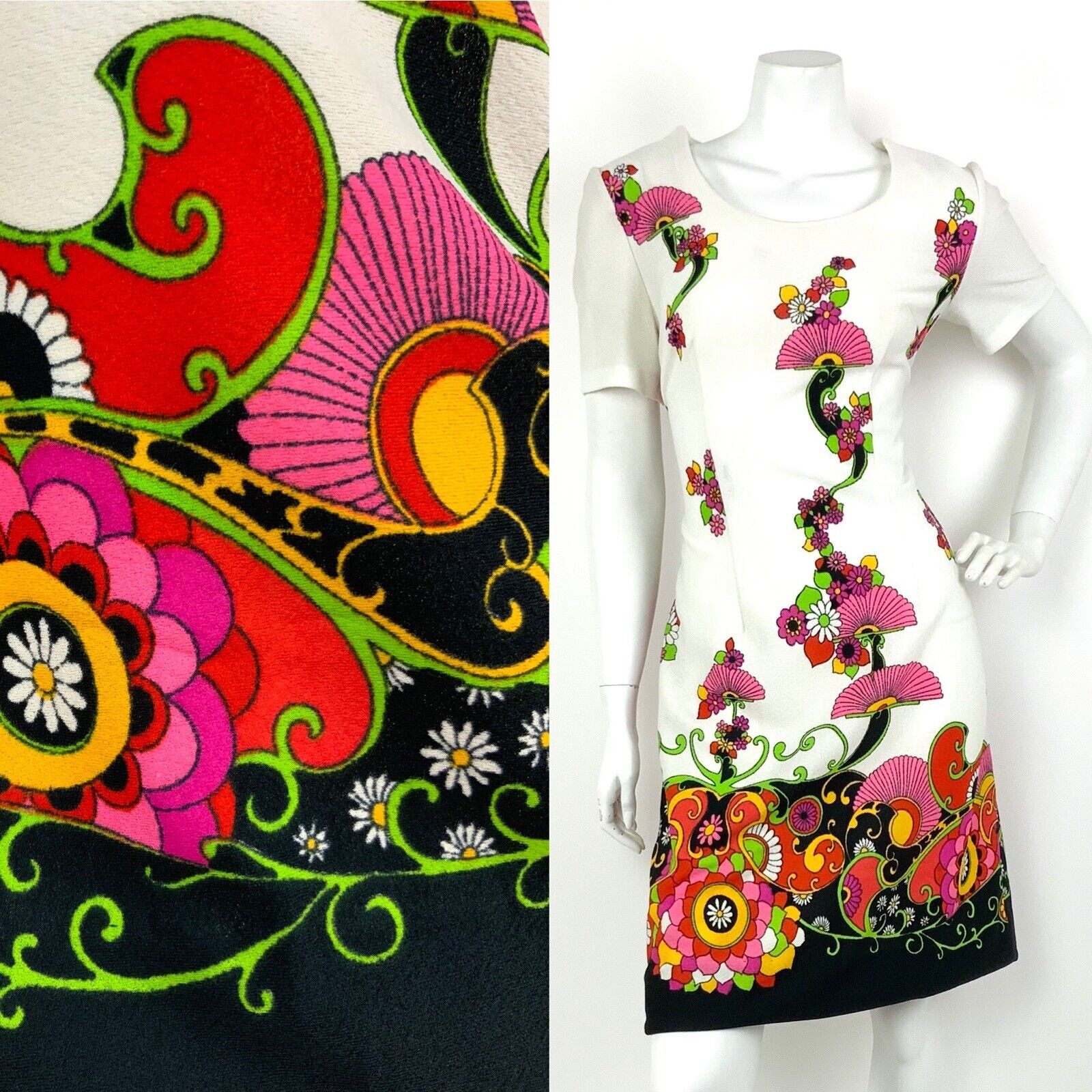 VTG 60s 70s WHITE BLACK PINK YELLOW RED FLORAL PSYCHEDELIC PAISLEY DRESS 12 14