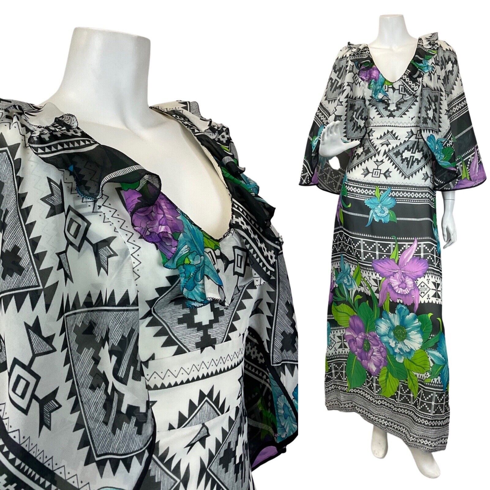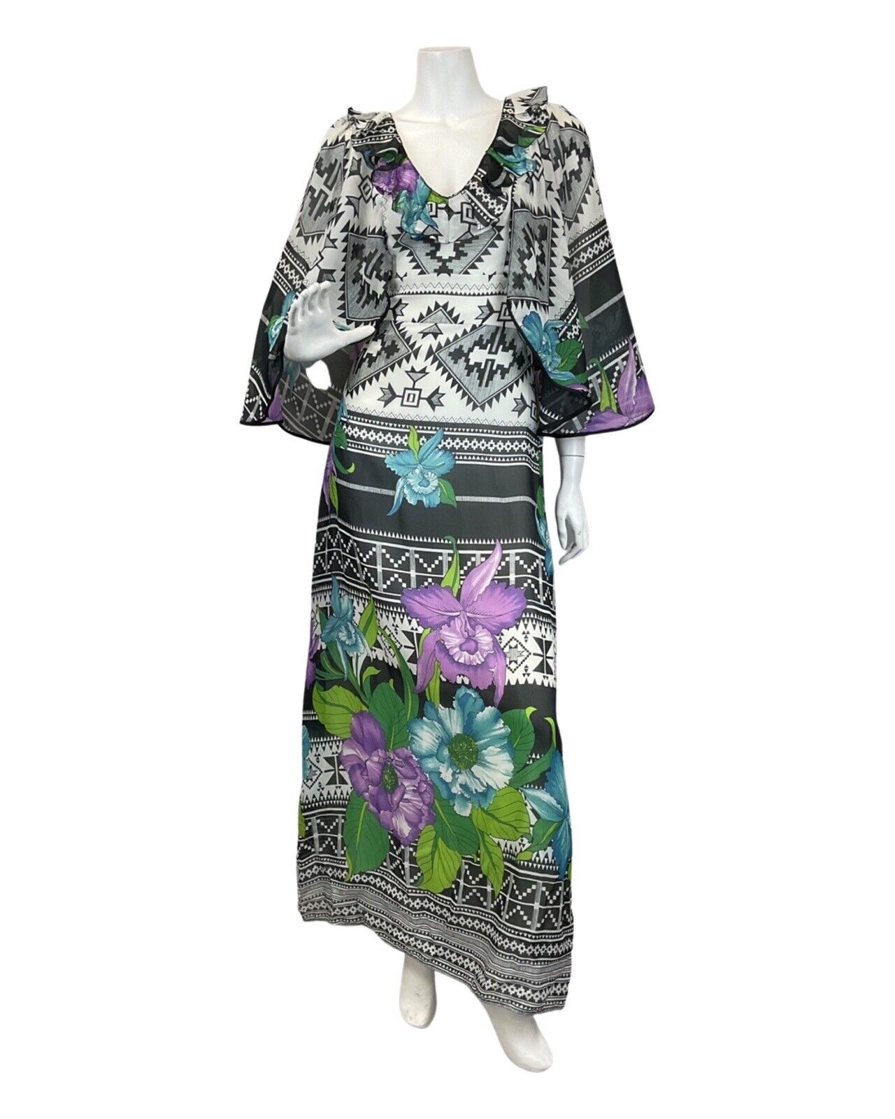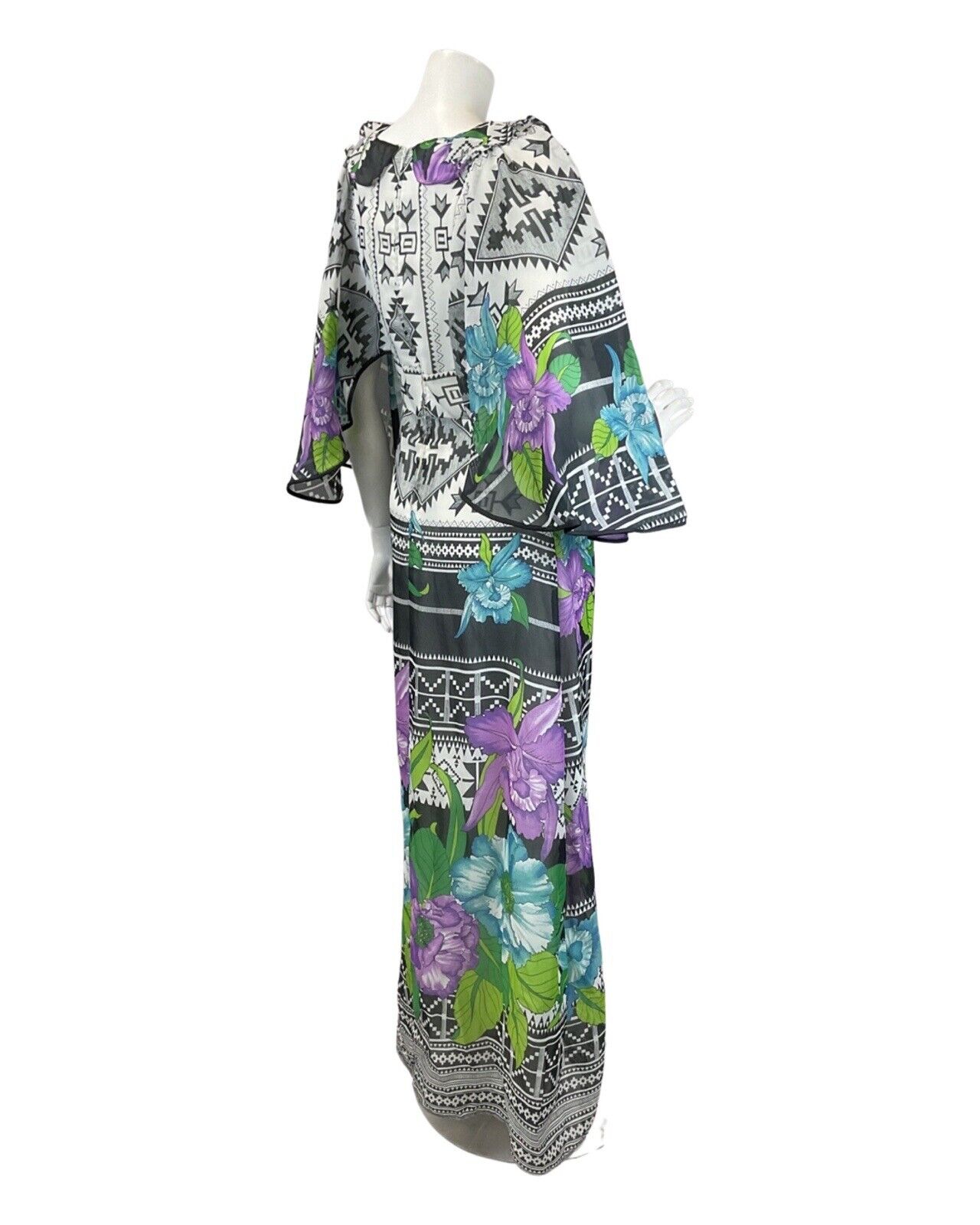 VTG 60s 70s WHITE BLACK PURPLE BLUE GEOMETRIC AZTEC FLORAL CAPED MAXI DRESS 10