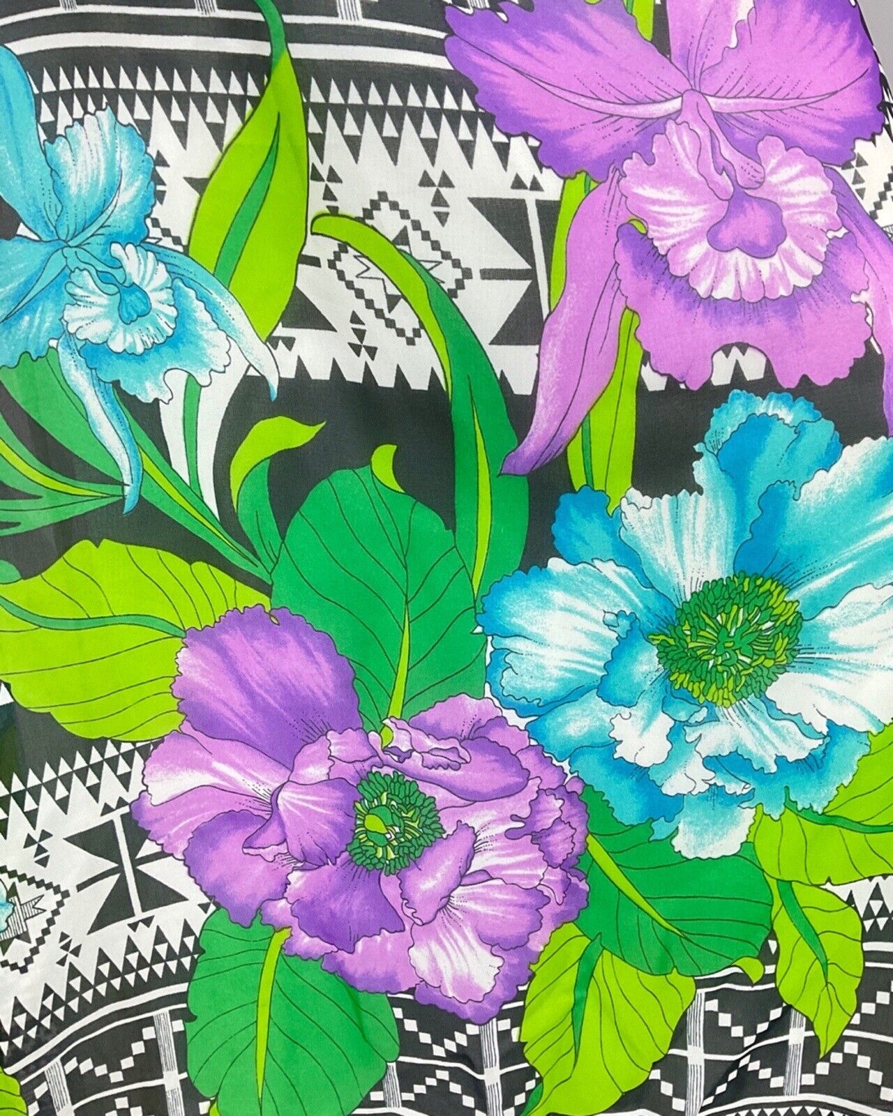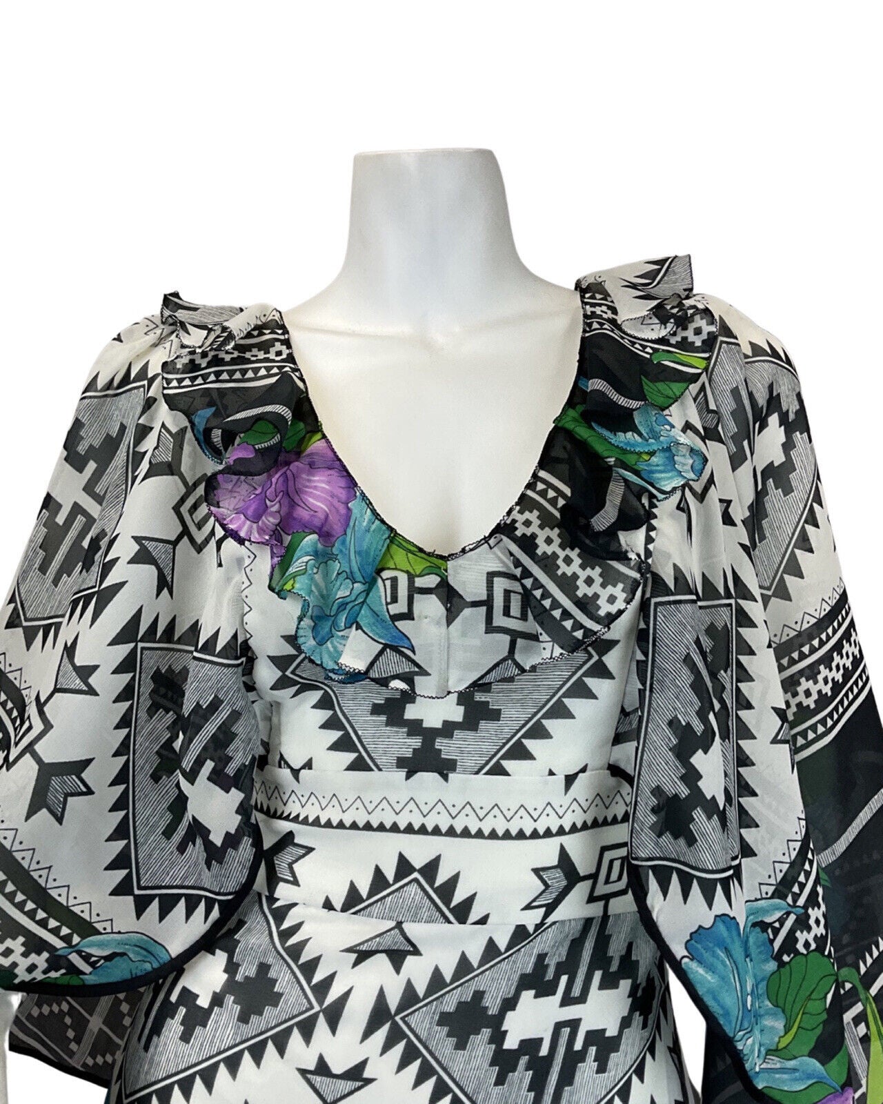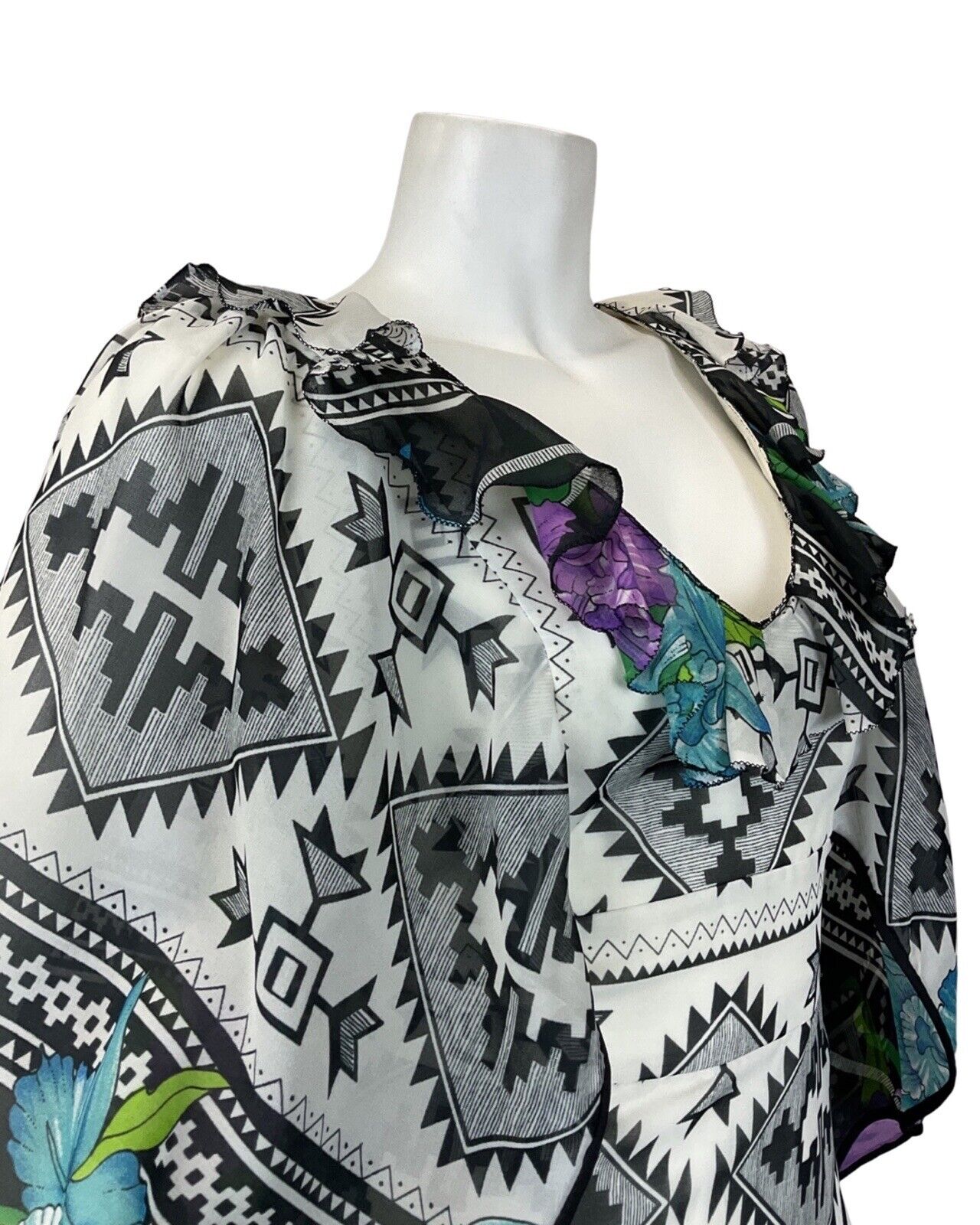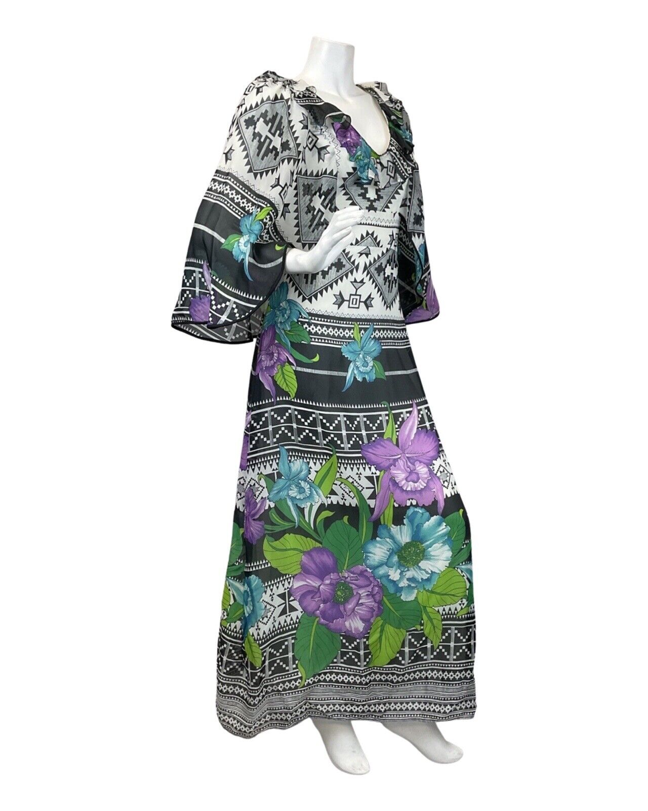 VTG 60s 70s WHITE BLACK PURPLE BLUE GEOMETRIC AZTEC FLORAL CAPED MAXI DRESS 10