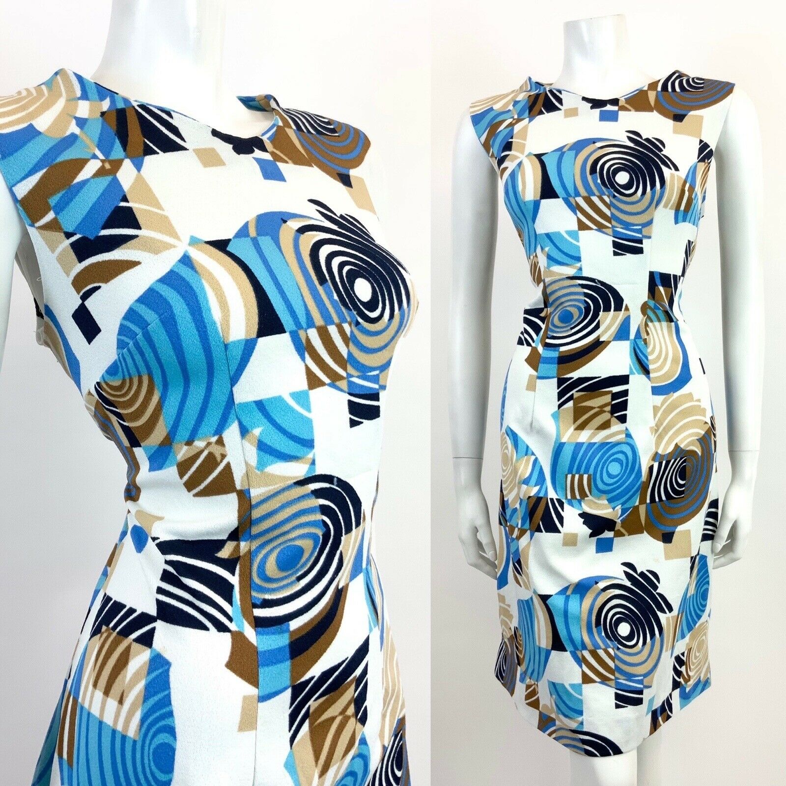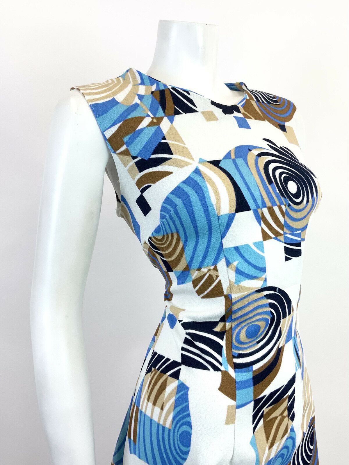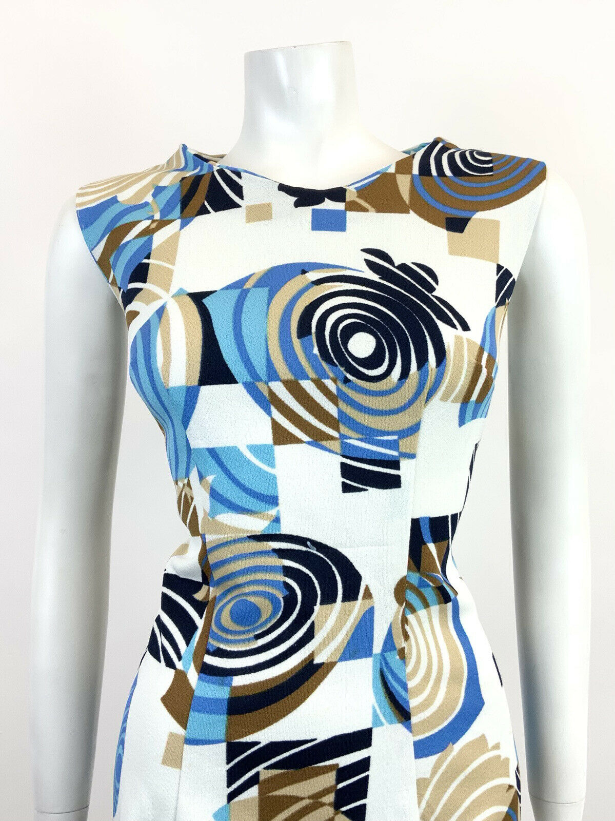 VTG 60s 70s WHITE BLUE BROWN GEOMETRIC PSYCHEDELIC SWIRL MOD SLEEVELESS DRESS 16