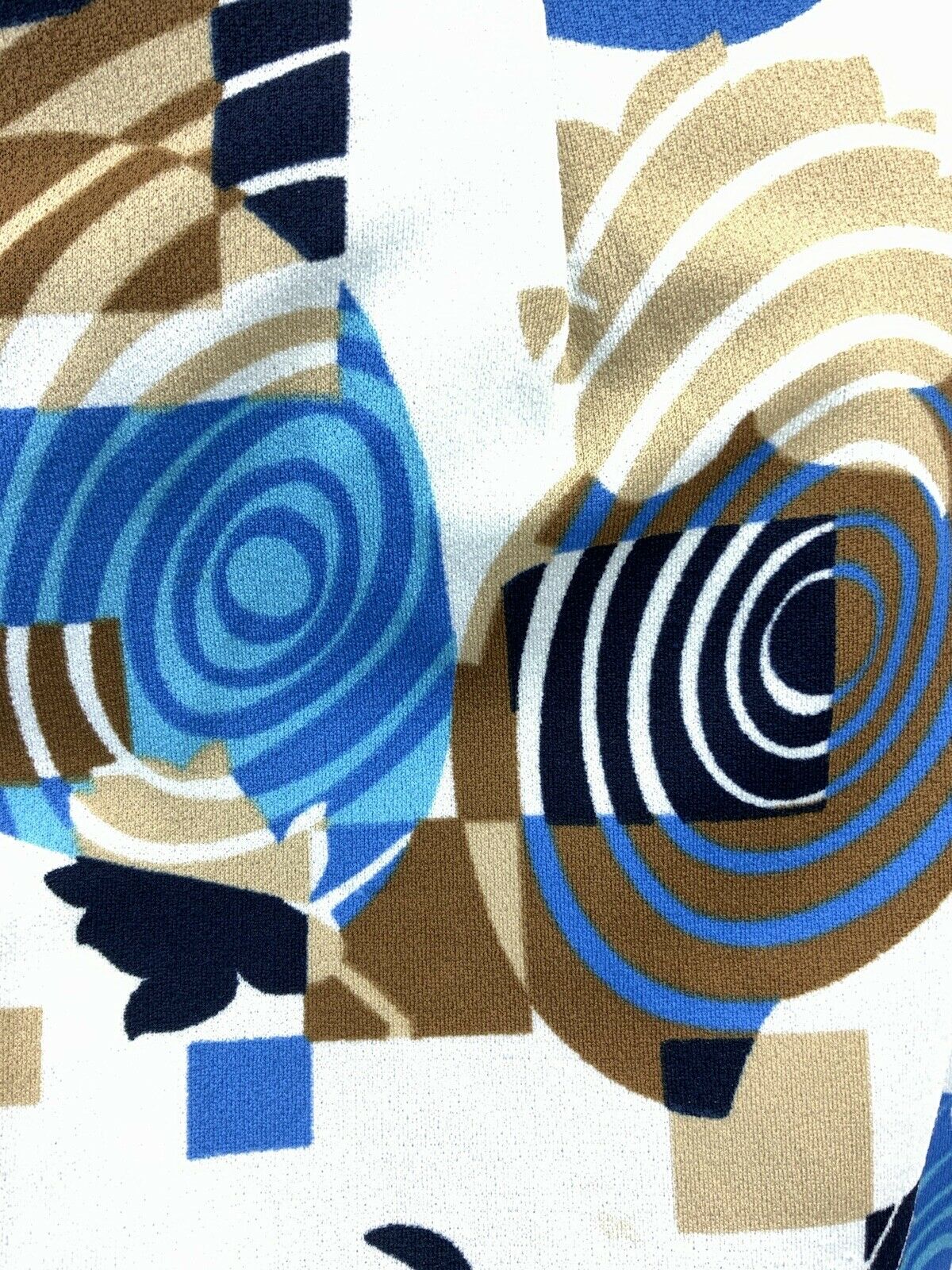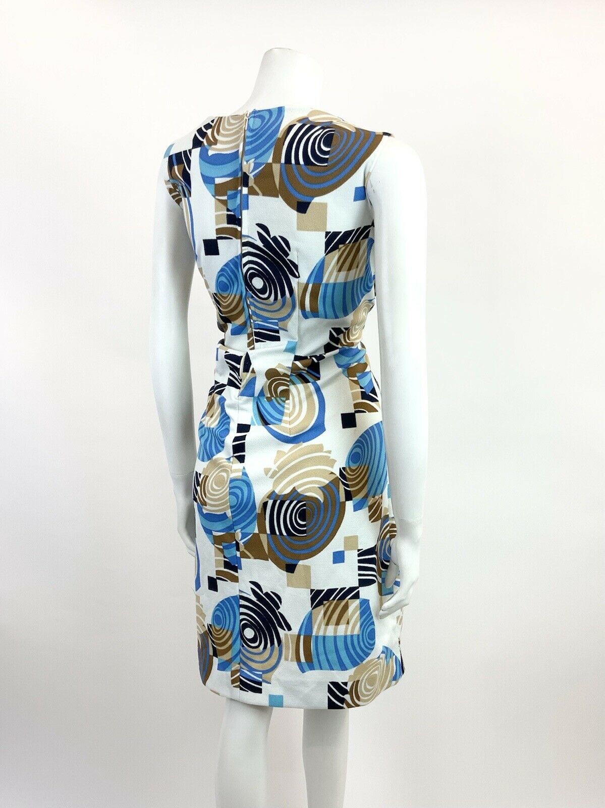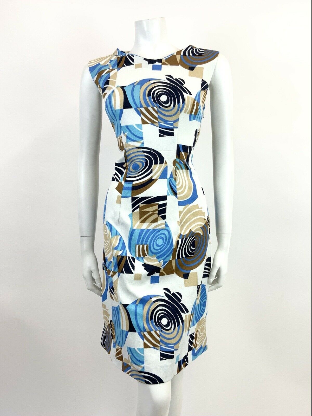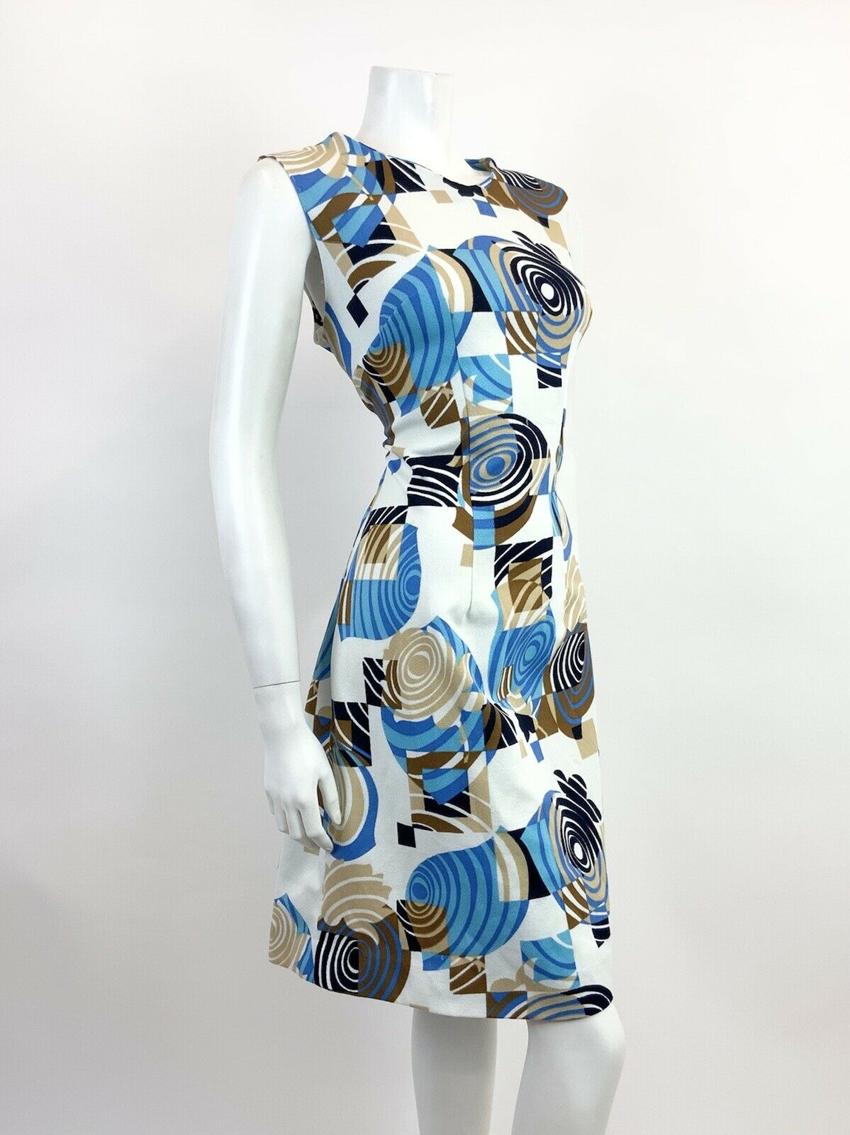 VTG 60s 70s WHITE BLUE BROWN GEOMETRIC PSYCHEDELIC SWIRL MOD SLEEVELESS DRESS 16