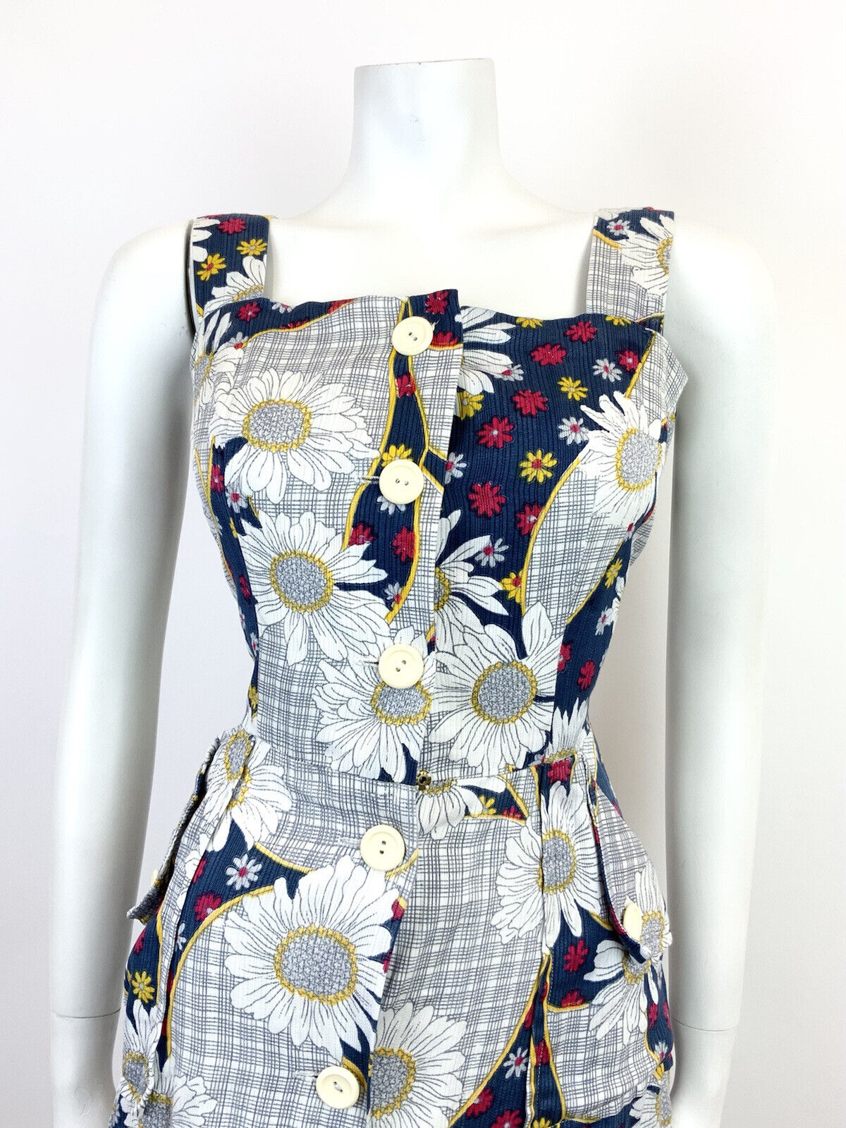 VTG 60s 70s WHITE BLUE RED FLORAL DAISY GRID CHECKED PINAFORE APRON SUNDRESS 10