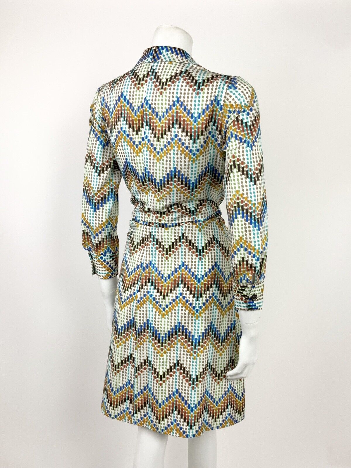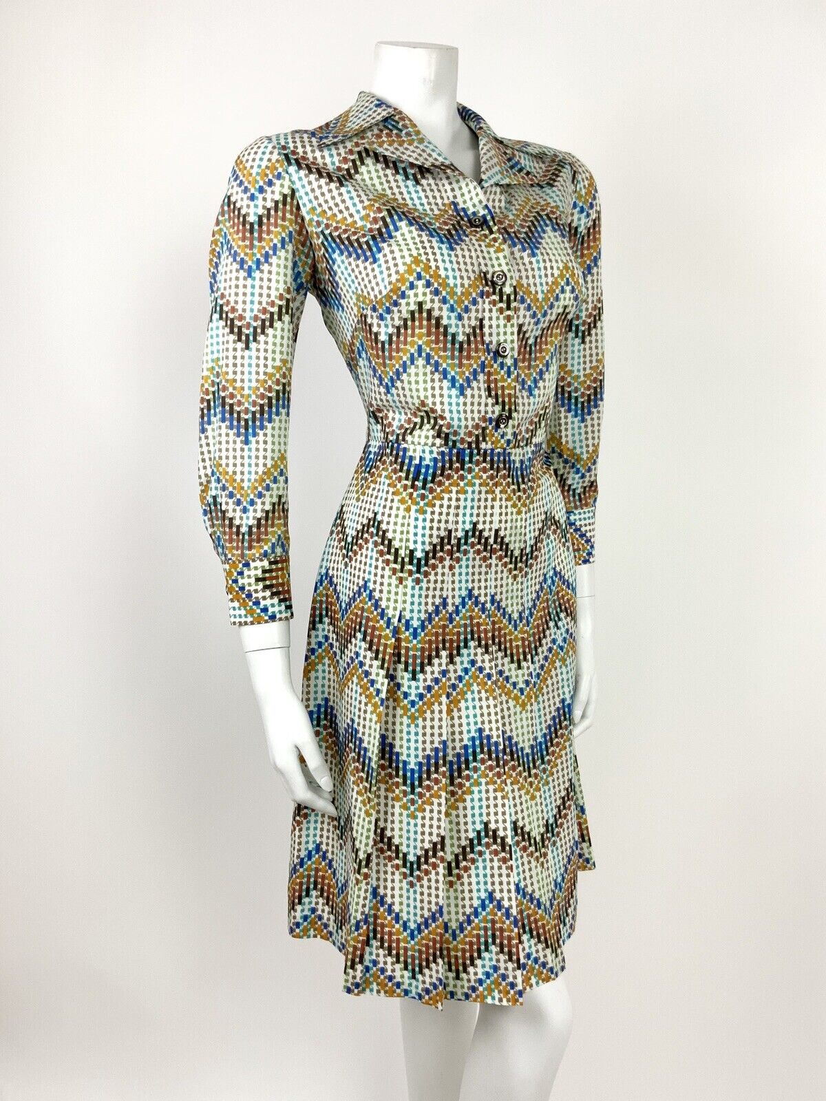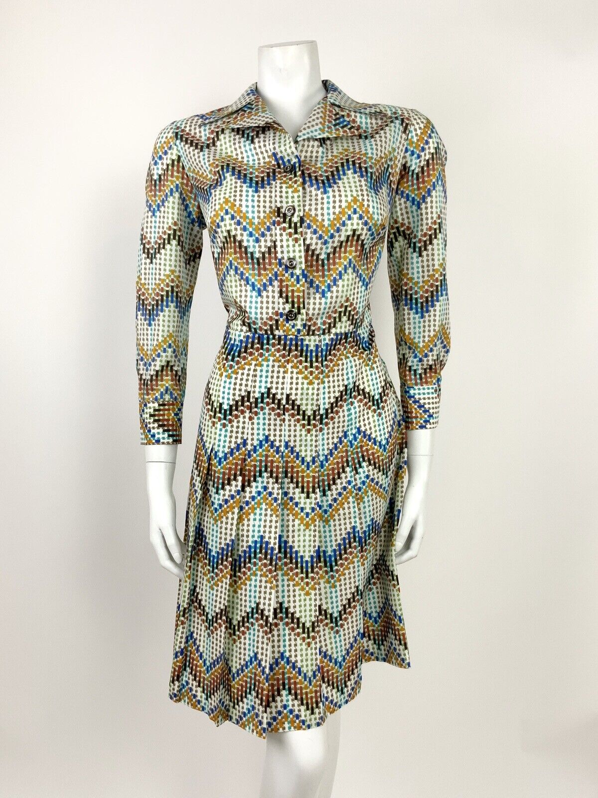 VTG 60s 70s WHITE BROWN BLUE YELLOW CHEVRON GEOMETRIC PLEATED SHIRT DRESS 12 14