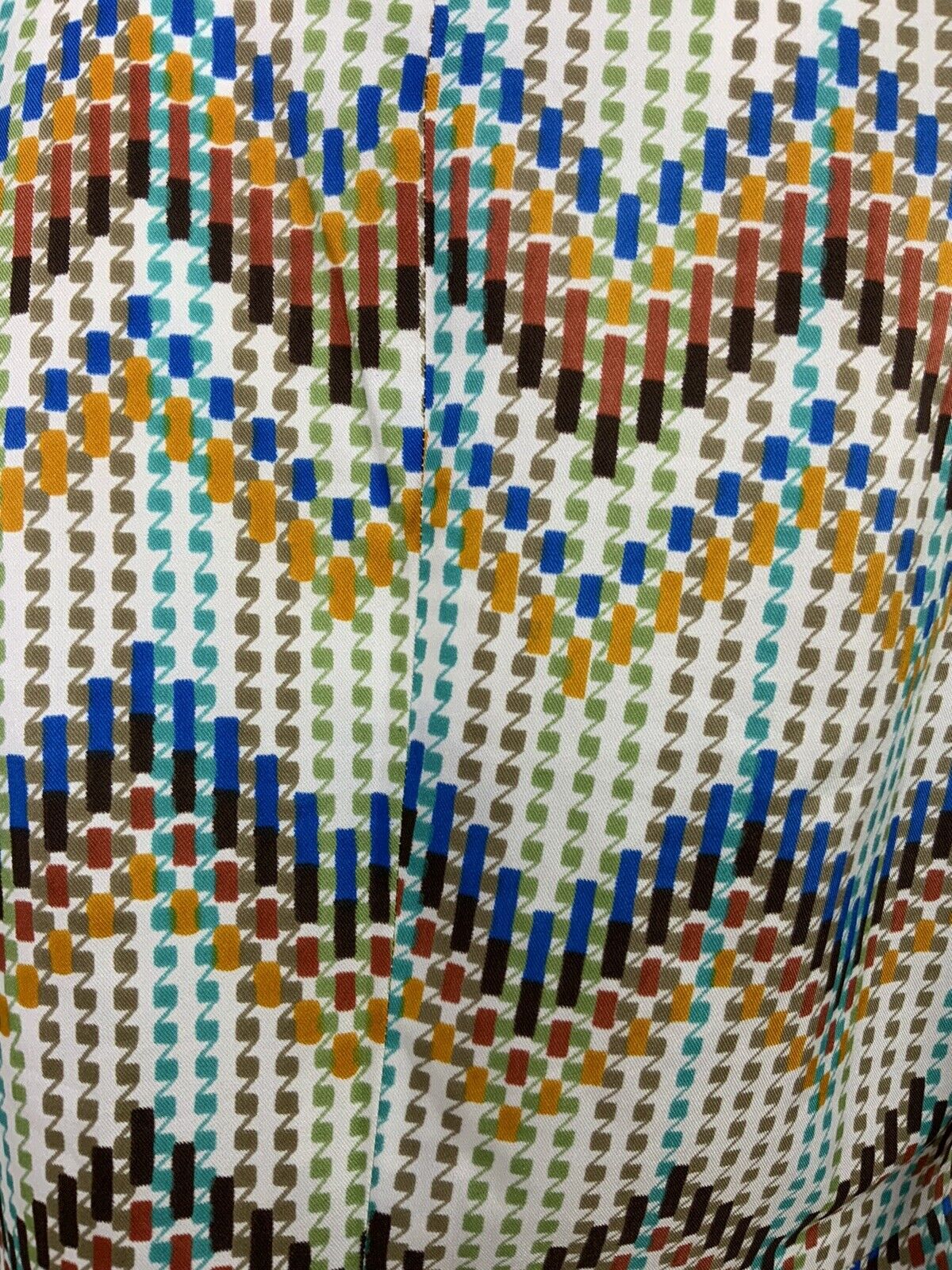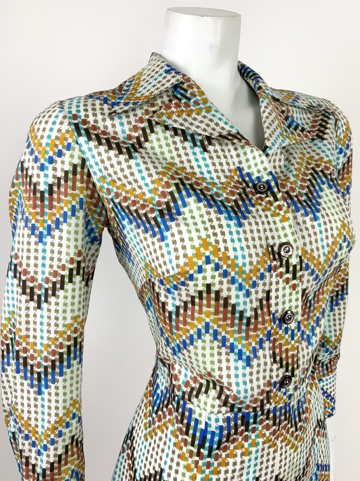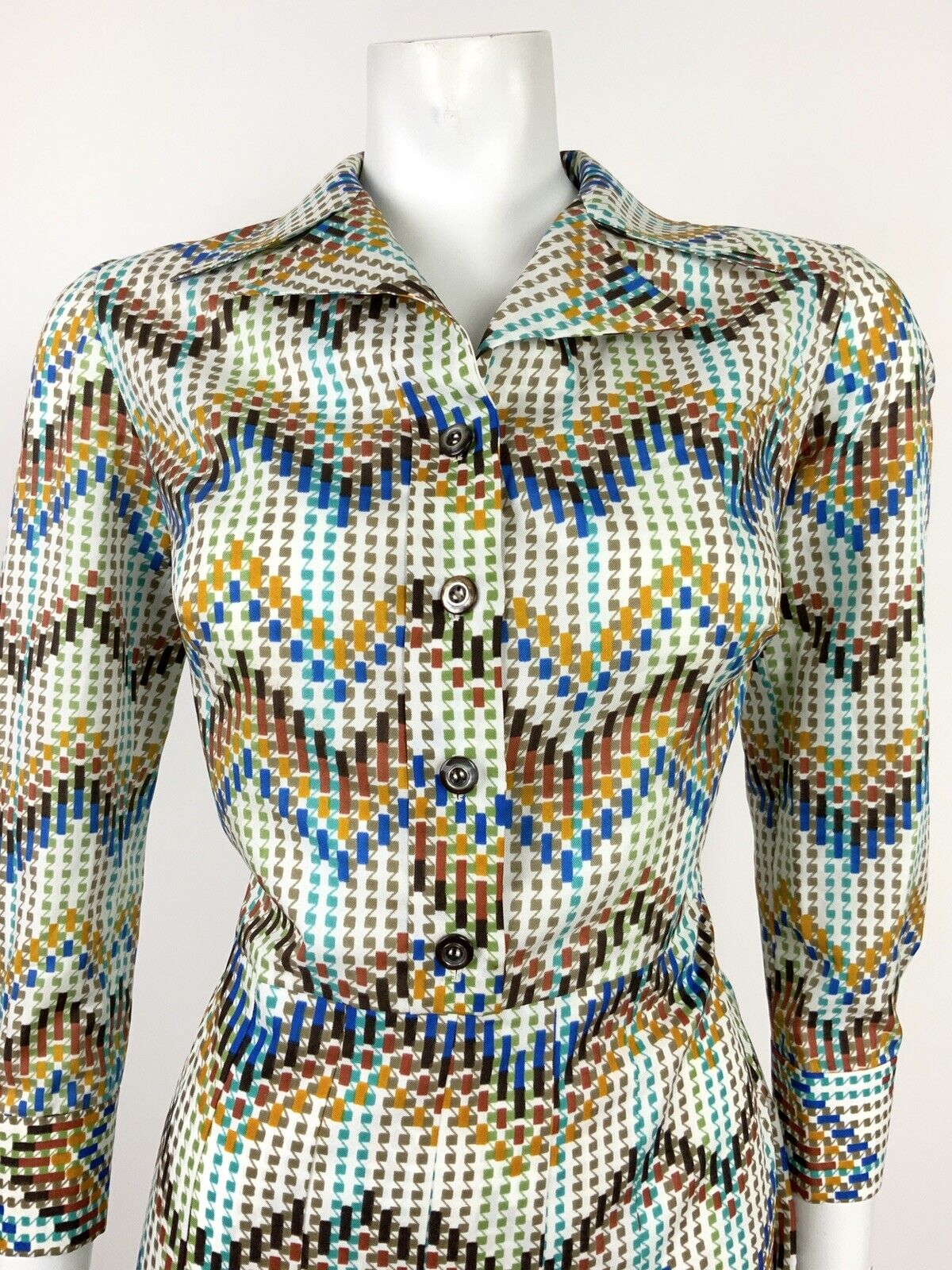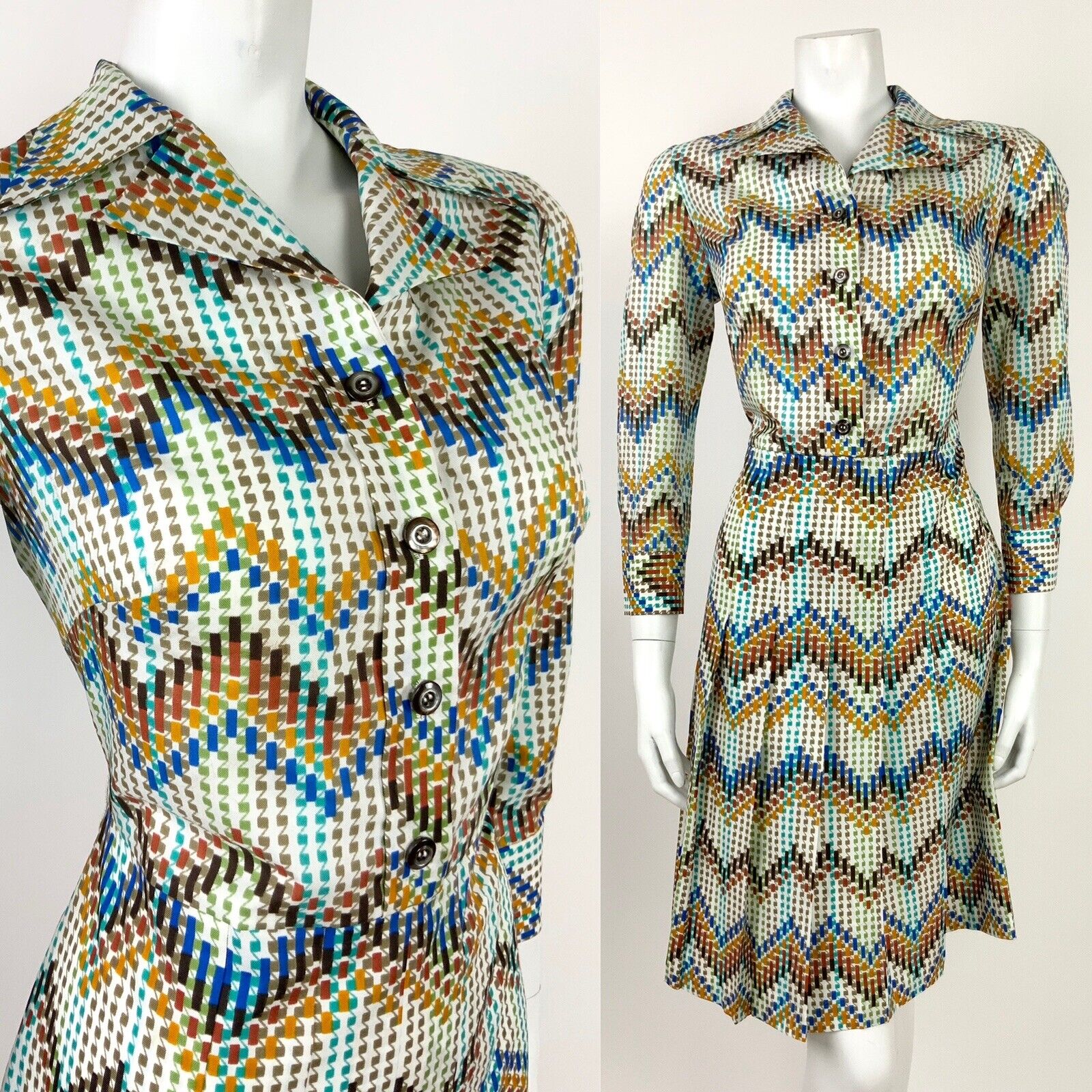 VTG 60s 70s WHITE BROWN BLUE YELLOW CHEVRON GEOMETRIC PLEATED SHIRT DRESS 12 14