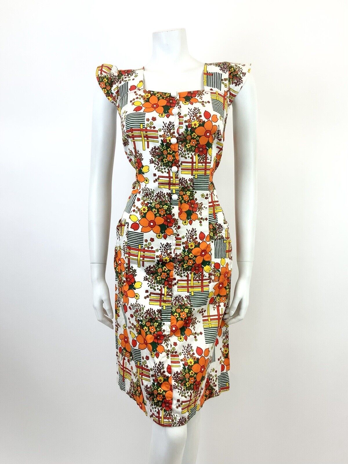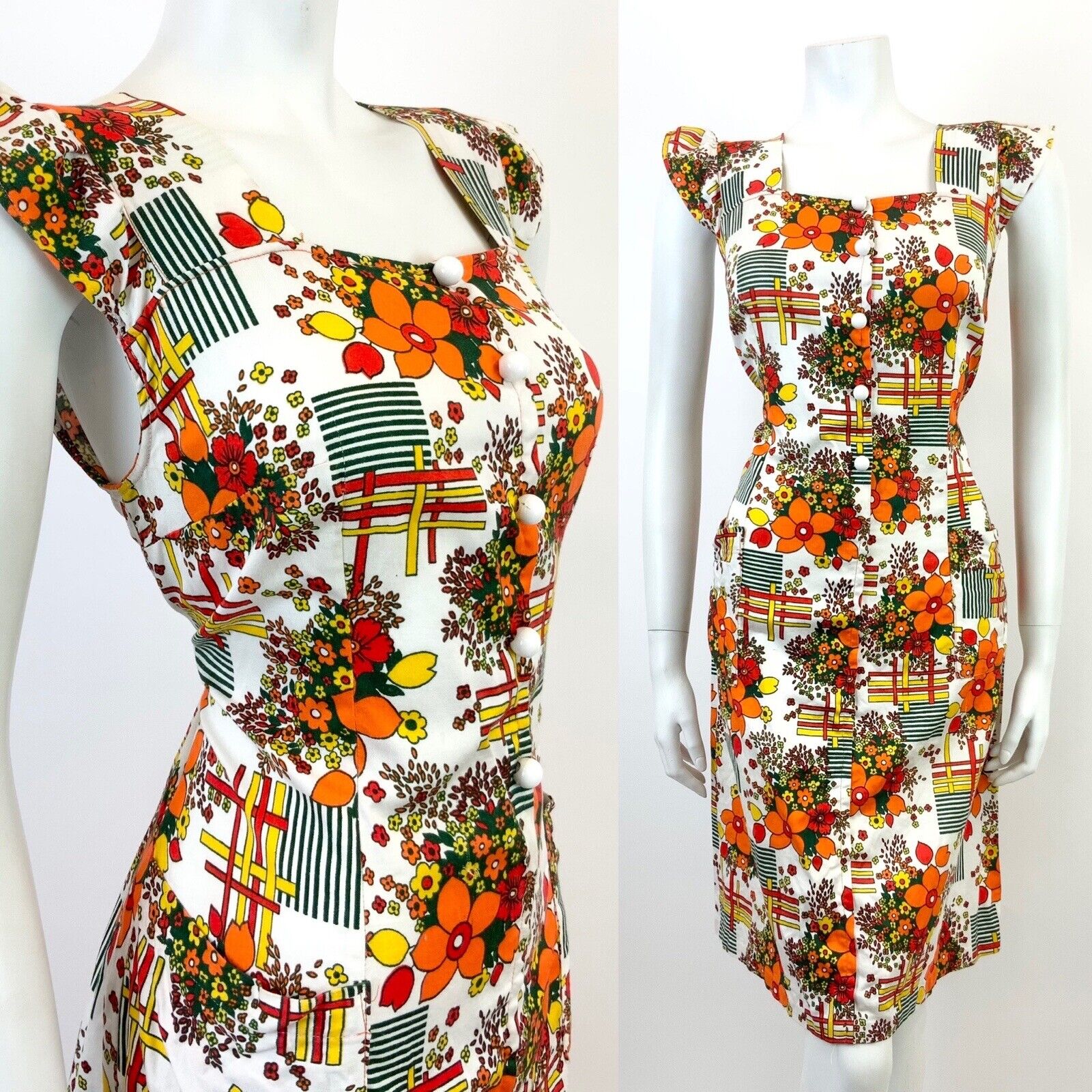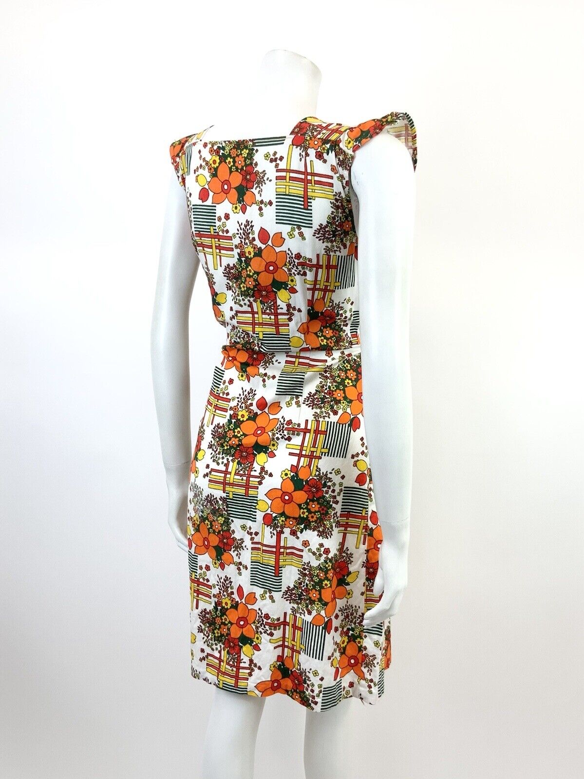 VTG 60s 70s WHITE ORANGE RED GREEN GEOMETRIC FLORAL MOD RUFFLE SHIFT DRESS 12 14