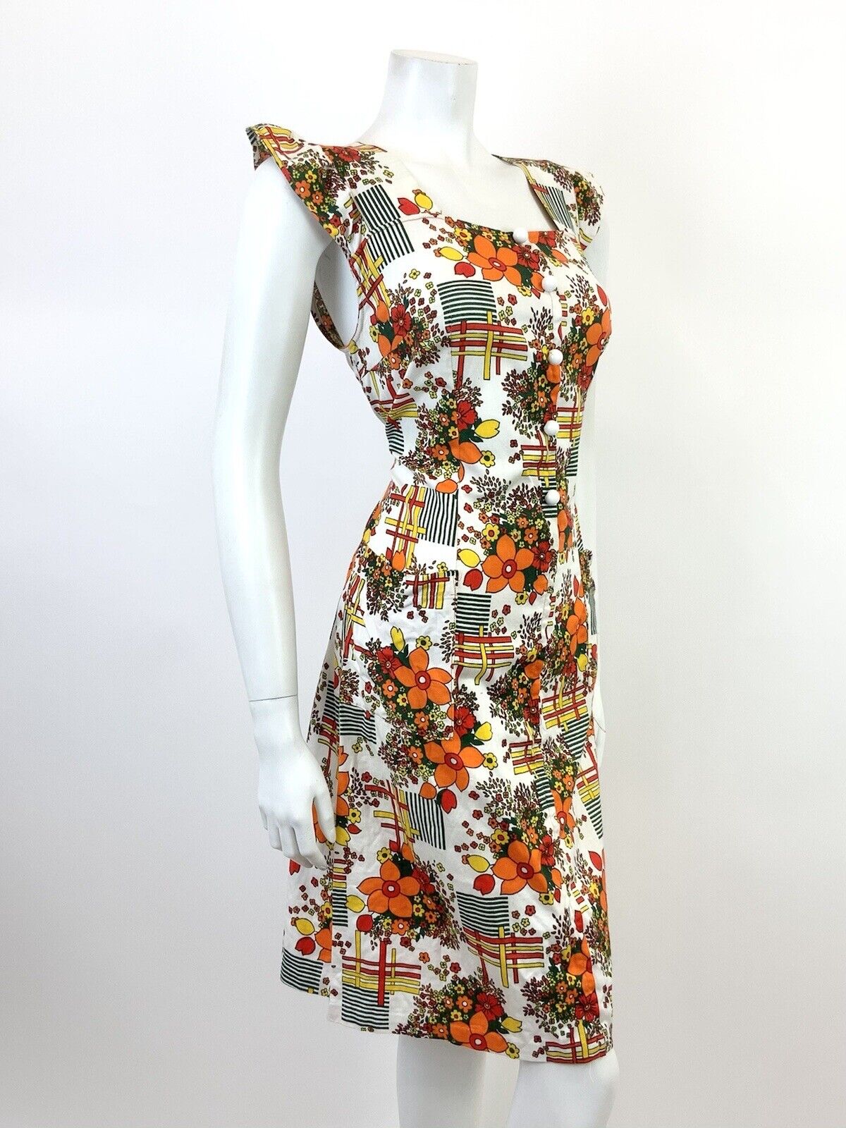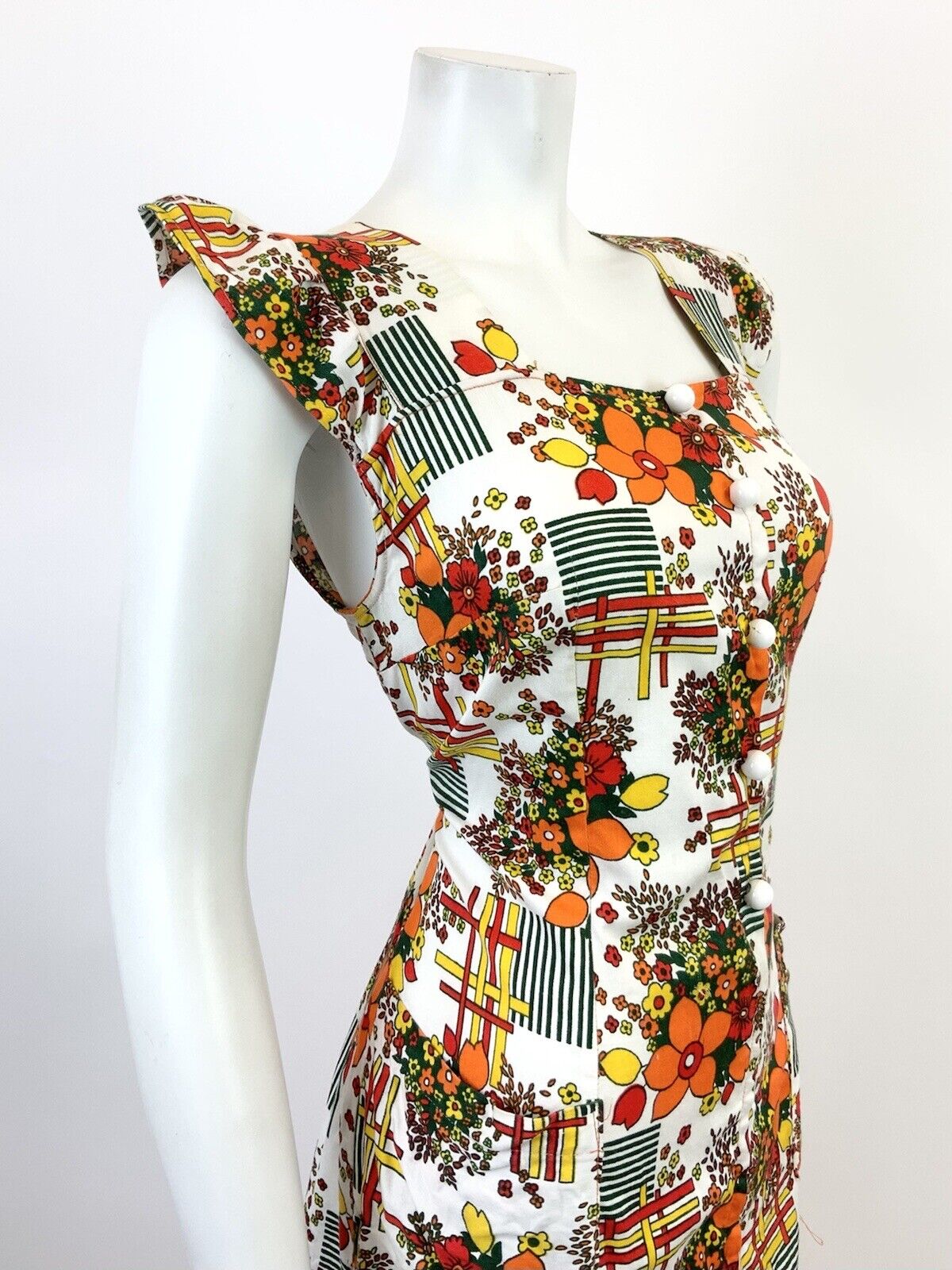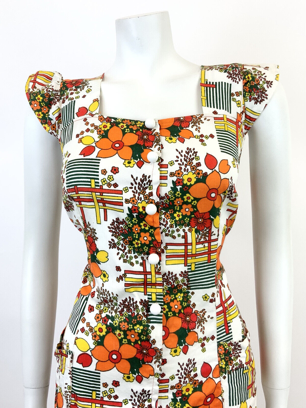 VTG 60s 70s WHITE ORANGE RED GREEN GEOMETRIC FLORAL MOD RUFFLE SHIFT DRESS 12 14