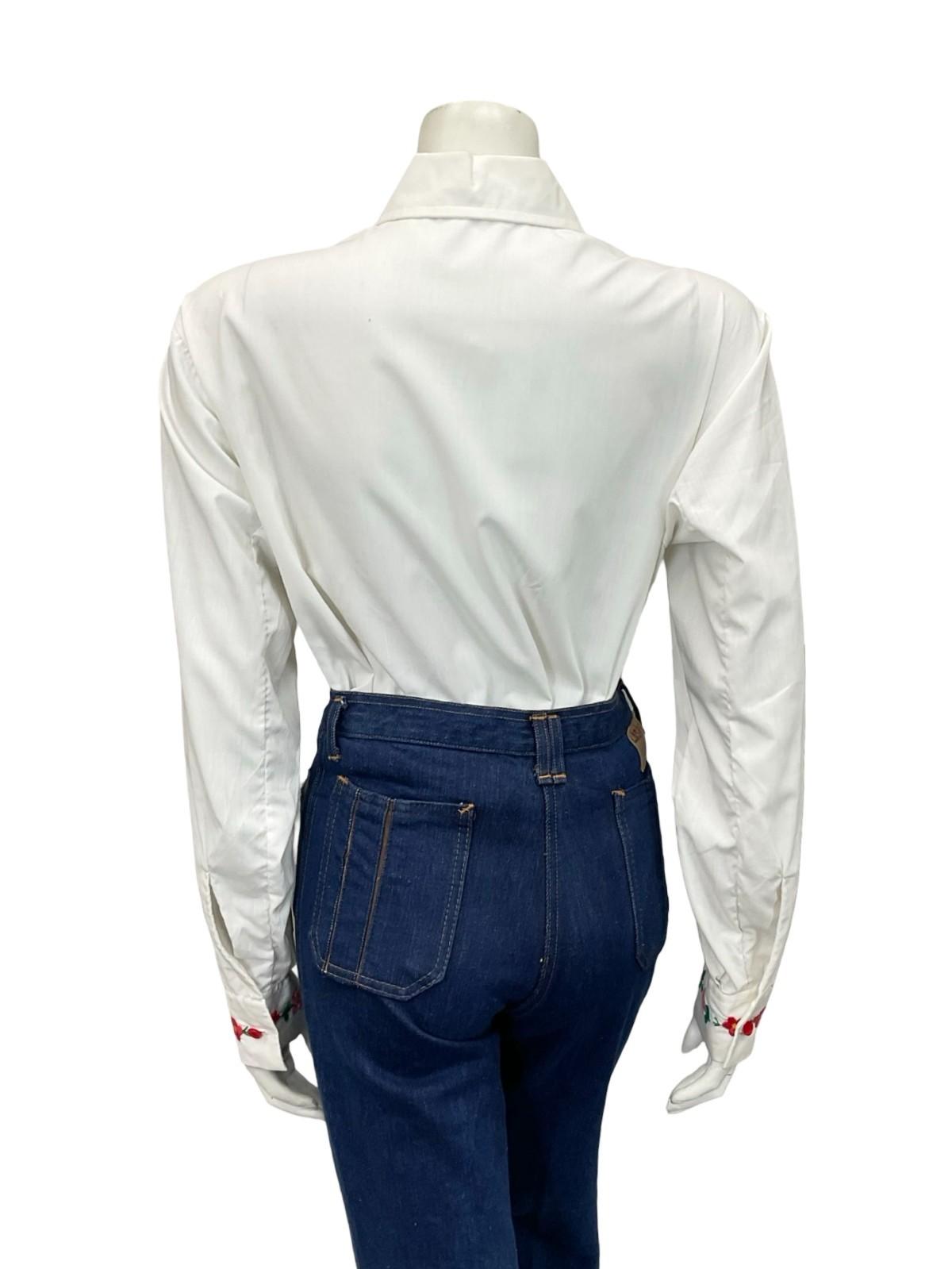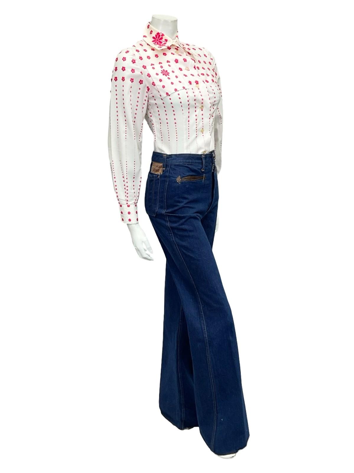 This is a cute 60s 70s long sleeve shirt with a dagger collar and pocket on the bust with a depth of 4". This shirt feels to be made of a synthetic white material printed with op art pink flowers. This shirt has 6 beige clear buttons down the front, with one on either cuff. Please note that fabric used to thicken the collar has a slightly beige colour to it which can be seen on the photographs.