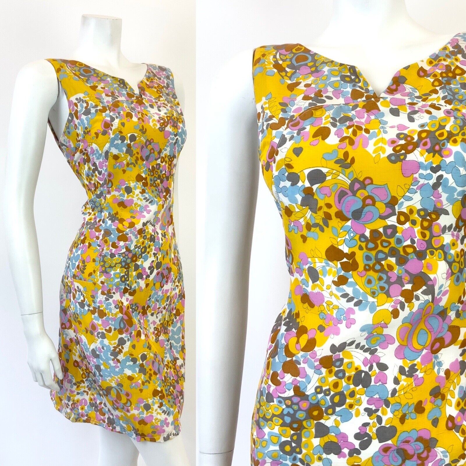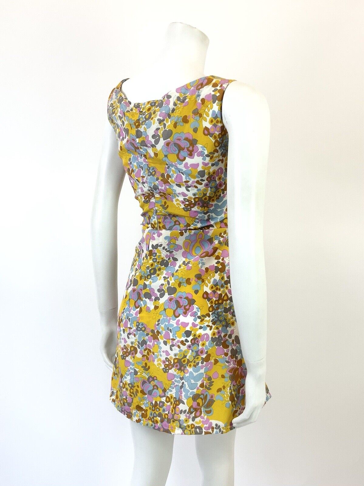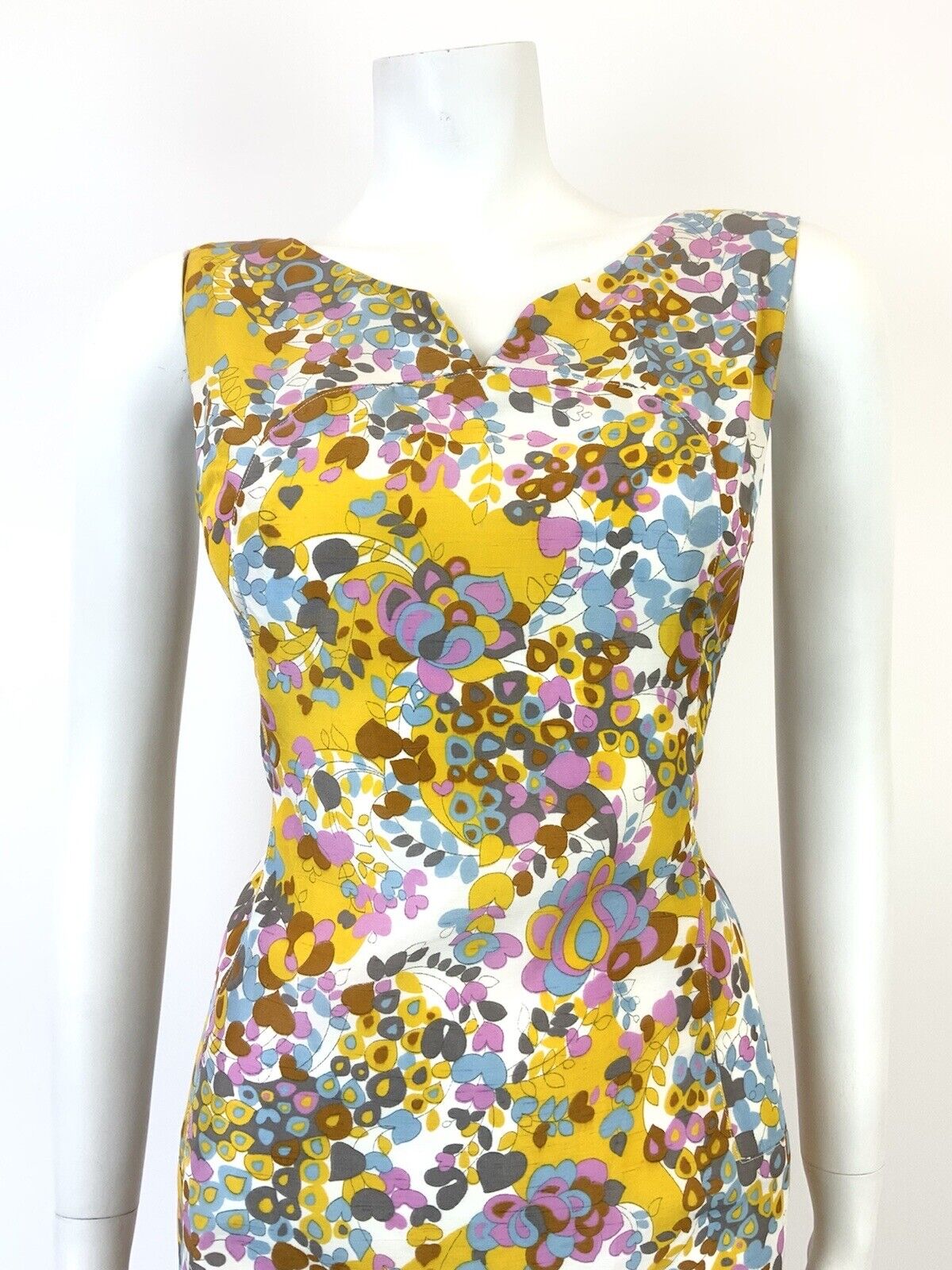VTG 60s 70s WHITE PINK YELLOW BLUE PSYCHEDELIC FLORAL SLEEVELESS MOD DRESS 12 14